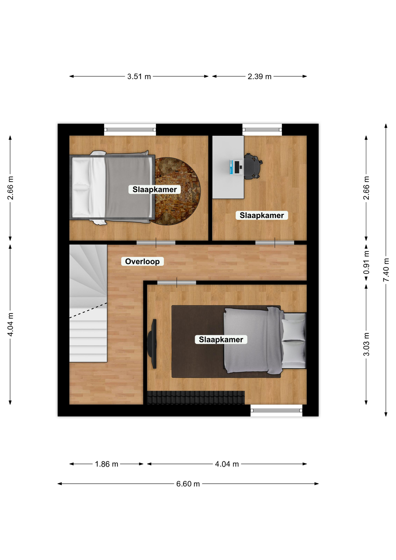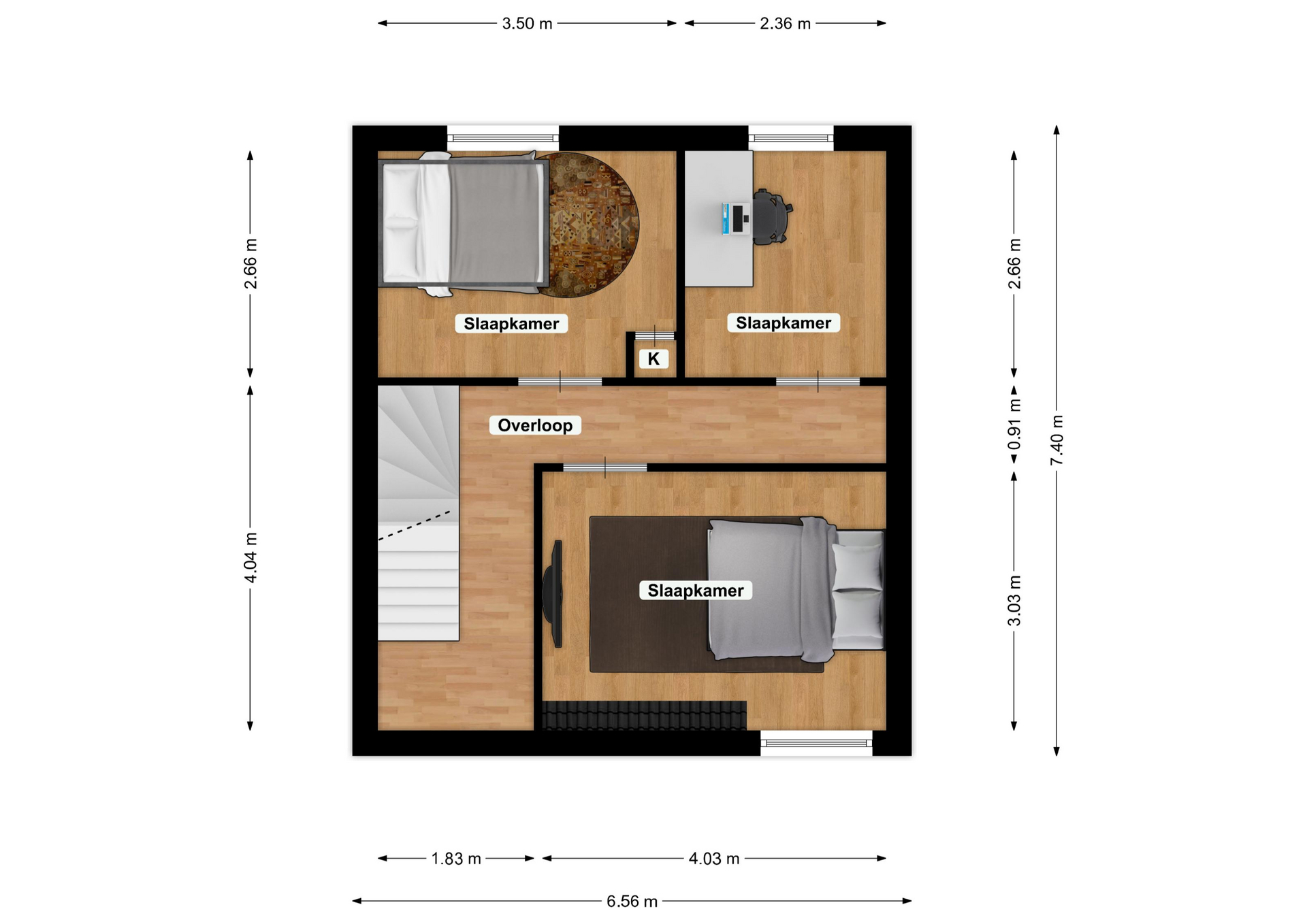 De overloop biedt toegang tot drie ruime slaapkamers. Alle kamers zijn voorzien van moderne laminaatvloeren en strak afgewerkte wanden. De slaapkamers zijn respectievelijk groot: