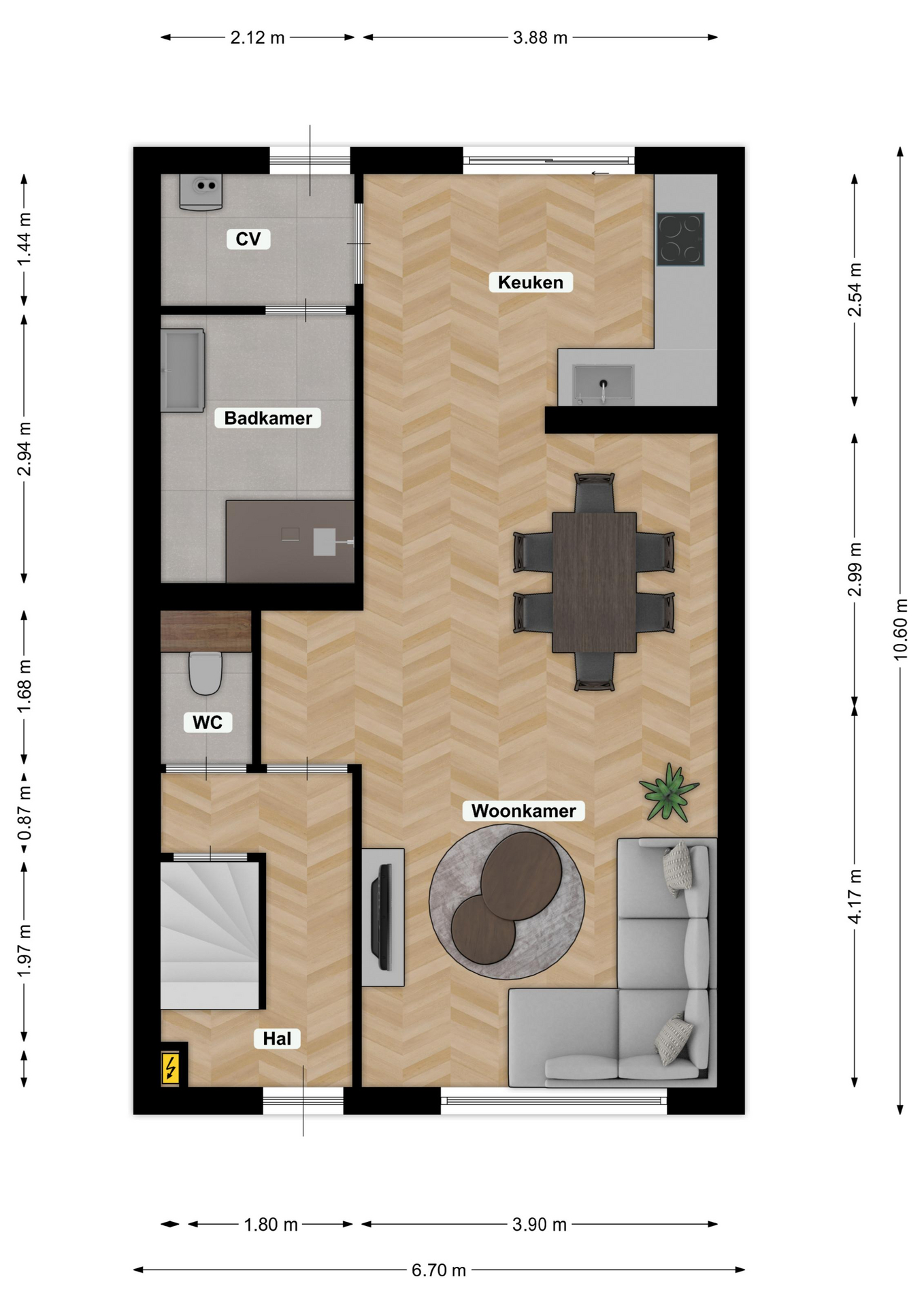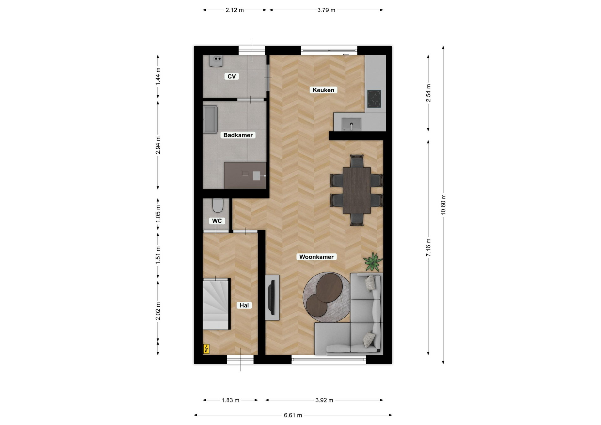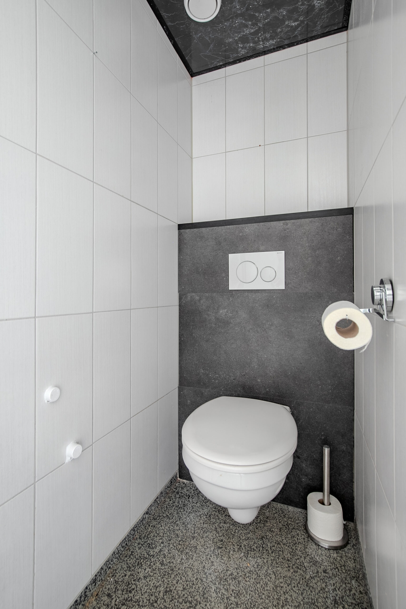 Via de onderhoudsvrije voortuin bereikt u de entree van de woning. De ontvangsthal is voorzien van een vernieuwde meterkast, garderobe, trapopgang naar de eerste verdieping en een modern, geheel betegeld vrijhangend toilet.