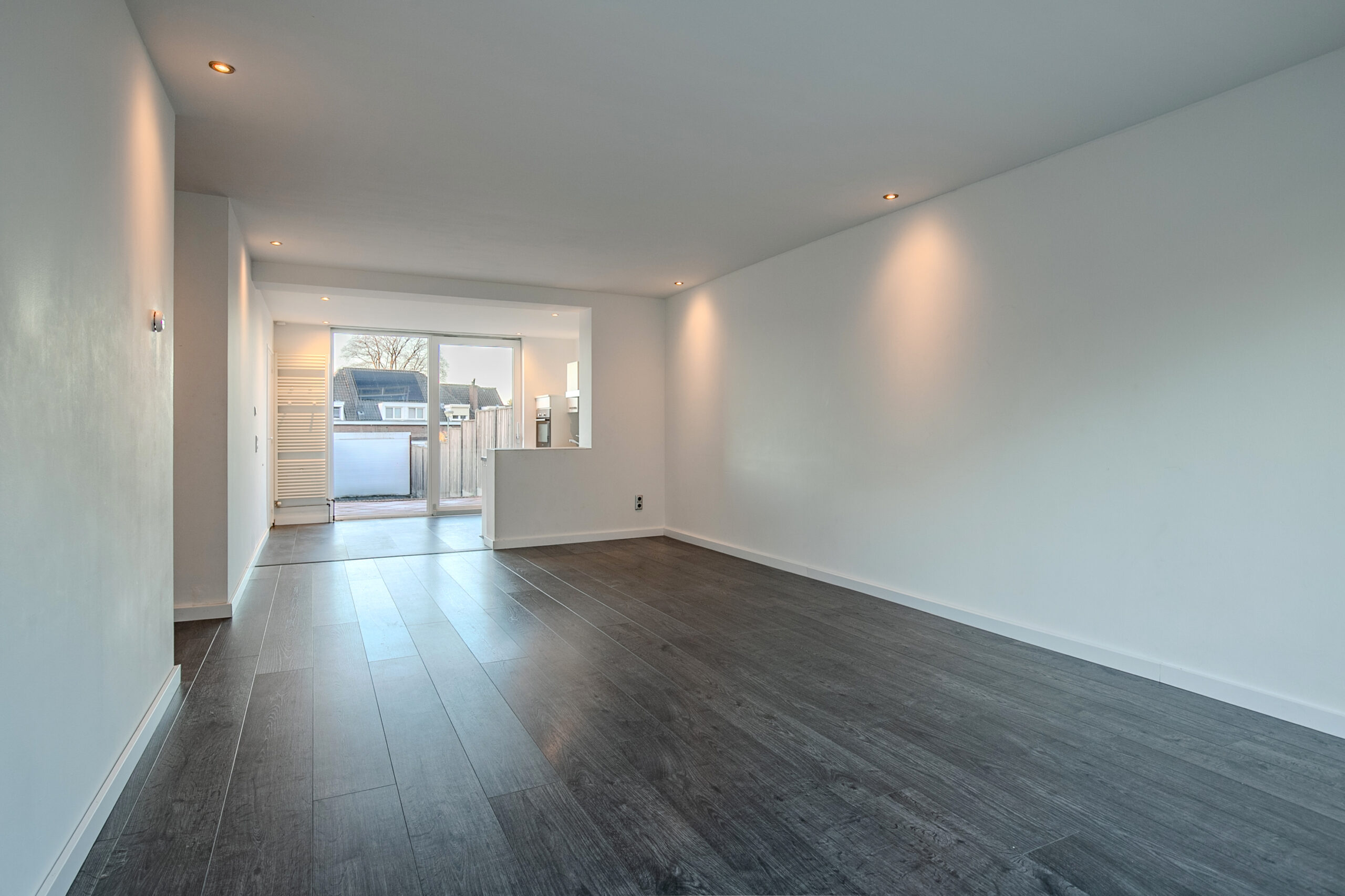 De ruime en lichte woonkamer is strak afgewerkt met een moderne laminaatvloer, glad gestuukte wanden en heeft een uitstekende lichtinval dankzij de grote raampartij aan de voorzijde.