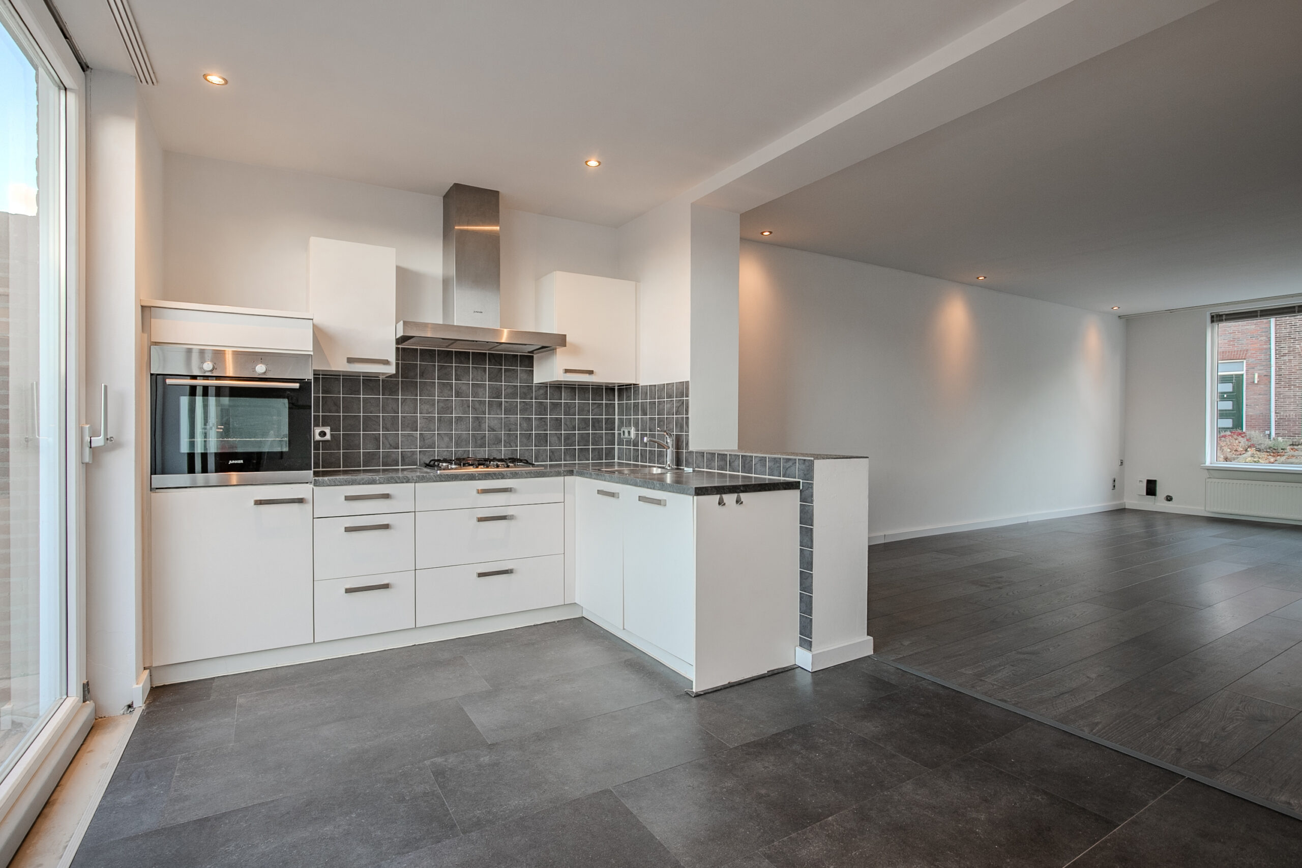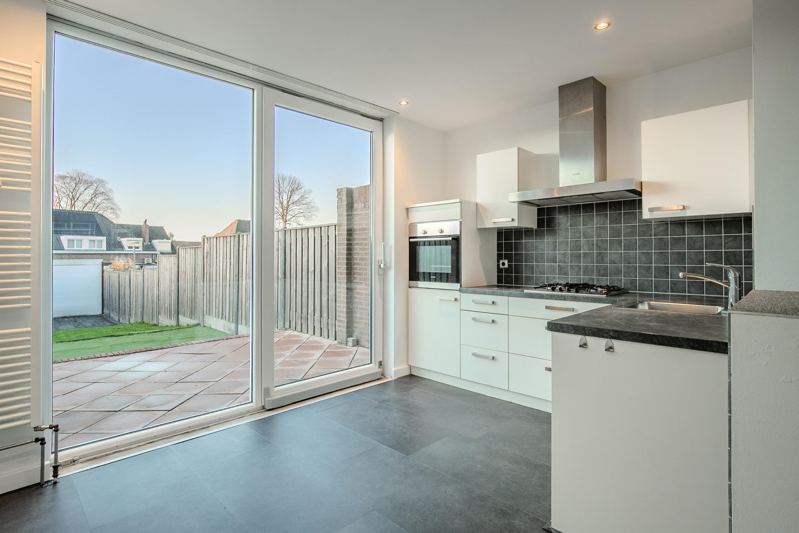 In de aanbouw bevindt zich de open keuken in hoekopstelling, voorzien van een witte keukeninstallatie en uitgerust met een oven, 4-pits gaskookplaat, afzuigkap en vaatwasser. Vanuit hier heeft men een directe open verbinding met de woonkamer en middels een royale schuifpui bereikt men de tuin.