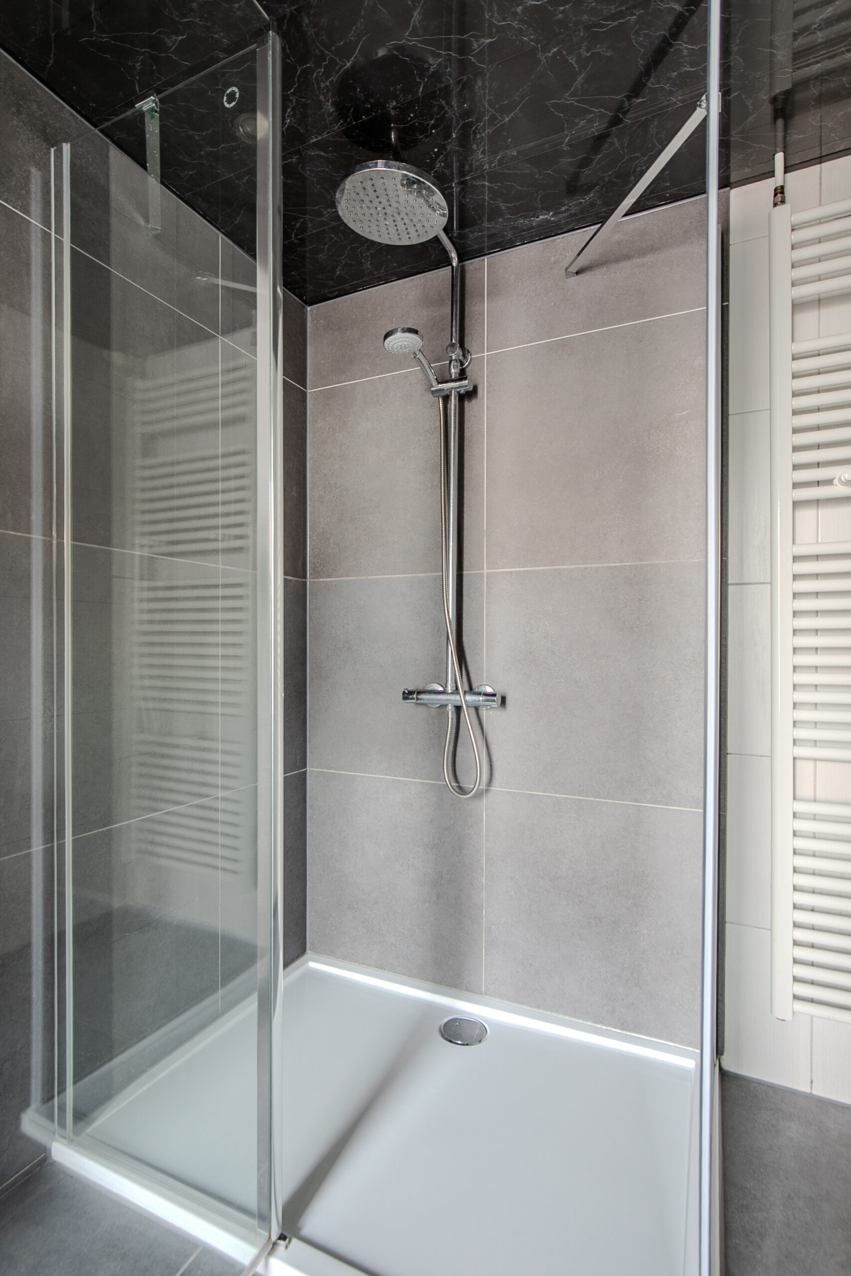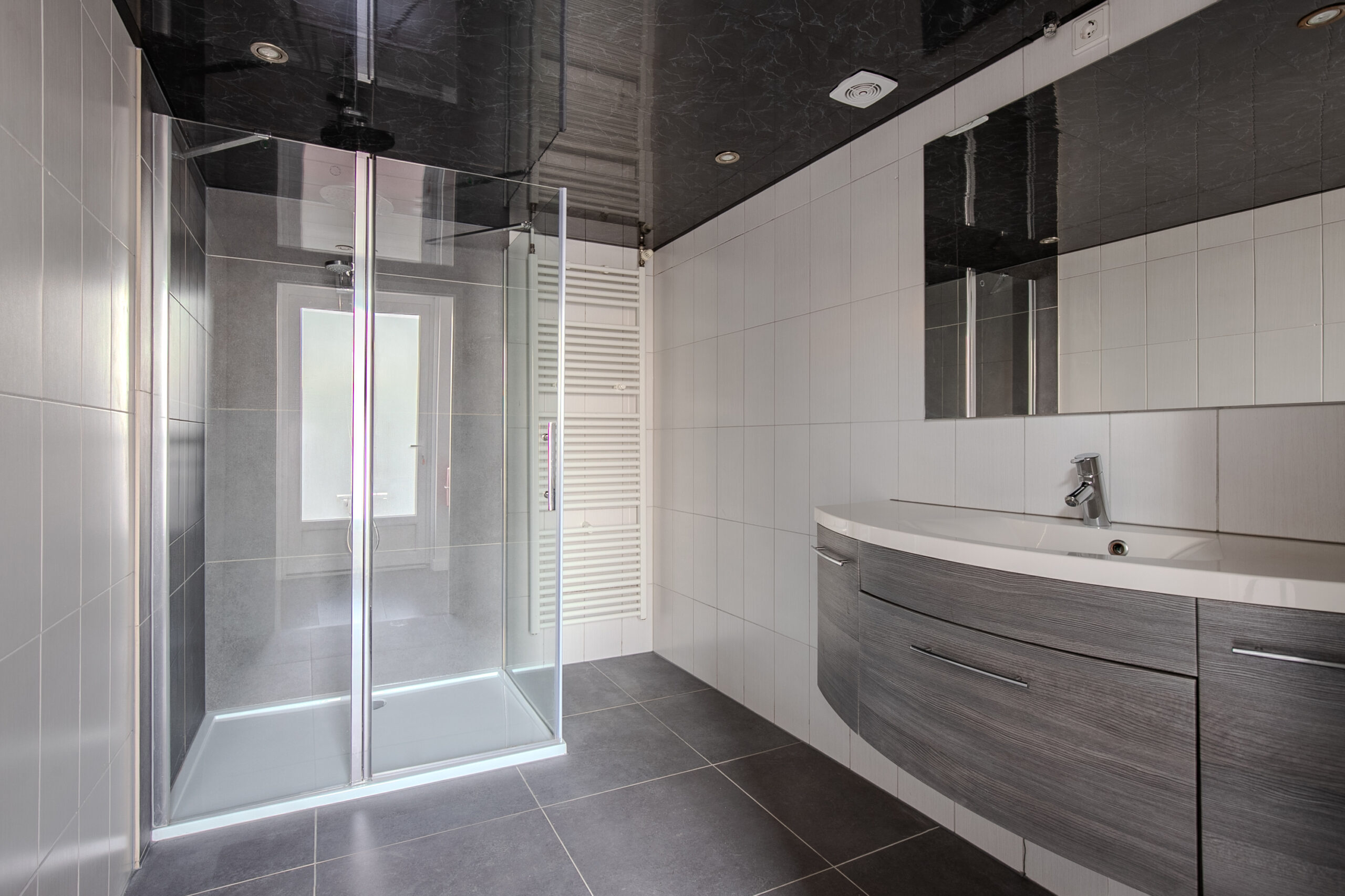 De badkamer is in 2025 grotendeels vernieuwd en uitgerust met een moderne inloopdouche met douchedeur, een brede wastafel met bijpassend meubel, handdoekradiator en mechanische ventilatie.