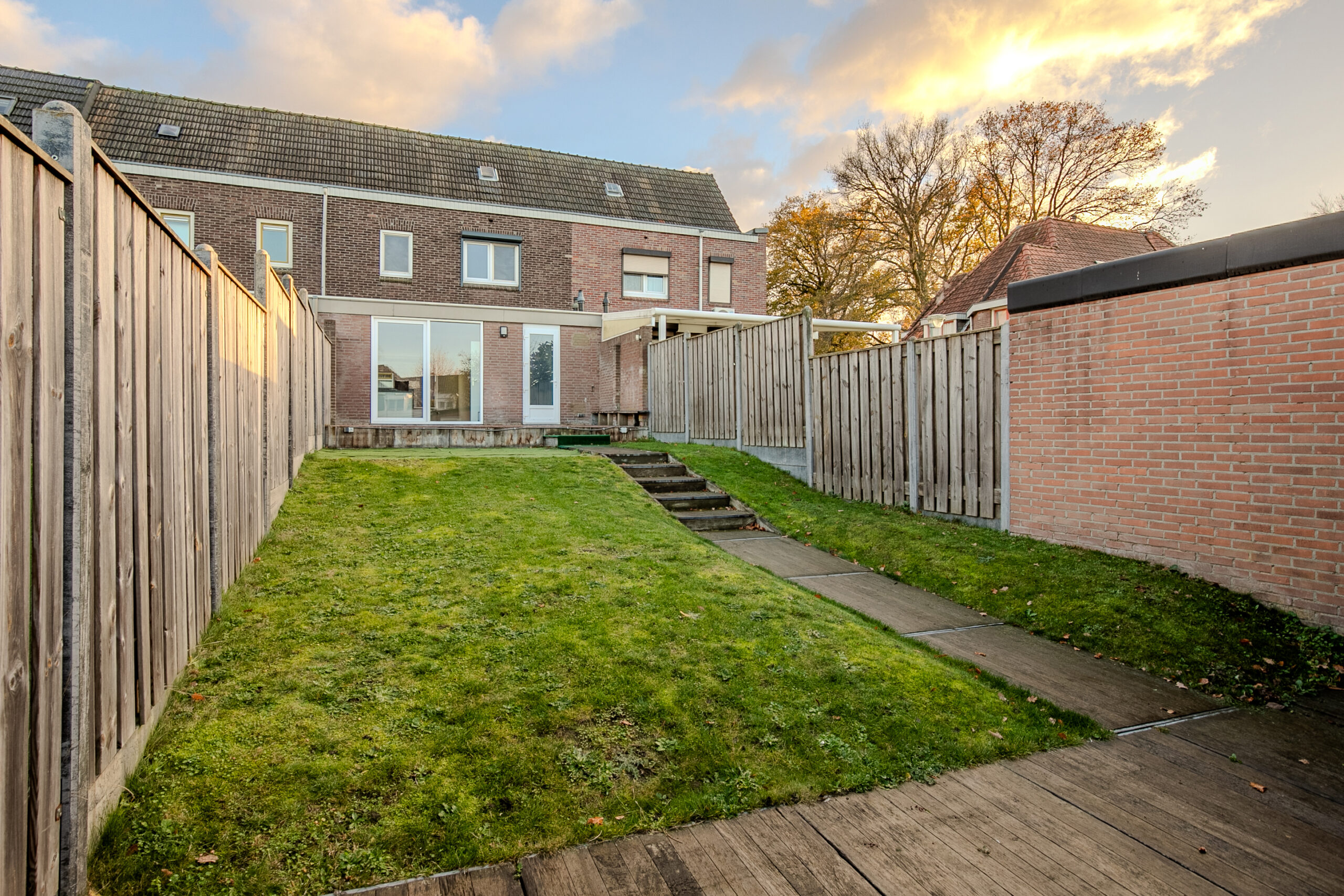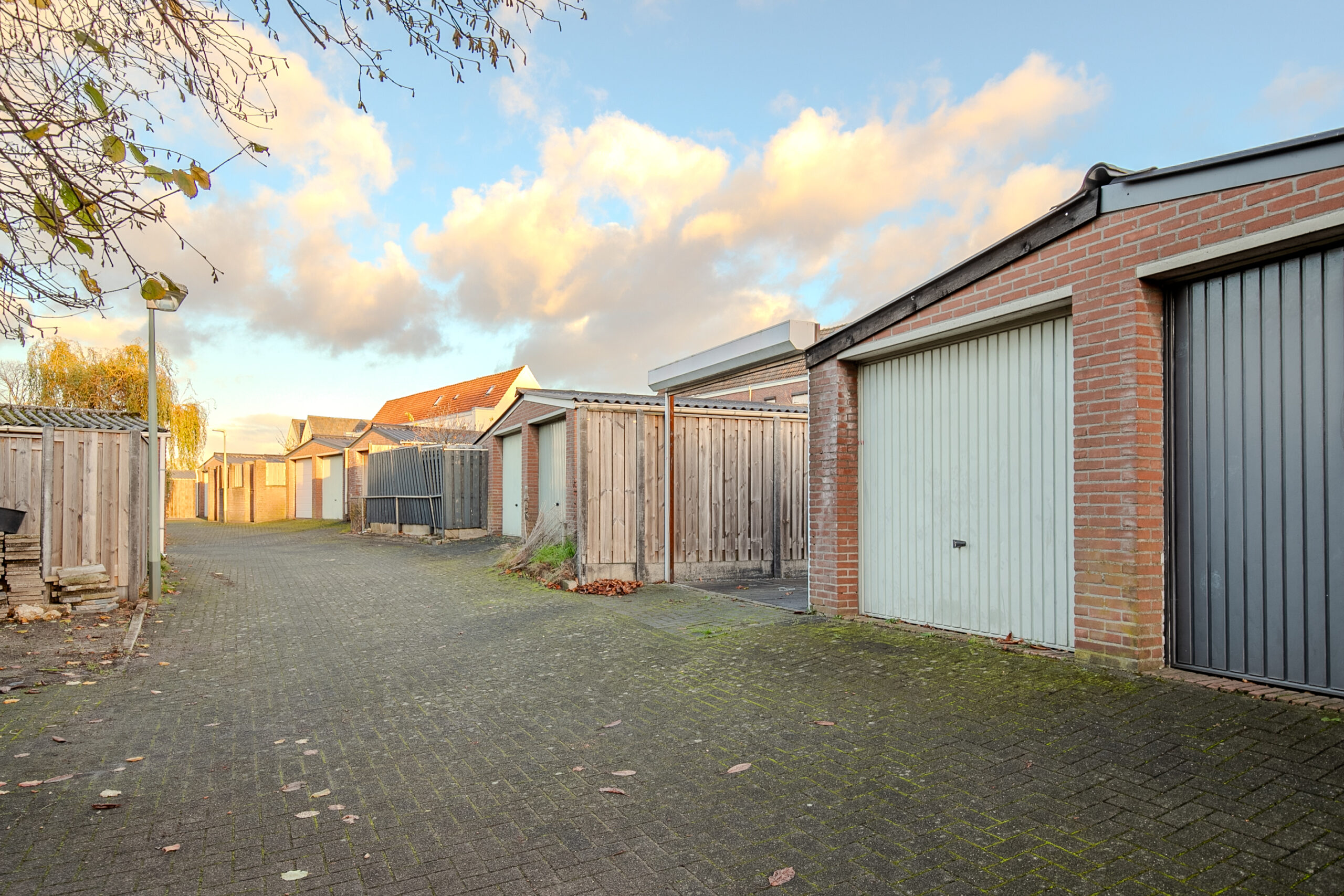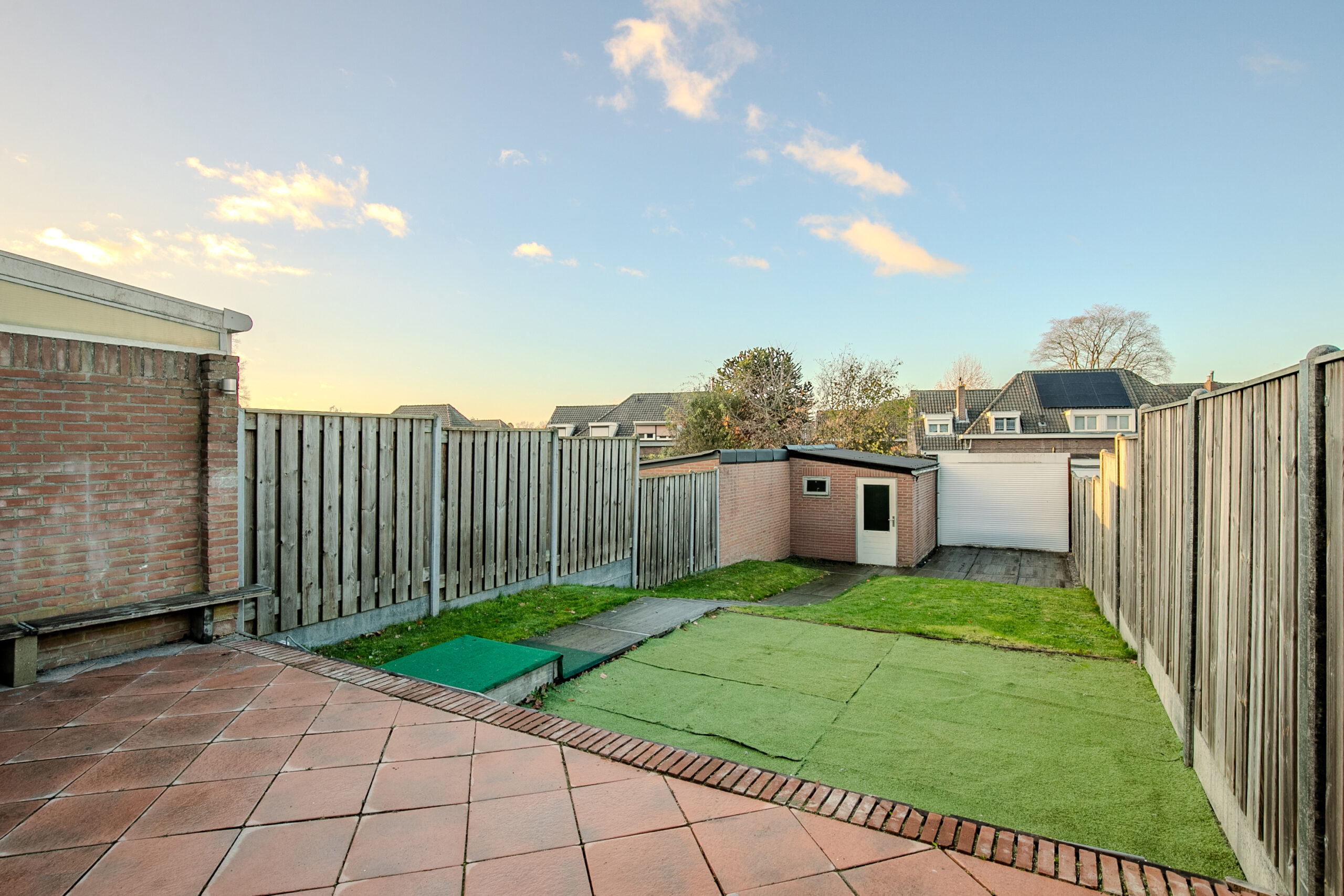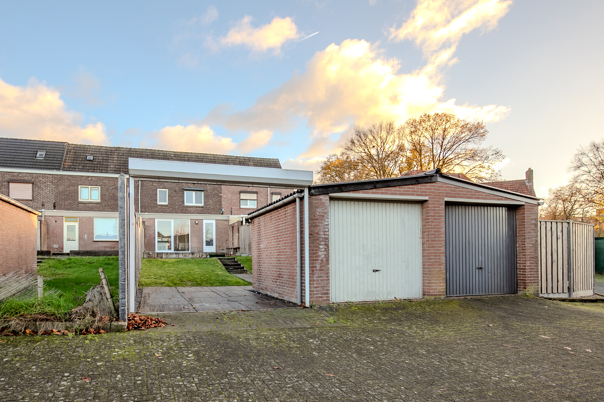 De geheel omsloten tuin is ca. 20 meter diep en beschikt over een beklinkerd terras, steens berging met rolpoort voor het plaatsen van motoren. Daarnaast beschikt nog over een elektrische bedienbare rolpoort waar men een auto op eigen terrein kan plaatsen. Ook een garage of carport behoren tot de eventuele mogelijkheden.