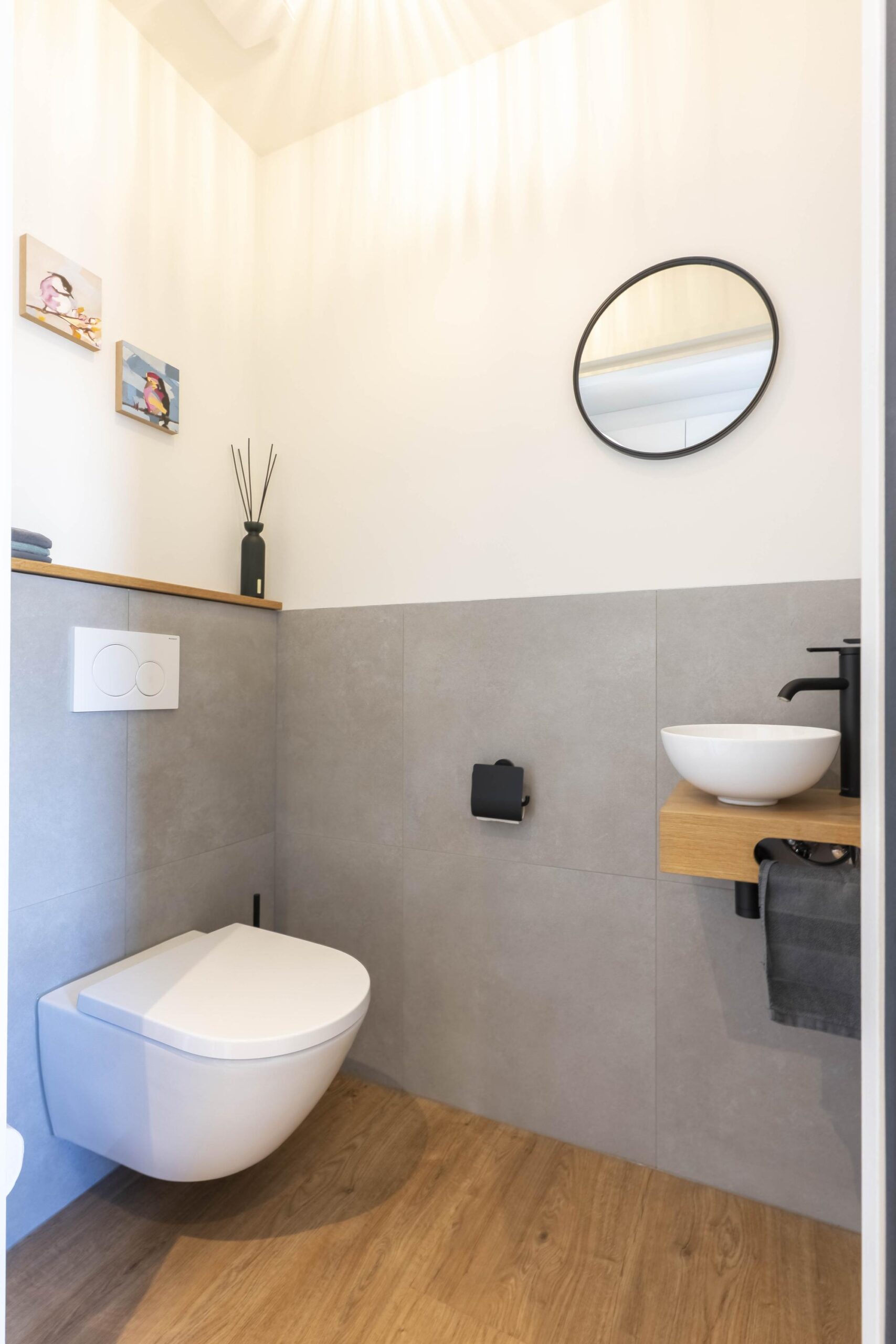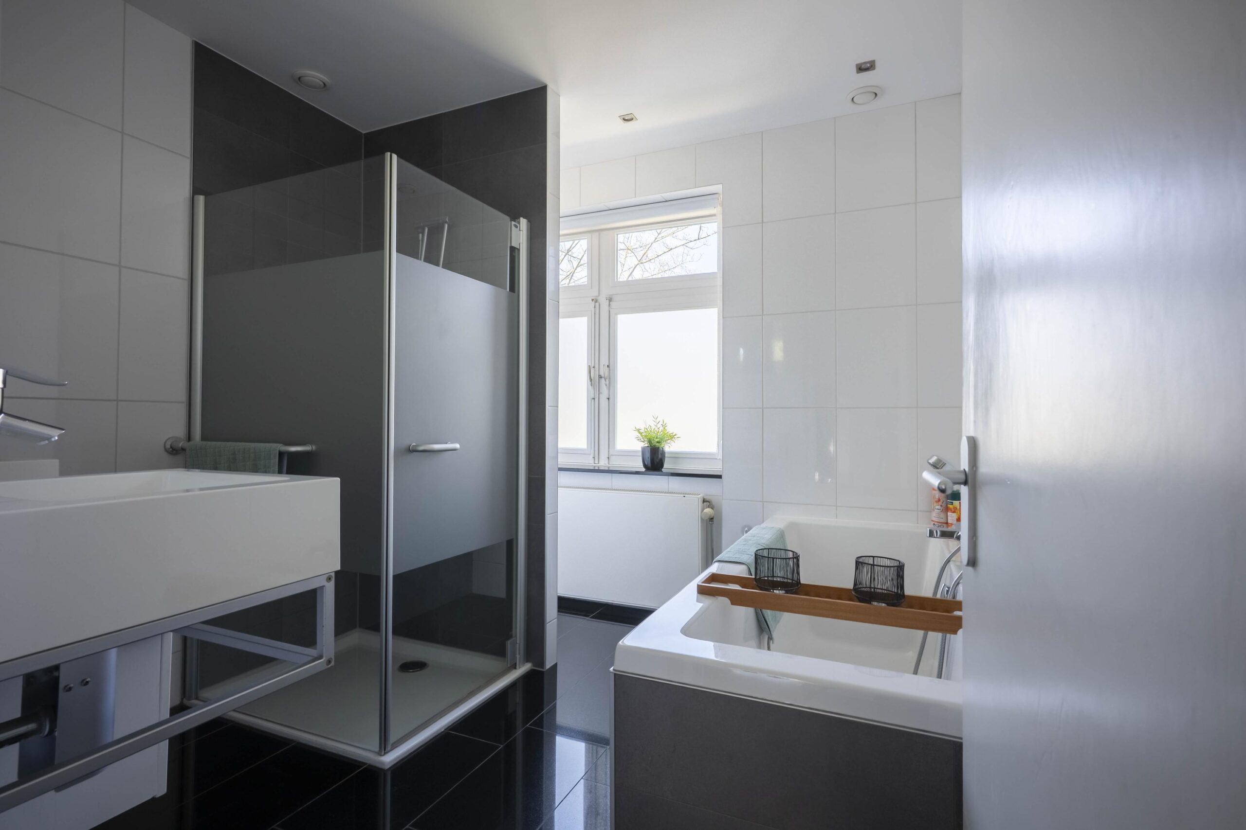 - Badkamervoorzieningen Ligbad, toilet, dubbele wastafel, wastafelmeubel, inloopdouche, vloerverwarming