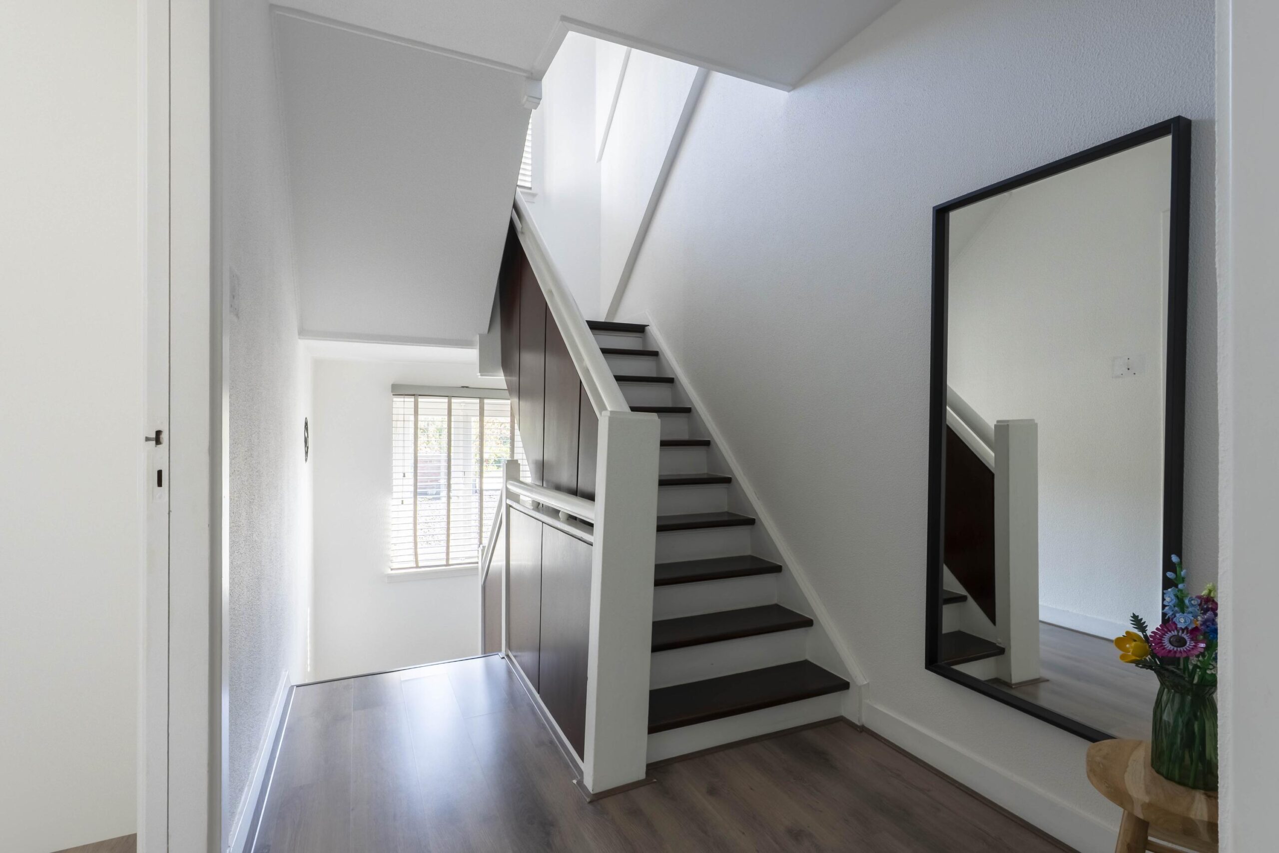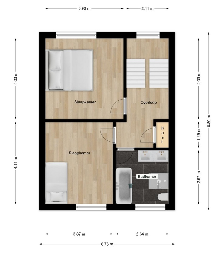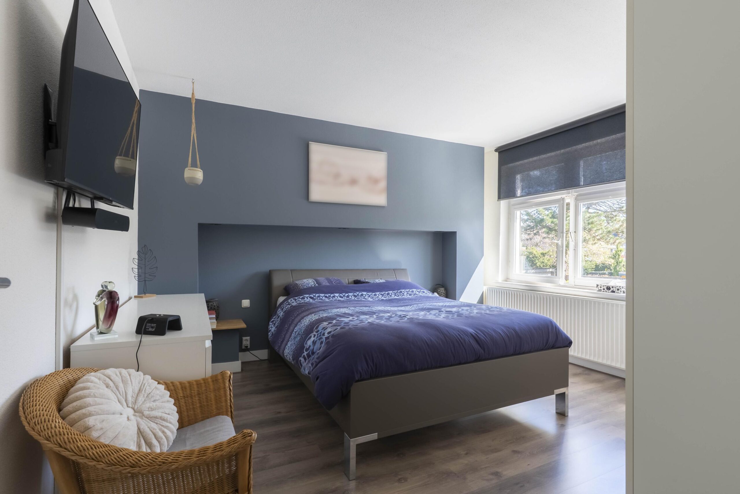 Bordestrap, overloop, bergkast, twee ruime slaapkamers (4,0 x 4,0 m en 4,0 x 3,47 m) met doorlopende laminaatvloer. De moderne badkamer (2,6 x 3,0m) is geheel betegeld en voorzien van een ligbad, separate douche, dubbele moderne wastafel en 2e toilet.
