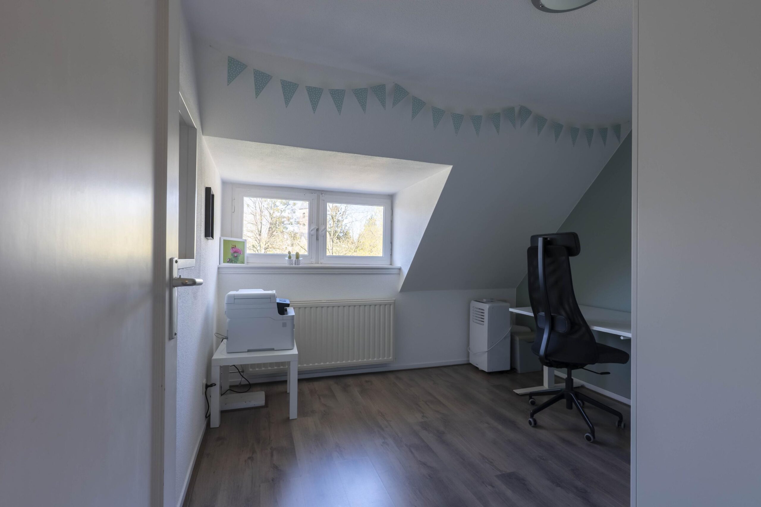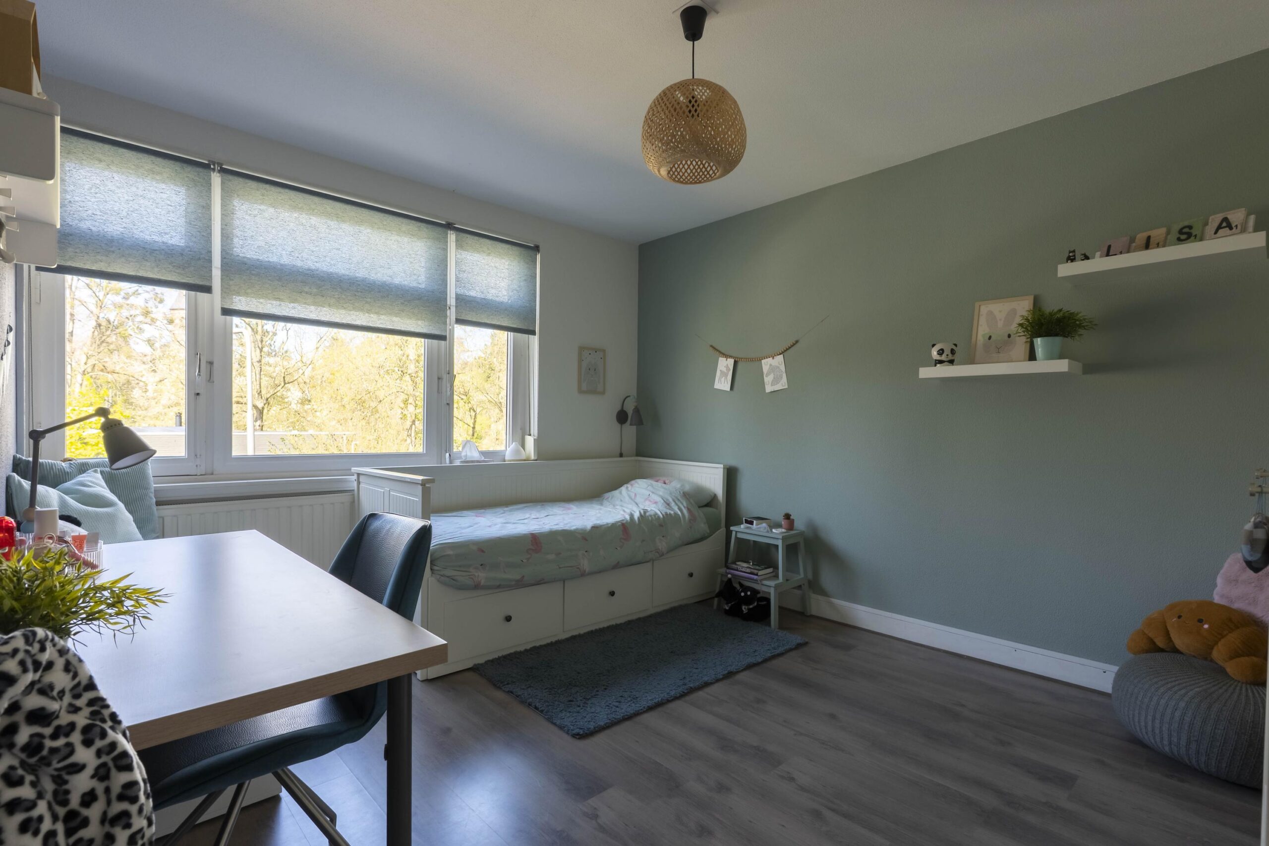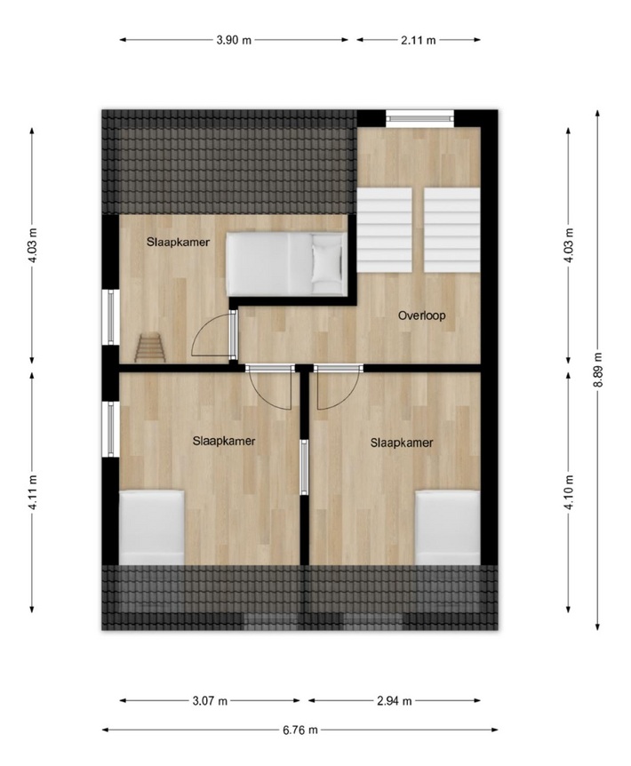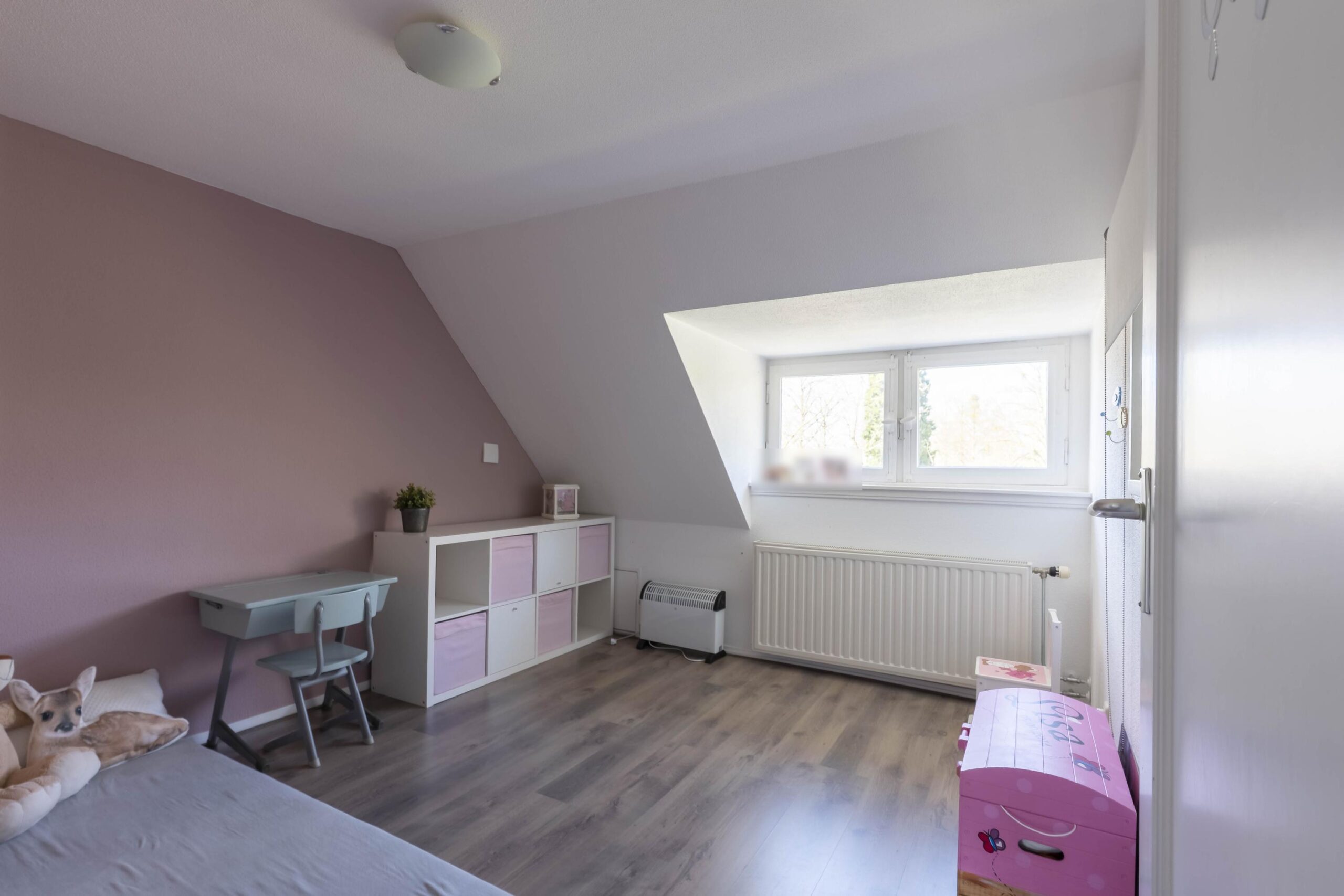 Doorlopend trappenhuis, overloop met toegang tot de slaapkamers uitgebouwd met dakkapel (3,3 x 3,0 m en 3,3 x 3,0 m) en de derde slaapkamer (3,2 x 3,8m), allen met laminaatvloer. De goed afgewerkte vliering/ bergzolder/ vide (ca. 13 m2 vloeropp.) is middels trapladder vanuit de derde slaapkamer te bereiken.