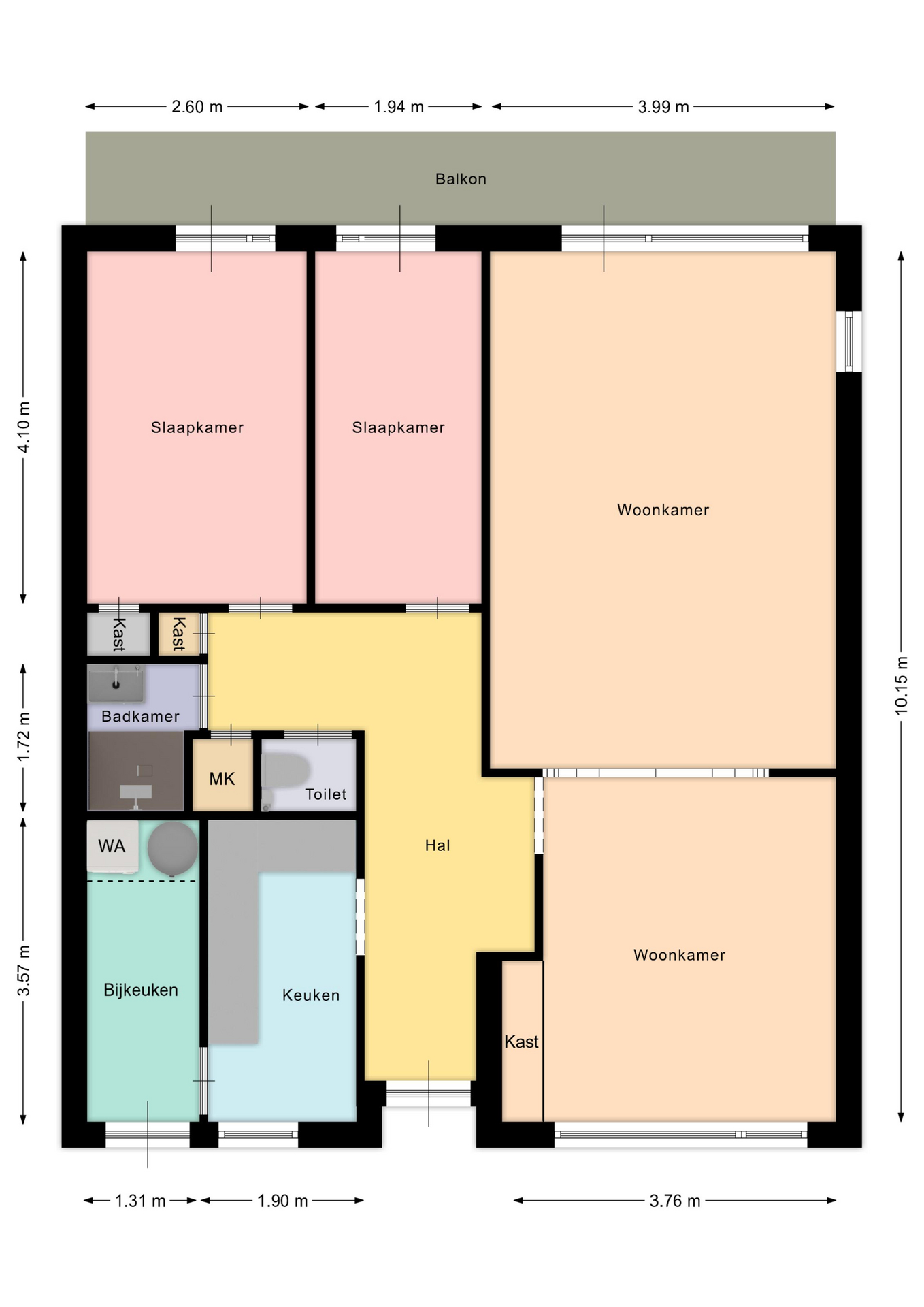 Aan de voorzijde van het appartement is de gesloten keuken gesitueerd (ca. 6m²). Vanuit de keuken bereikt men eveneens de praktische bijkeuken (ca. 4.5m²) alwaar de elektrische boiler (eigendom) en de witgoedaansluitingen zijn gerealiseerd. De nette badkamer (ca. 3m²) beschikt over een douche en een wastafel. De twee slaapkamers (ca. 10.5 & 8m²) zijn aan de achterzijde van het appartement gelegen, voorzien van twee loopdeuren toegang tot het balkon. Vanuit de entree/hal is tevens het toilet, een bergkast en de meterkast bereikbaar.
