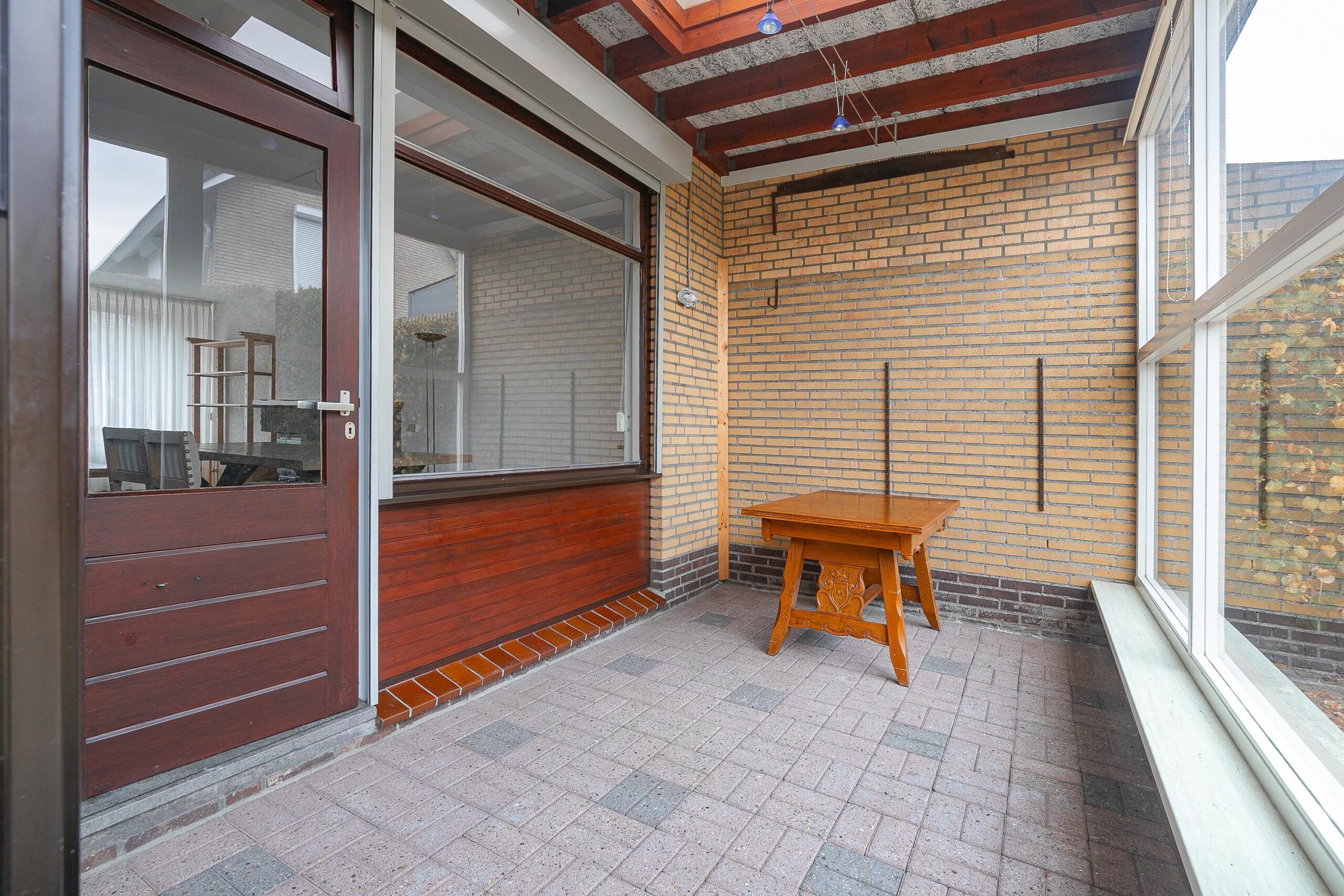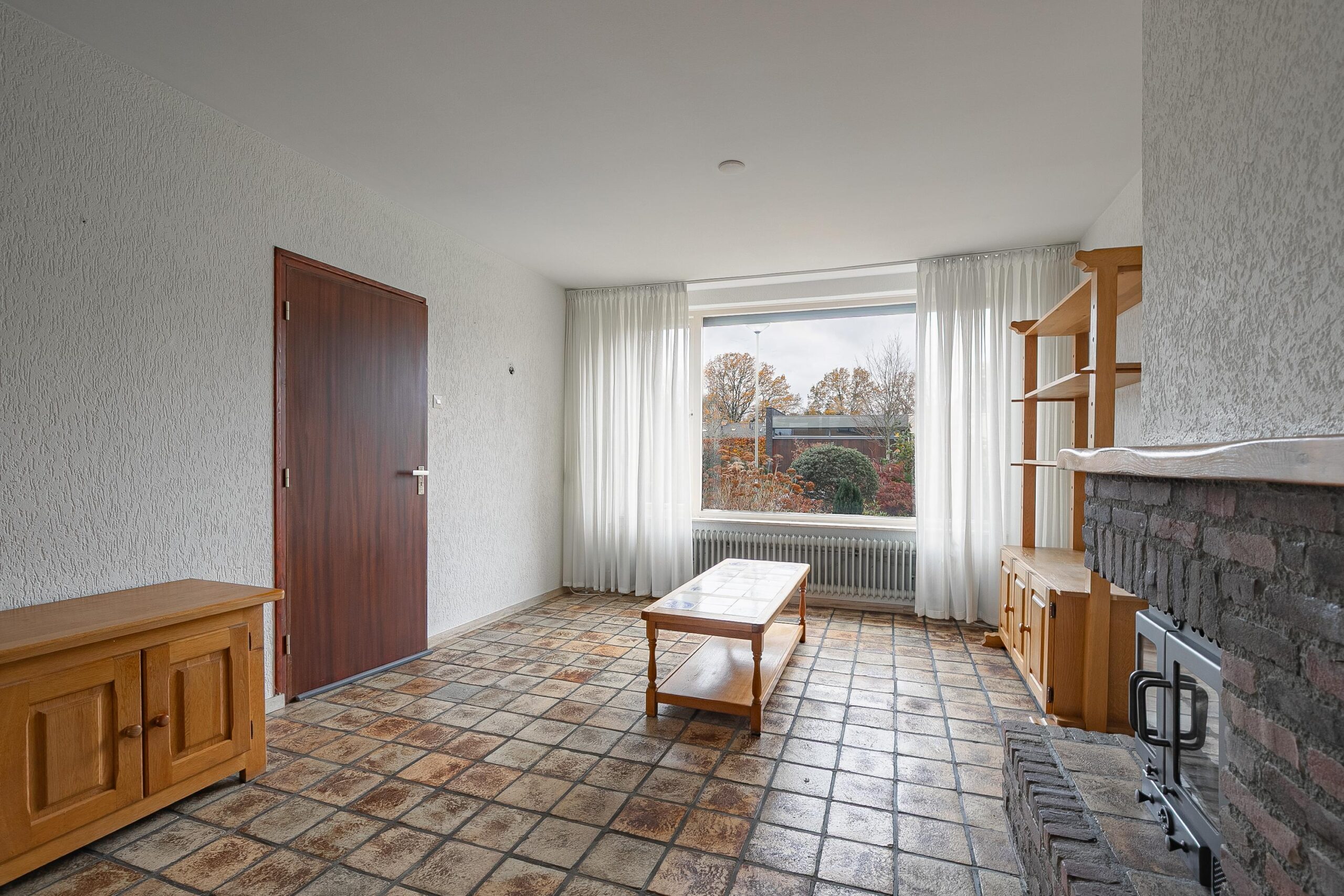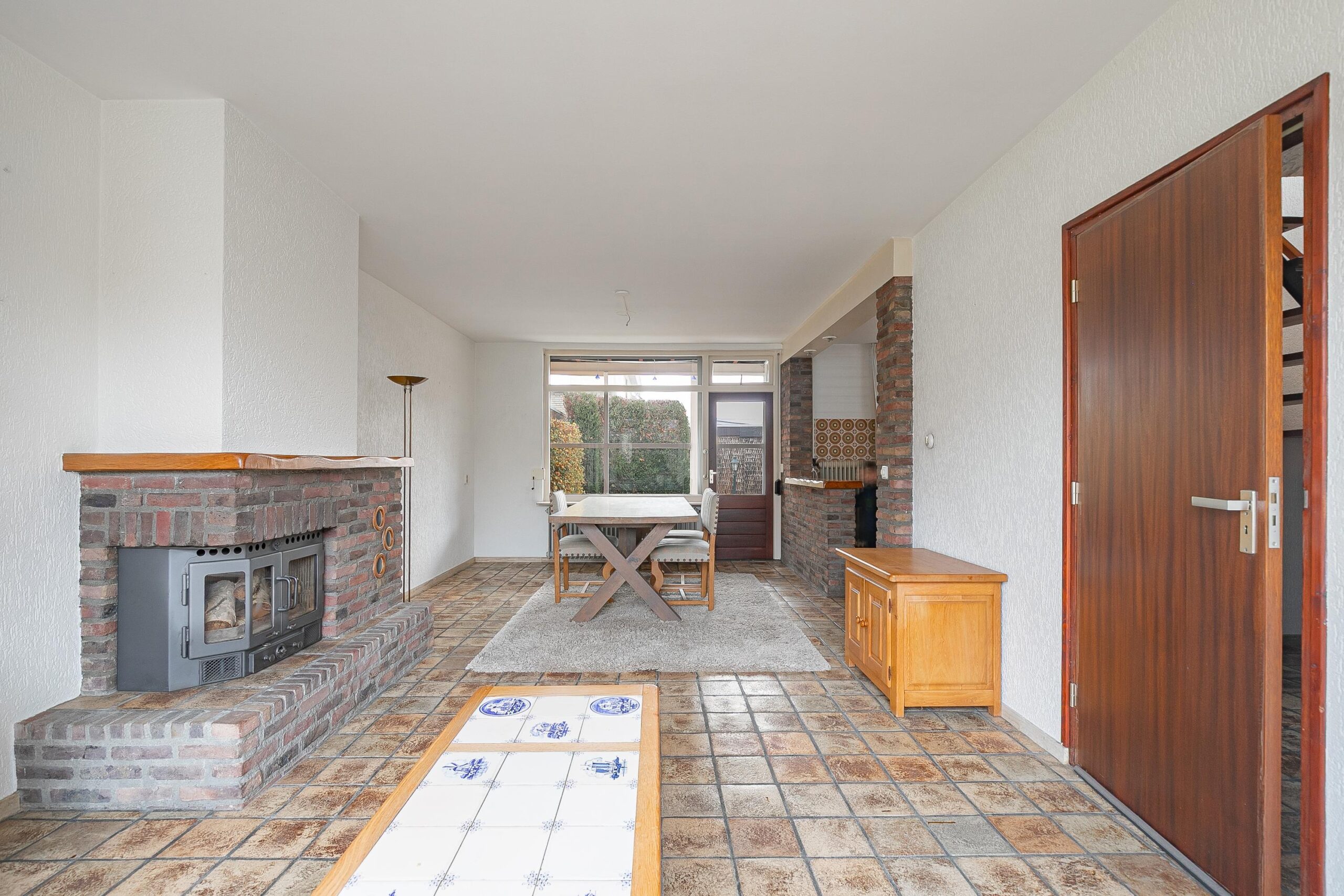 Overdekte entree. Ruime hal met meterkast (8 groepen, 1 aardlekschakelaar), bergruimte en toilet met wastafeltje. Doorzon woonkamer (ca. 28.5m²) met houtkachel, tegelvoer en loopdeur naar de achtergelegen serre (ca. 9.3m²). Keuken (ca. 10m²) met eenvoudige aanrechtcombinatie voorzien van de volgende apparatuur: inductie kookplaat, oven, koelkast, afzuigkap en spoelbak. Achter de woonkamer is een serre (ca. 9.3m²), achter de keuken een overdekt terras (ca. 6,3m²). 7 meter lange garage (ca. 20.6m²) met overkapping aan de voorzijde. Op het oosten georiënteerde, geheel omsloten achtertuin met een combinatie van zon en schaduw tot laat in de middag.
