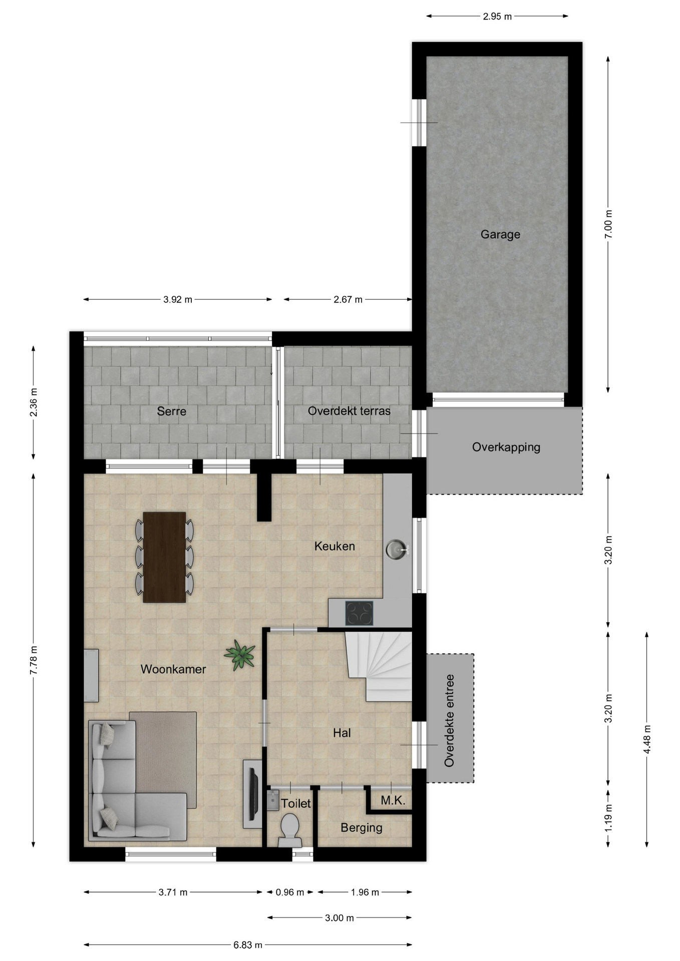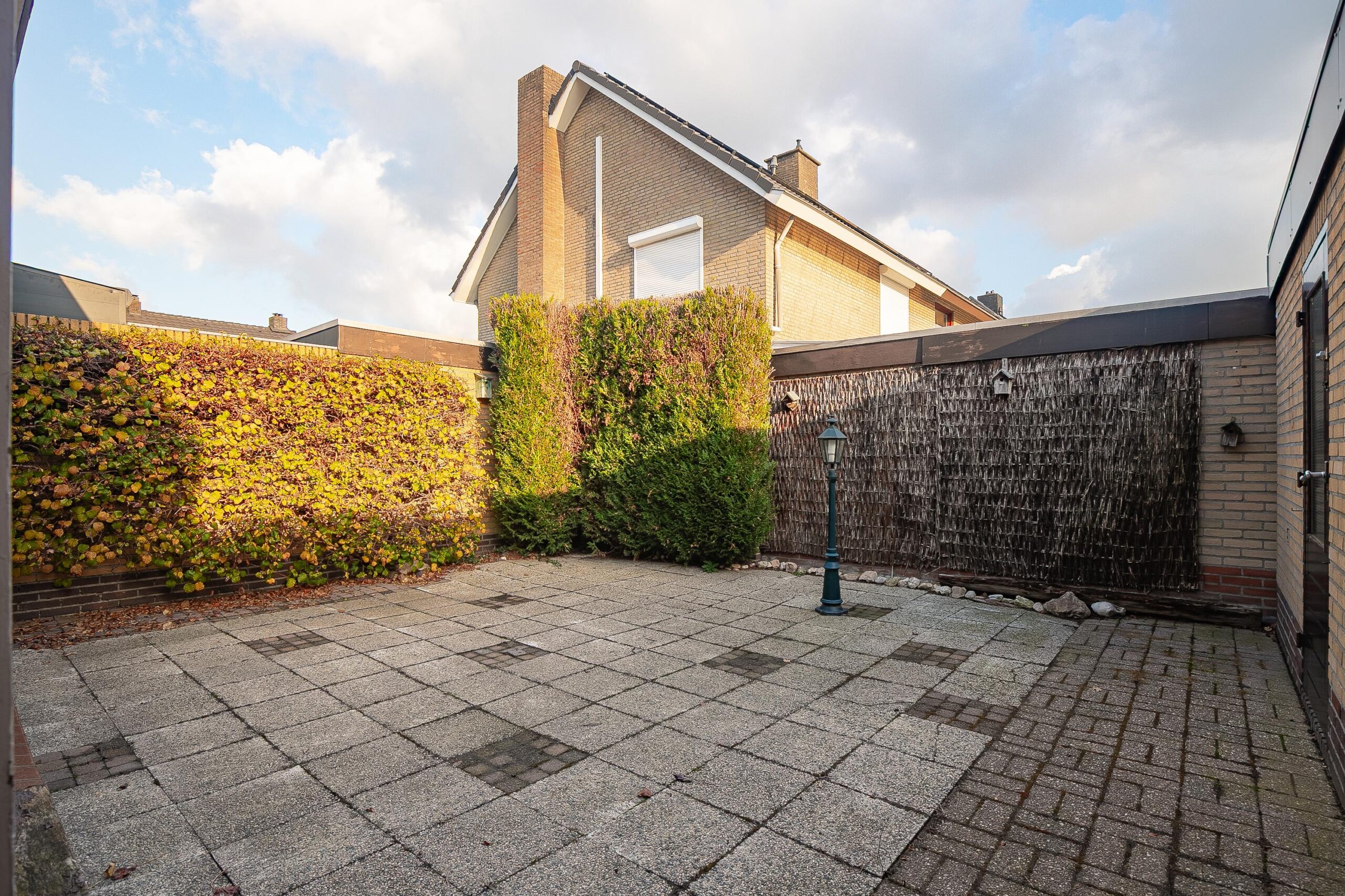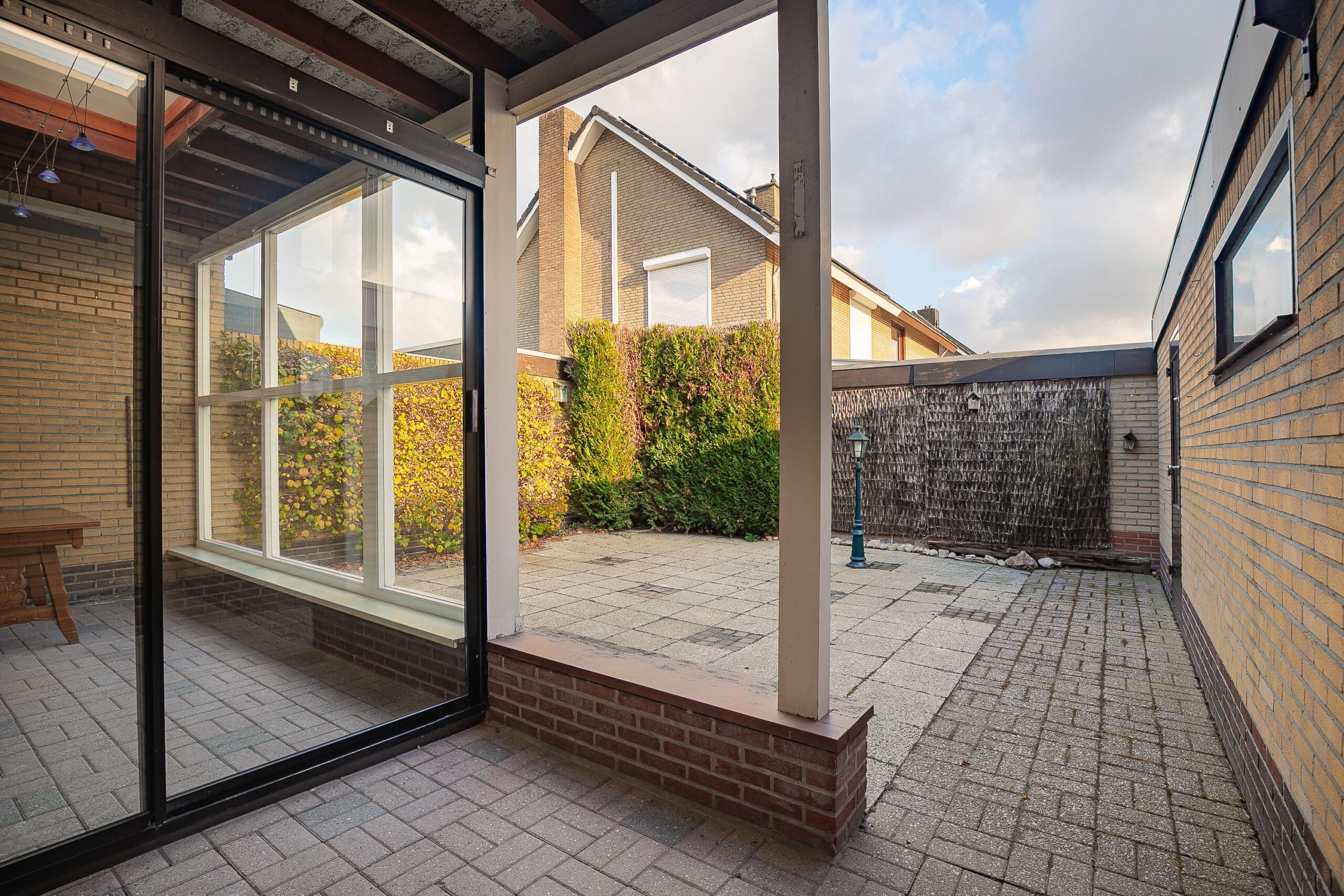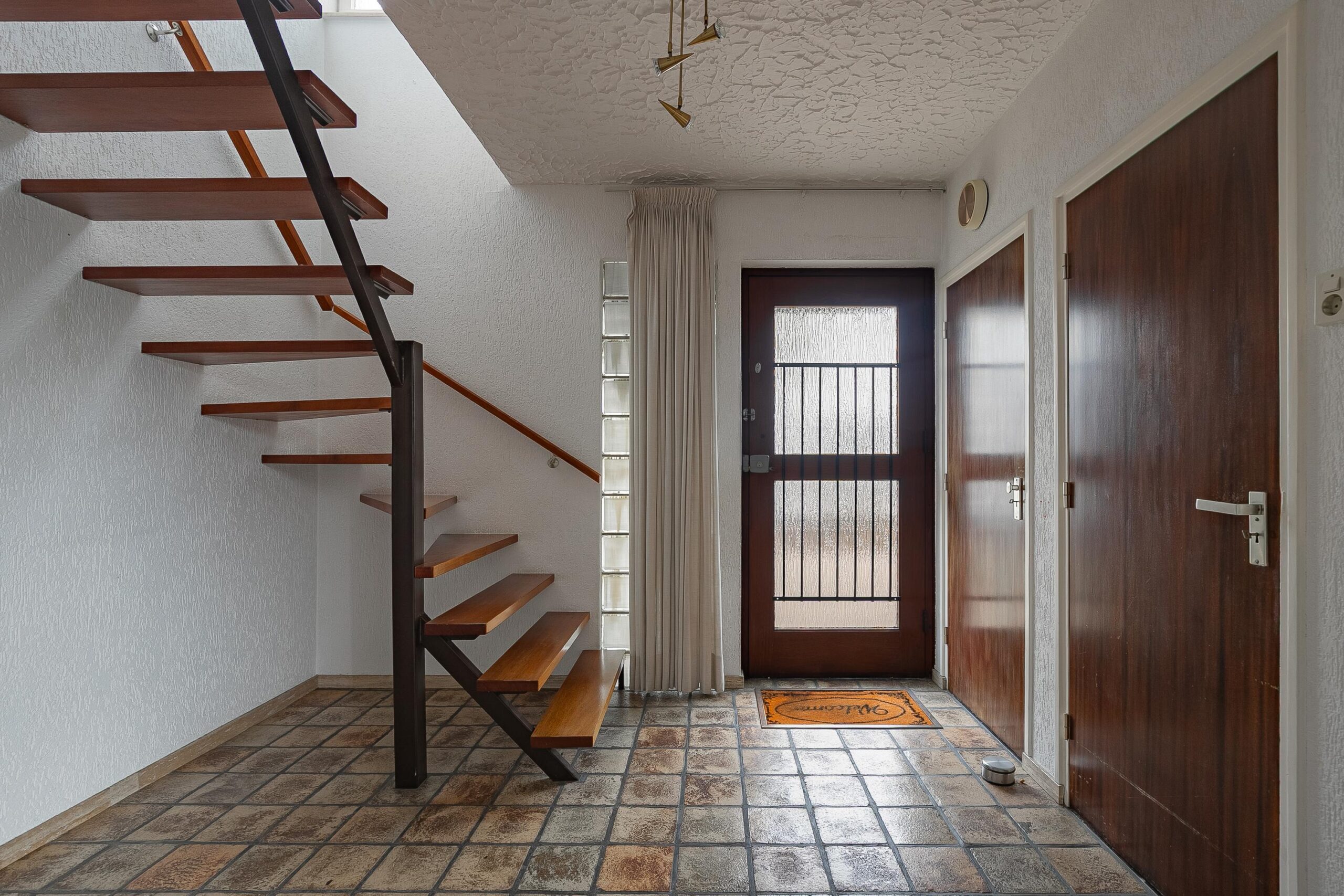 Overdekte entree. Ruime hal met meterkast (8 groepen, 1 aardlekschakelaar), bergruimte en toilet met wastafeltje. Doorzon woonkamer (ca. 28.5m²) met houtkachel, tegelvoer en loopdeur naar de achtergelegen serre (ca. 9.3m²). Keuken (ca. 10m²) met eenvoudige aanrechtcombinatie voorzien van de volgende apparatuur: inductie kookplaat, oven, koelkast, afzuigkap en spoelbak. Achter de woonkamer is een serre (ca. 9.3m²), achter de keuken een overdekt terras (ca. 6,3m²). 7 meter lange garage (ca. 20.6m²) met overkapping aan de voorzijde. Op het oosten georiënteerde, geheel omsloten achtertuin met een combinatie van zon en schaduw tot laat in de middag.