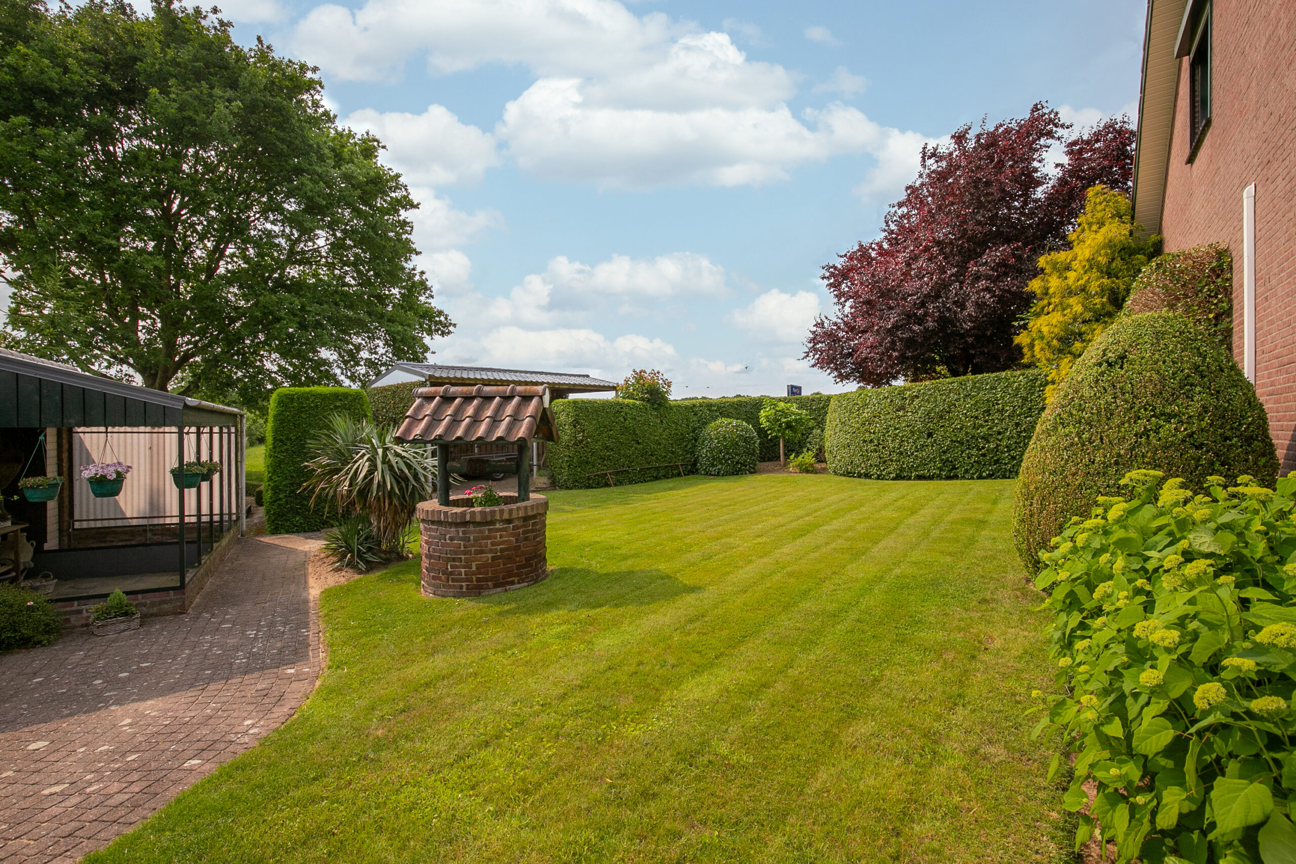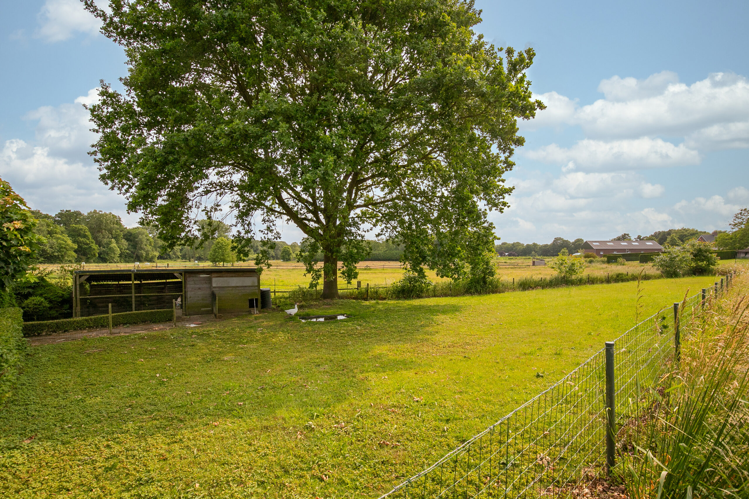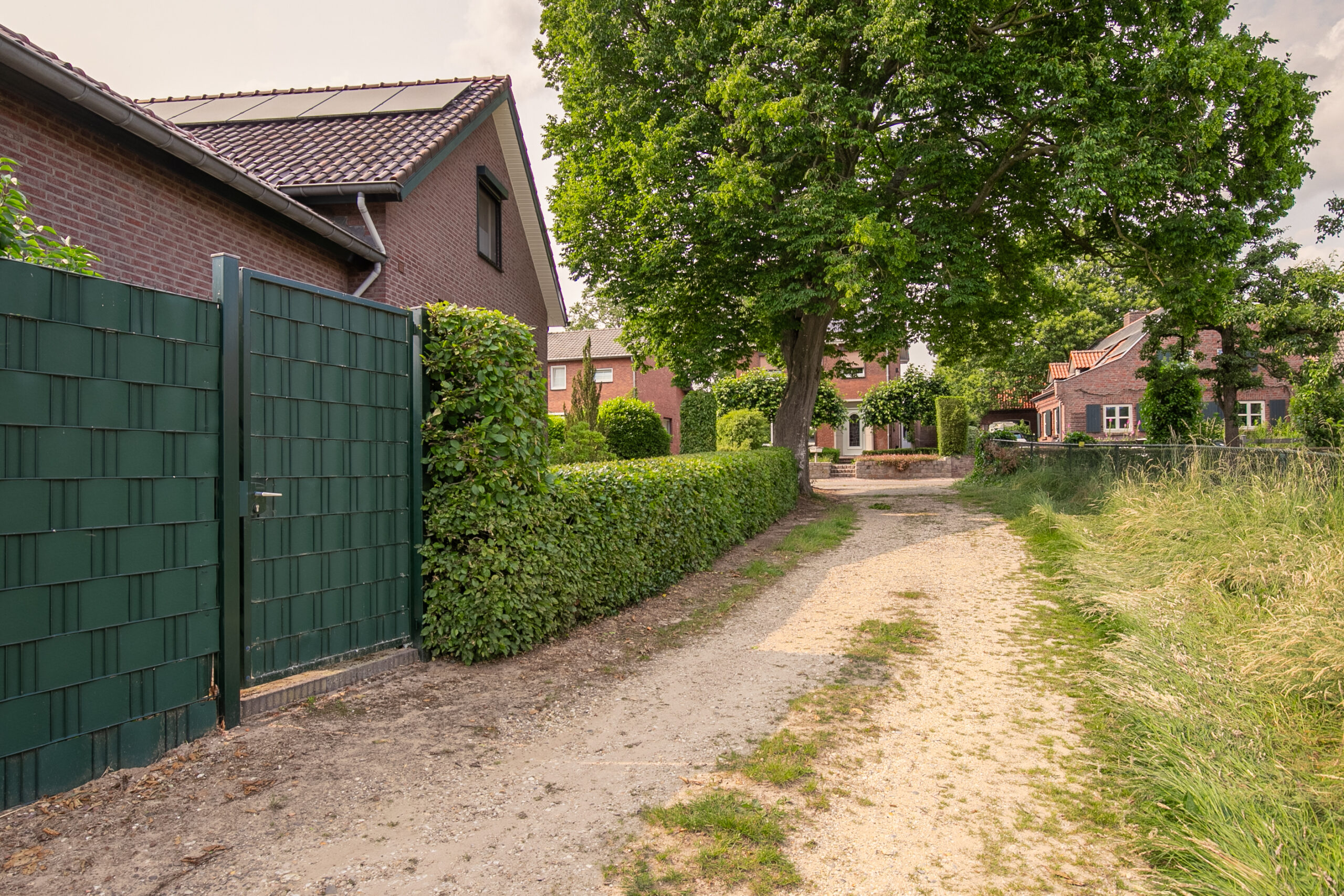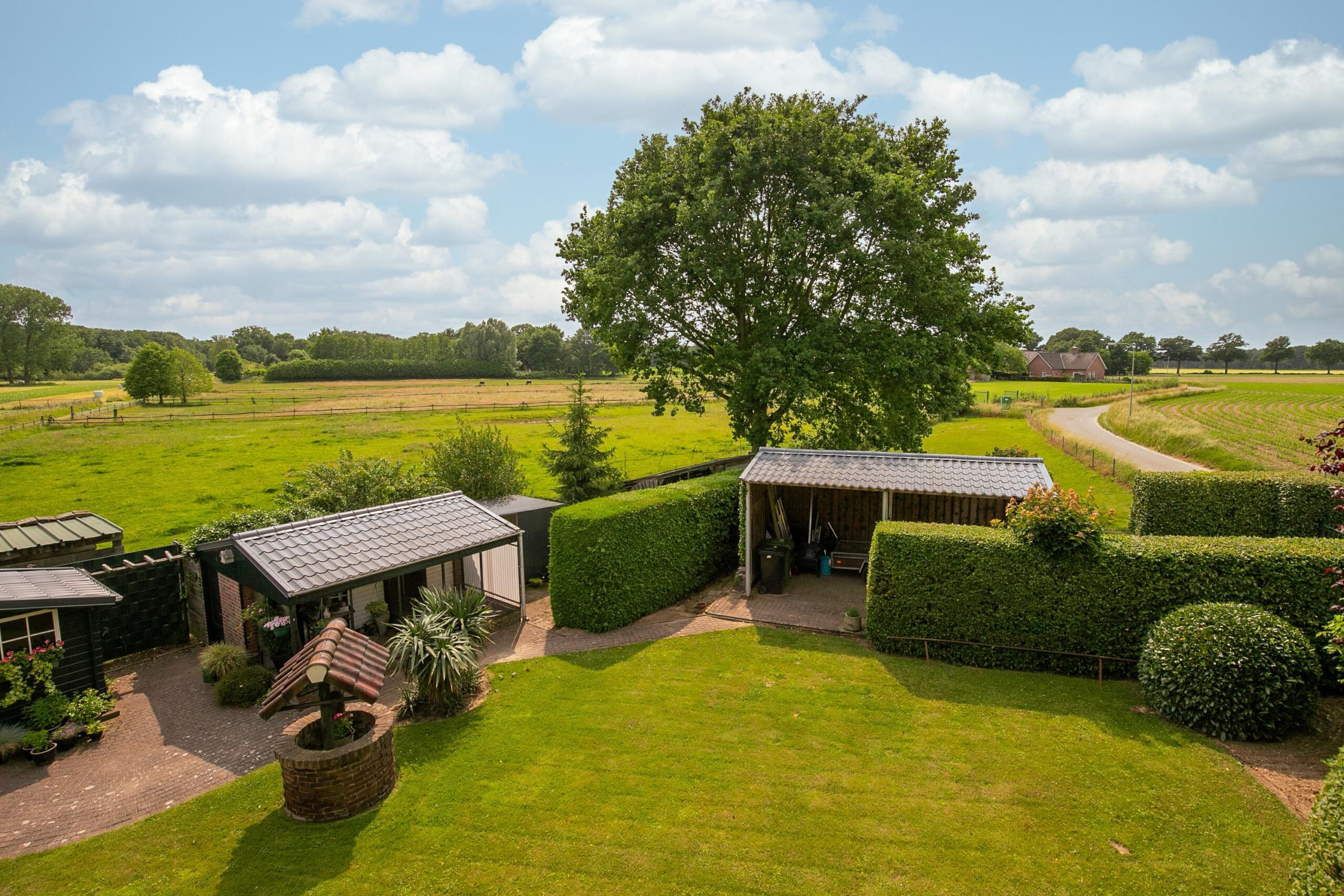 Rondom de woning ligt een heerlijke, grote tuin. Door het ruime overdekte terras, kun je fijn genieten van het buitenleven. De tuin is geheel omheind en biedt volledige privacy en vrijheid. Er zijn namelijk geen directe buren aan de achterkant en zijkant. De tuin is omringd door weilanden en bosgebied in de verte. Verder is de tuin grotendeels voorzien van gazon, gedeeltelijk betegeld en beklinkerd en heeft een verscheidenheid aan beplanting, bomen en groen. Er is een carport aanwezig met aan de rechterzijde een strookje tuin toegankelijk is die ideaal gebruikt kan worden als bijvoorbeeld moestuin of huisweide voor het houden van kleinvee. Ook zijn er twee praktische bergingen aanwezig als opslagruimte. Aan de voorzijde is een oprit aanwezig en de tuin is middels poortje toegankelijk.
