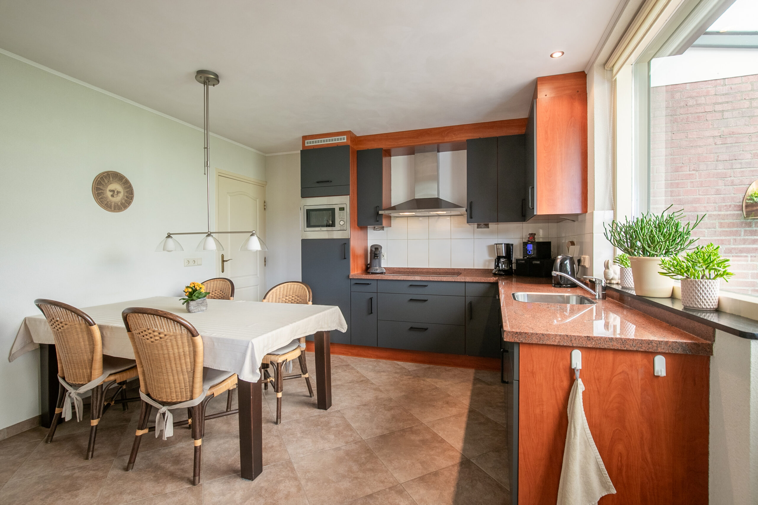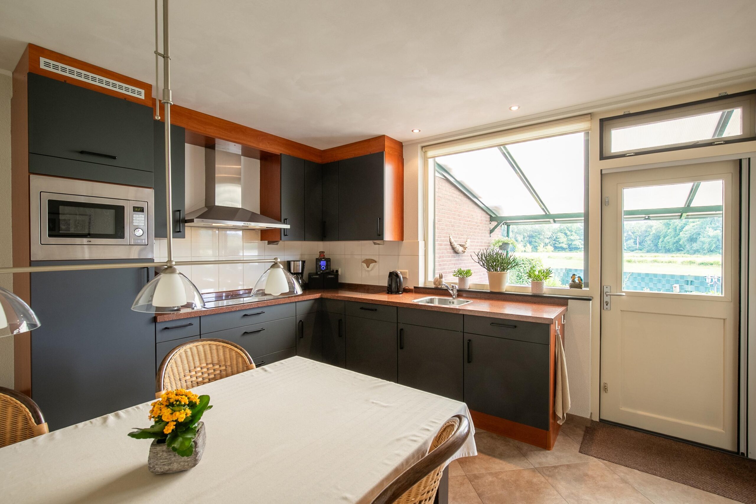 De woonkamer is ruim opgezet (circa 30 m2) en voorzien van een tegelvloer en airco-installatie (2024). Door de grote raampartijen is er prettig lichtinval en is er aan de achterzijde mooi uitzicht over het groen en de achtergelegen weilanden en bosgebied. Gesloten leefkeuken (circa 14 m2) met een keuken in hoekopstelling en de navolgende installaties: inductiekookplaat, vaatwasser, koelkast, afzuigkap, spoelbak en diverse opbergkastjes en lades. De keuken is vorig jaar gerenoveerd en voorzien van nieuwe fronten en apparatuur. Ook vanuit hier profiteer je van het mooie vrije uitzicht.