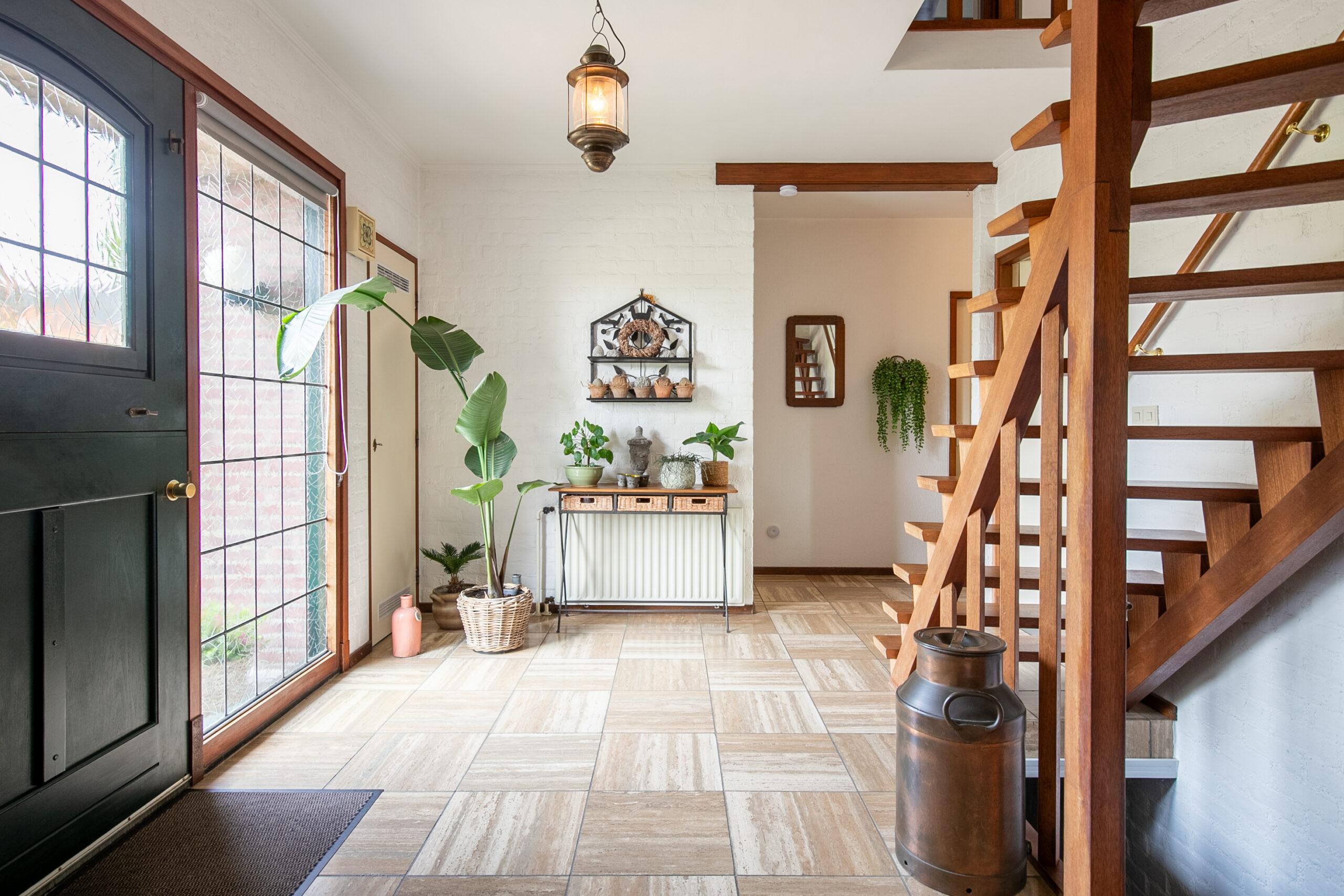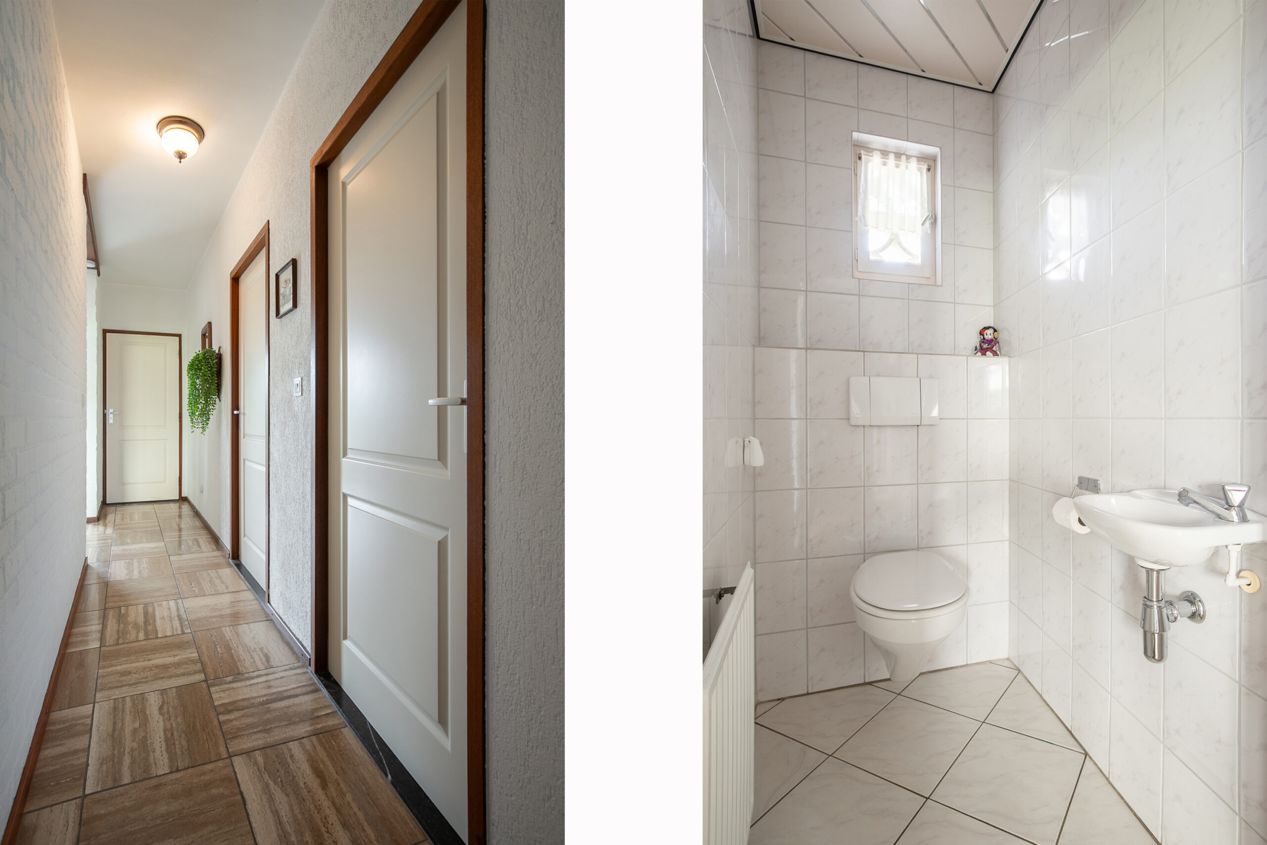 Ruime entree/hal voorzien van een tegelvloer met trap naar verdieping en souterrain, meterkast en toegang tot de woonkamer, keuken, toiletruimte, garage, badkamer en slaapkamer. De toiletruimte is betegeld en voorzien van zwevend closet met fonteintje.