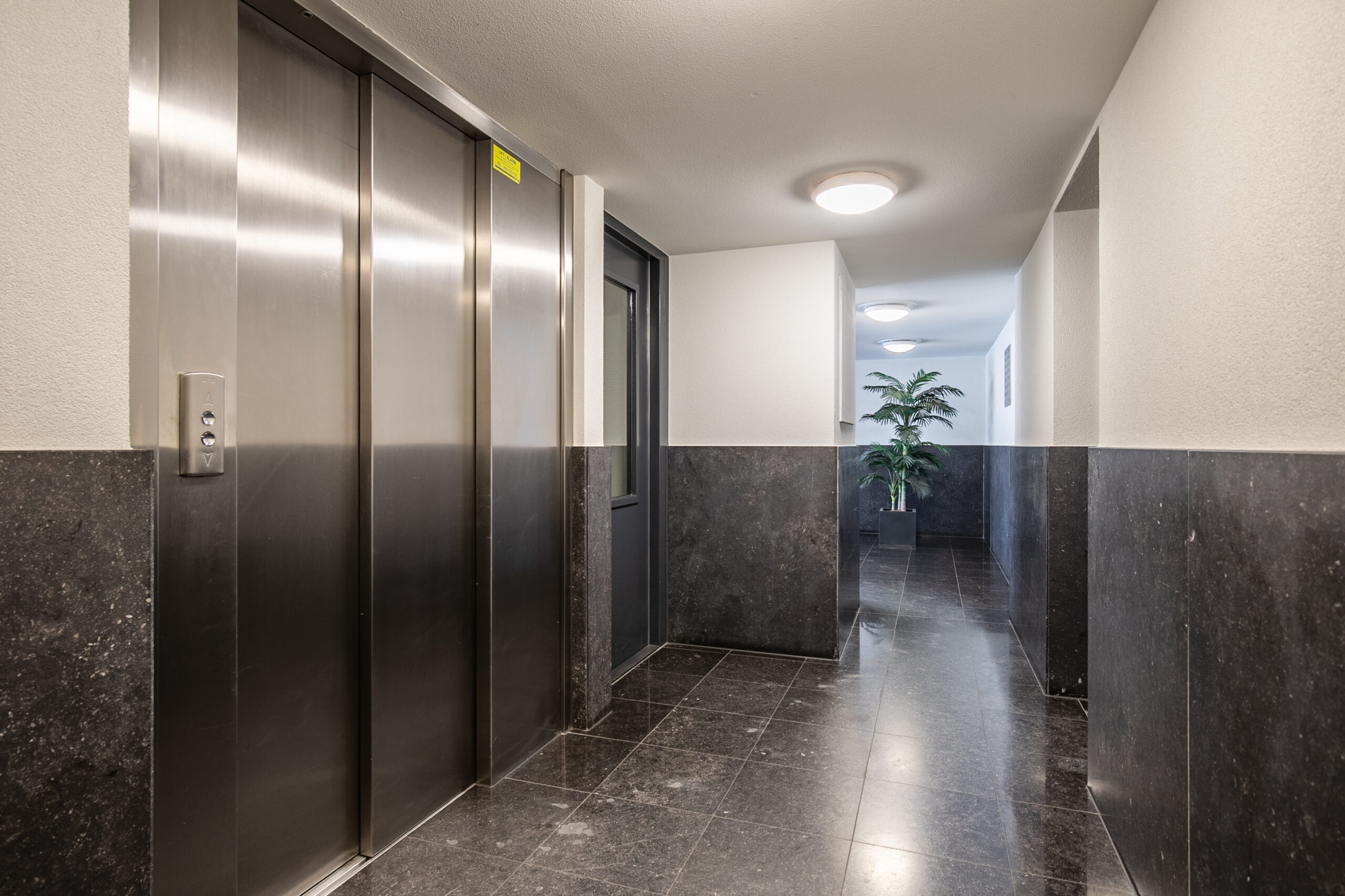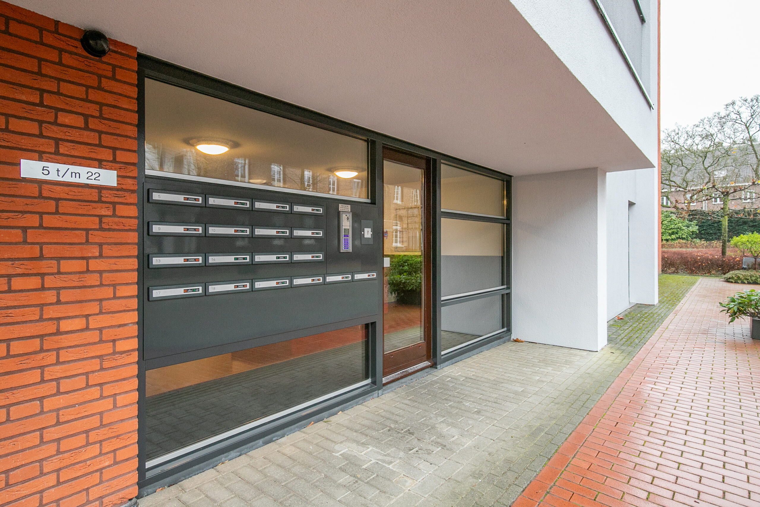 Overdekte entree. Ruime hal voorzien van video intercom, liftinstallatie en brievenbussen. Privé berging ca. 7 m².