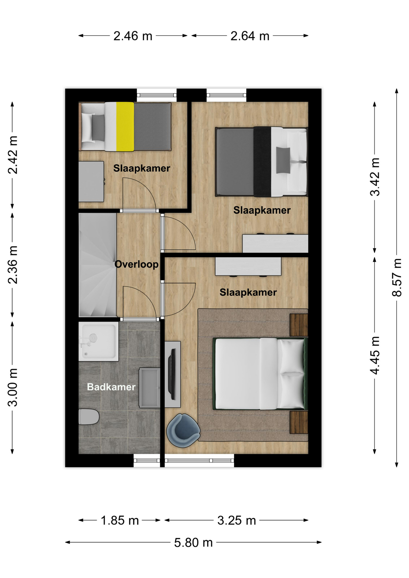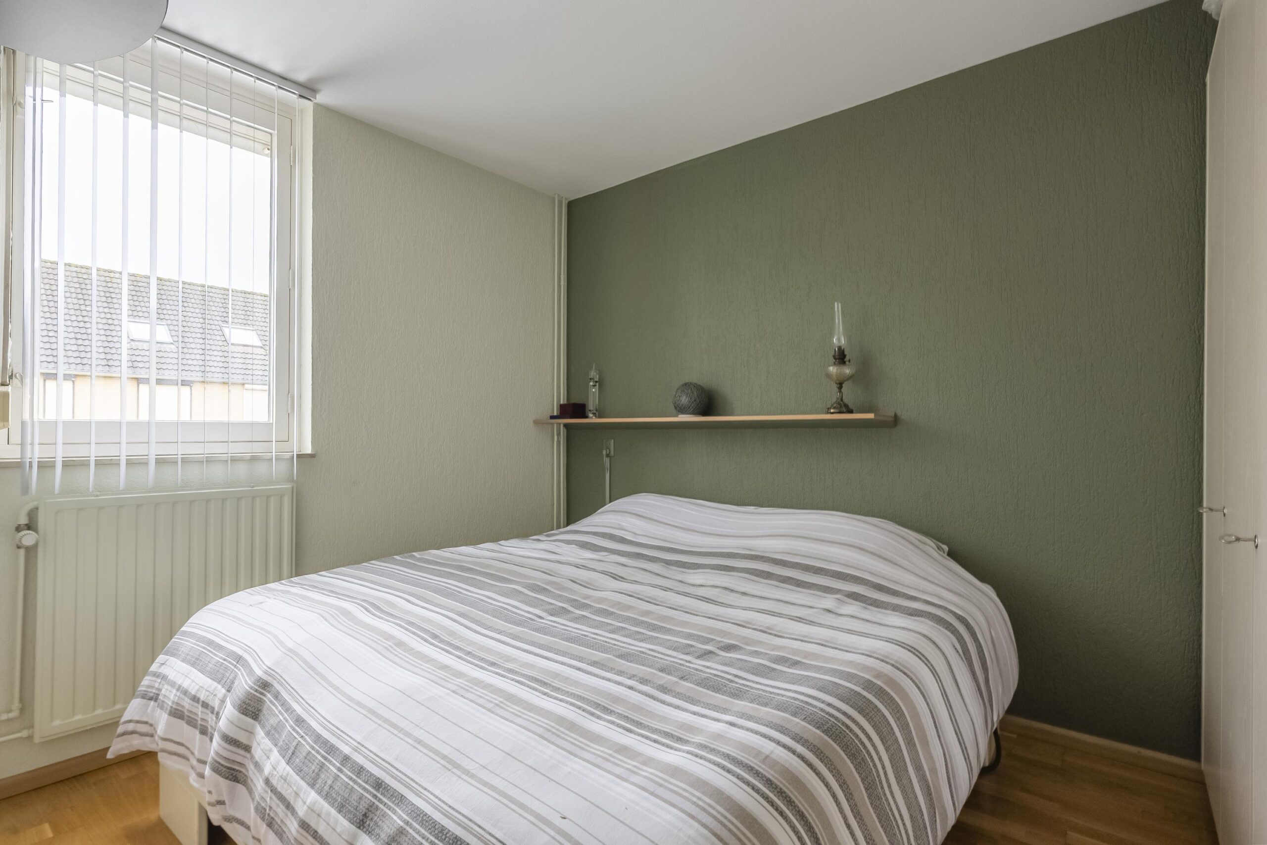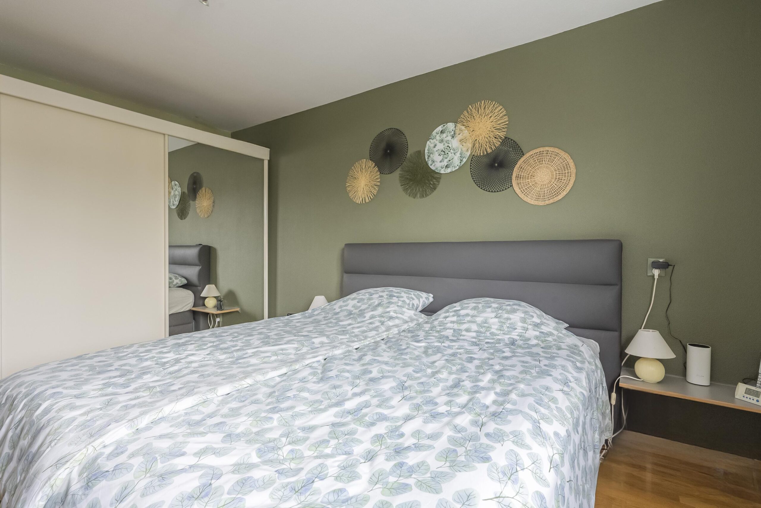 Overloop. 3 Slaapkamers allen voorzien van een parketvloer. Betegelde badkamer met douchecabine met thermosstaatkraan, 2e zwevend toilet, badmeubel met vaste wastafel en opbergkast.