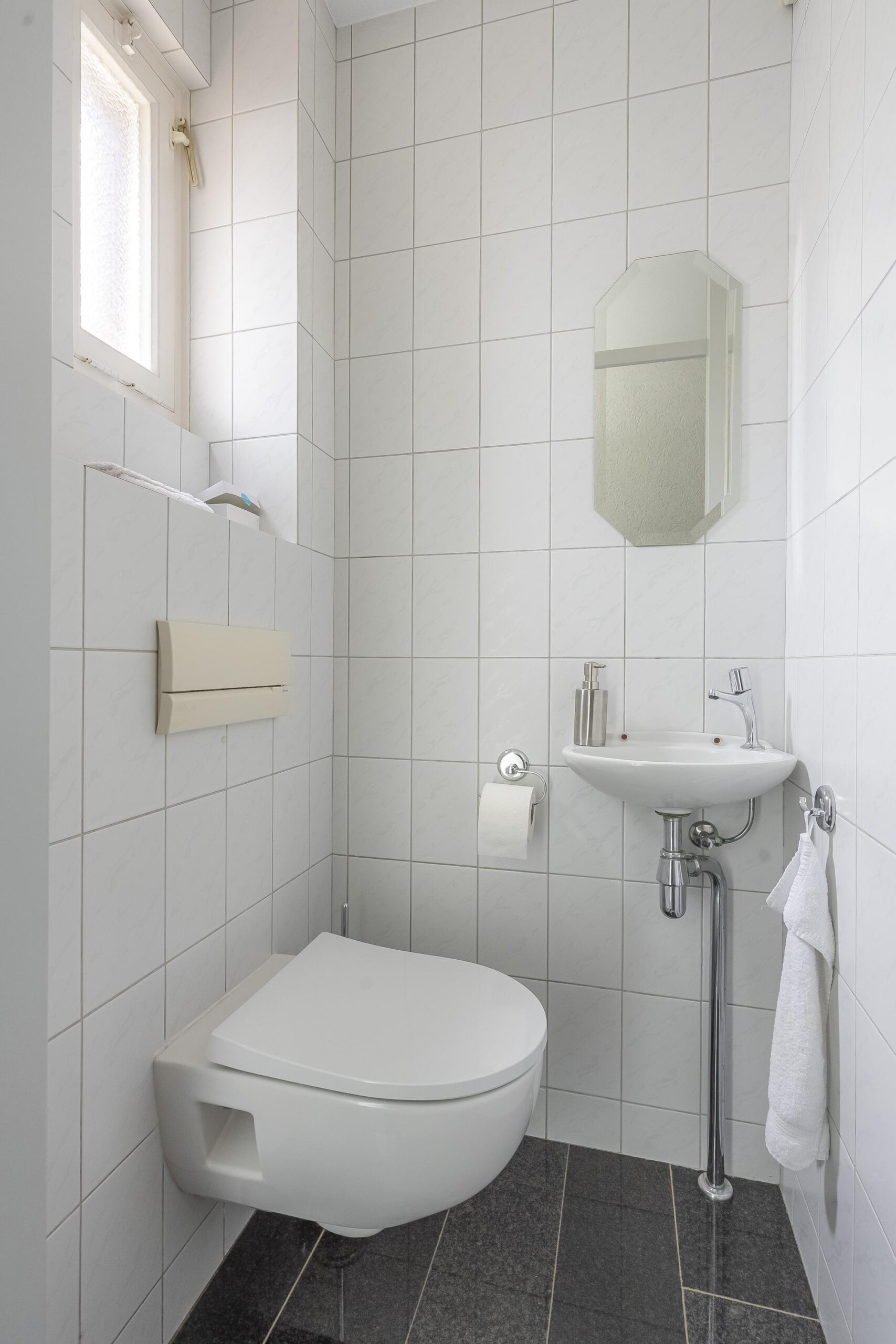 Entree. Hal met plavuizenvloer, geheel betegelde toiletruimte met zwevend toilet en fontein en vernieuwde meterkast