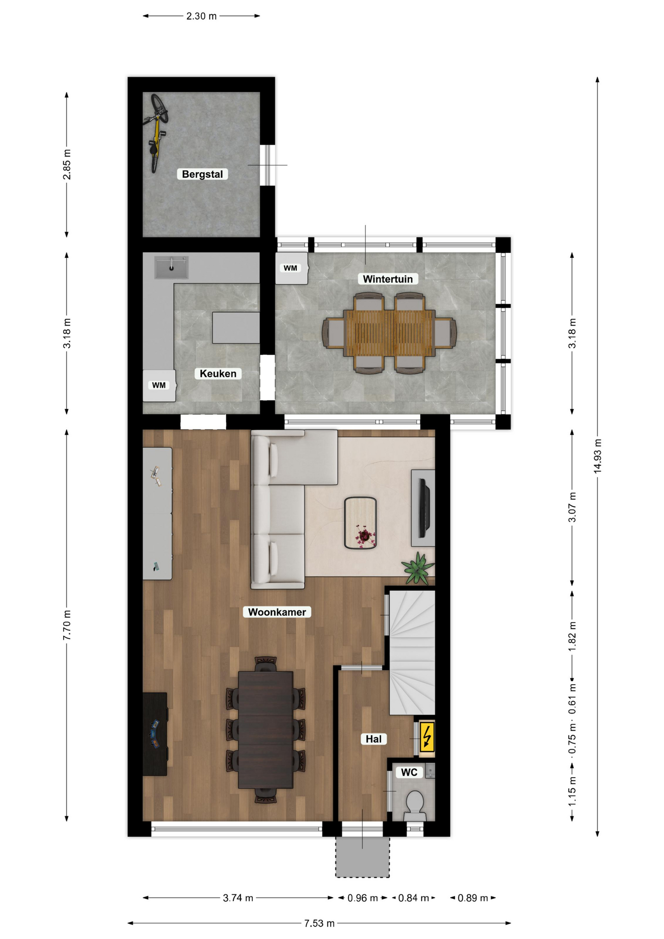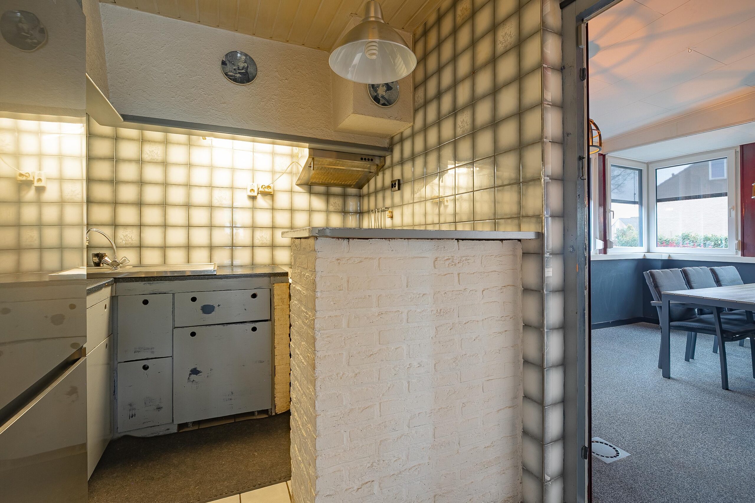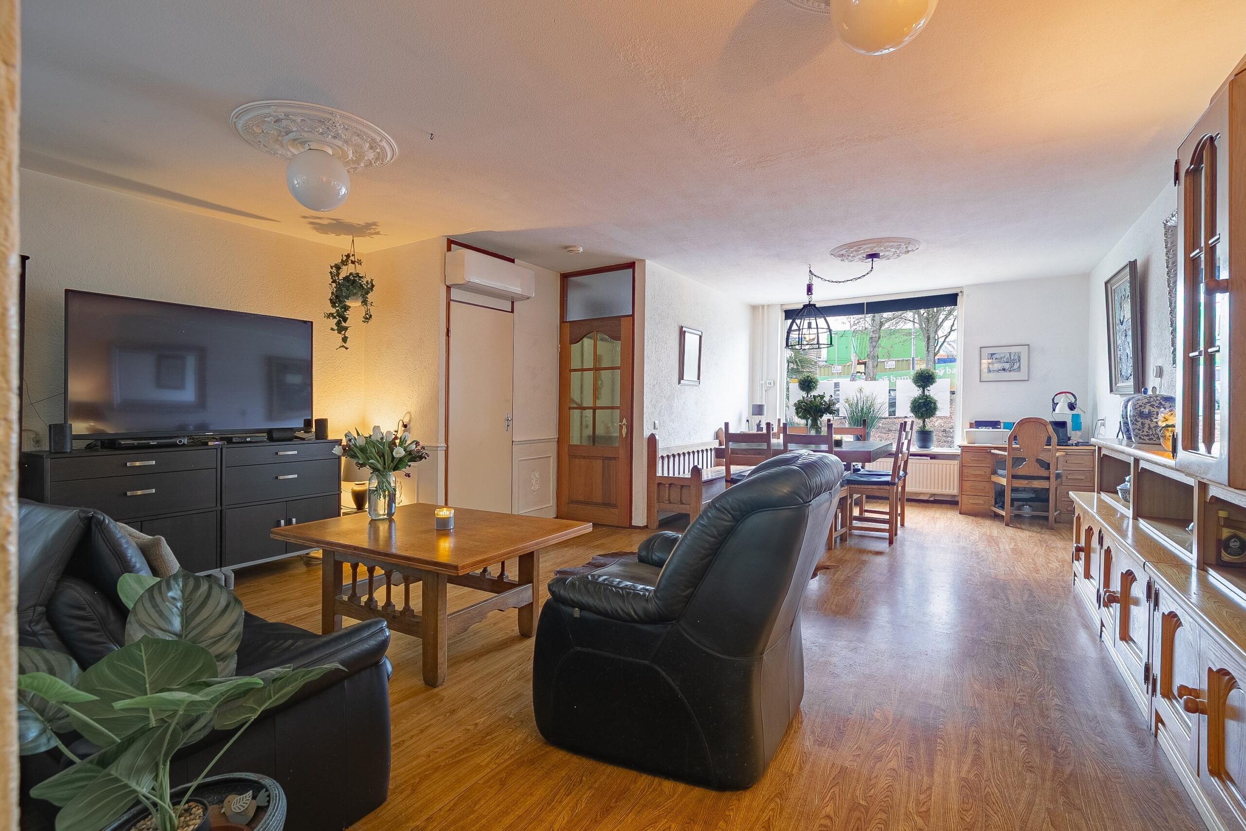 Via de onderhoudsvriendelijk aangelegde voortuin/oprit bereikt u de overdekte entree. Entree/hal met toegang tot de grotendeels betegelde toiletruimte, voorzien van toilet, fonteintje en raam ten behoeve van natuurlijke ventilatie. De hal beschikt tevens over een in het verleden gemoderniseerde meterkast en een vernieuwde trapopgang naar de verdieping. Vanuit de hal betreedt u de sfeervolle woonkamer. Aan de voorzijde zorgt een grote raampartij voor een prettige lichtinval. De woonkamer beschikt daarnaast over een praktische muurkast en is voorzien van airconditioning (Mitsubishi, 2024, eigendom). Aansluitend bereikt u de gesloten keuken, waar zich momenteel tevens de aansluitingen voor de wasmachine bevinden. De keuken dient gemoderniseerd te worden en biedt de koper de mogelijkheid deze geheel naar eigen wens in te richten. Vanuit de keuken heeft u toegang tot de royale veranda/wintertuin, voorzien van een siergrindvloer en diverse raampartijen, waardoor een fijne overgang tussen binnen en buiten ontstaat.