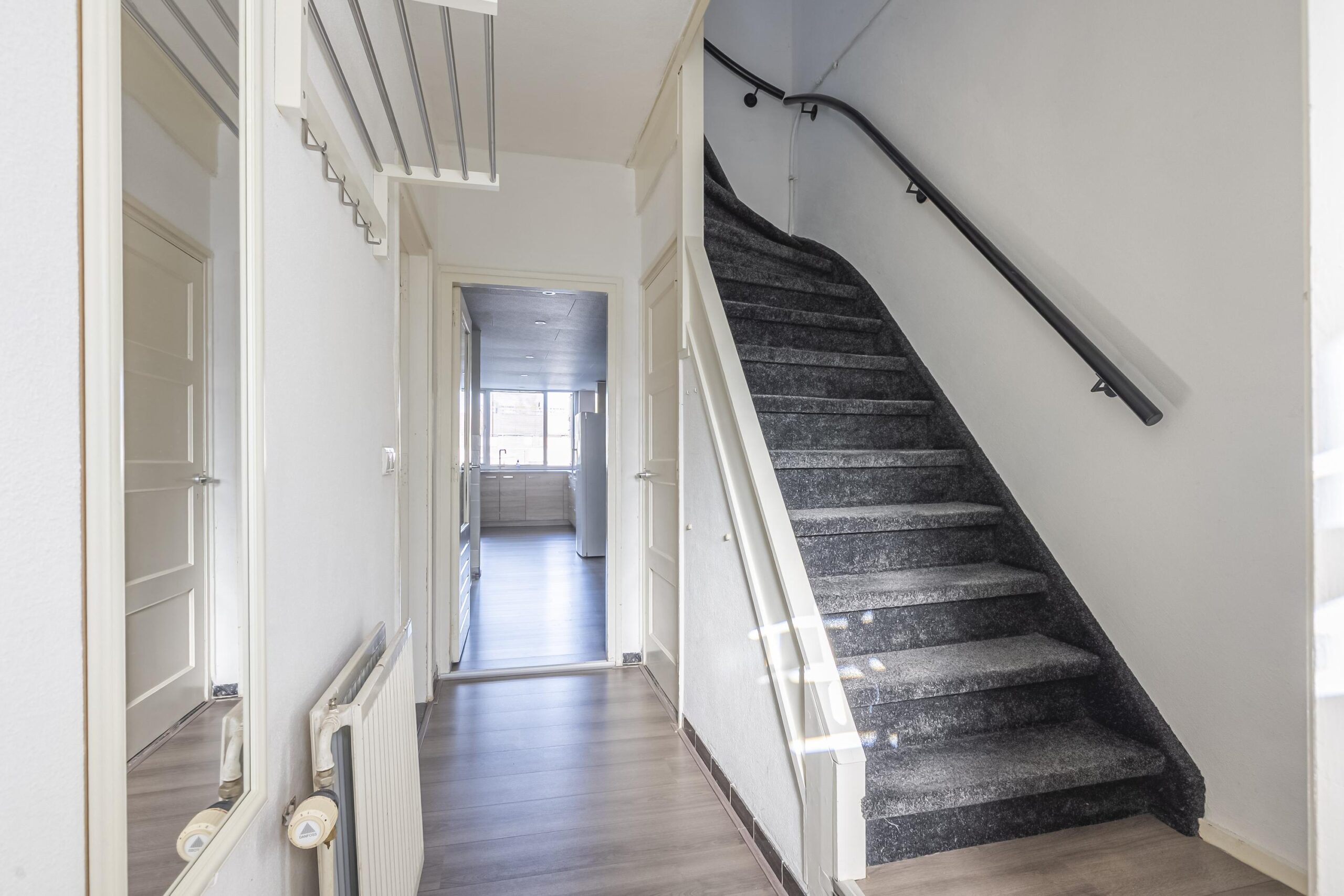 De hal met meterkast, trapopgang en gastentoilet met zwevend toilet en fonteintje biedt toegang tot zowel de woonkamer als de gesloten keuken.