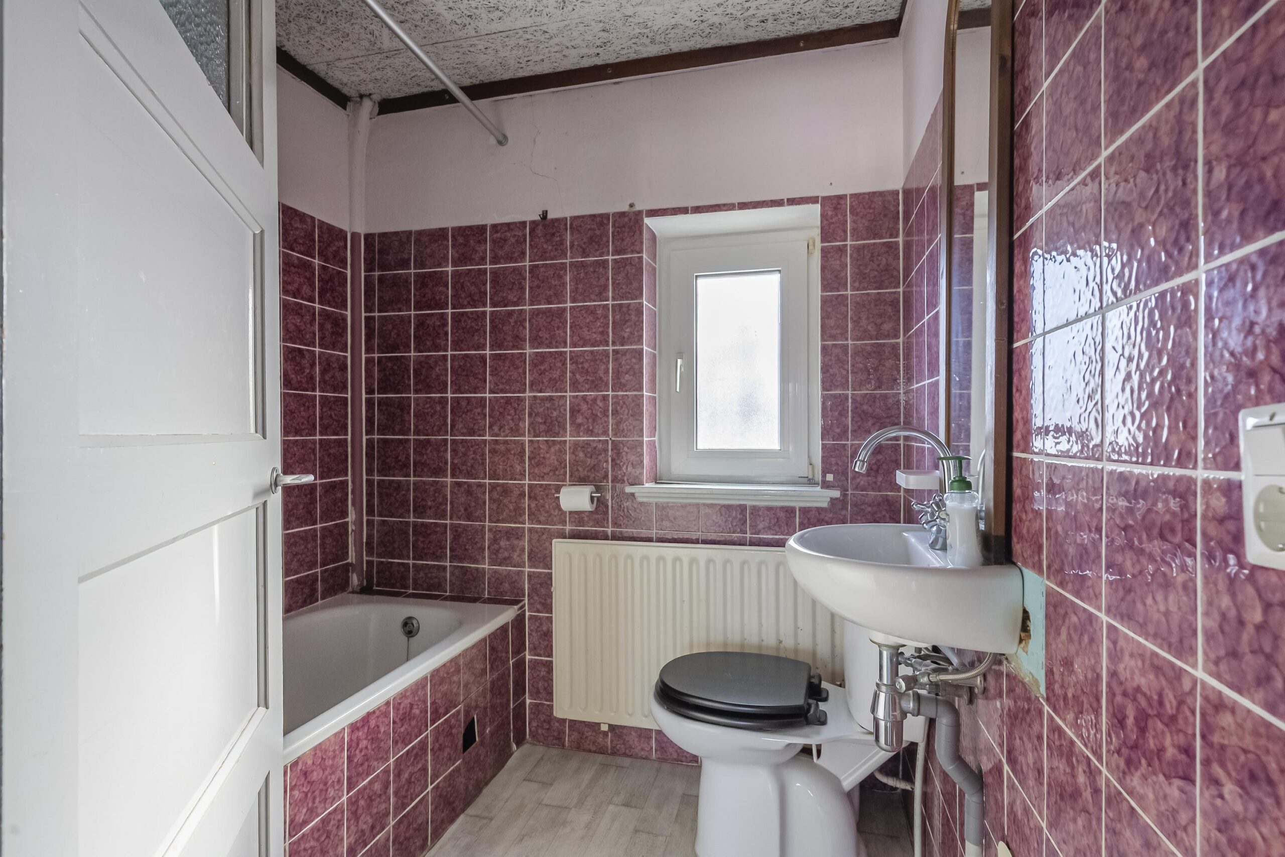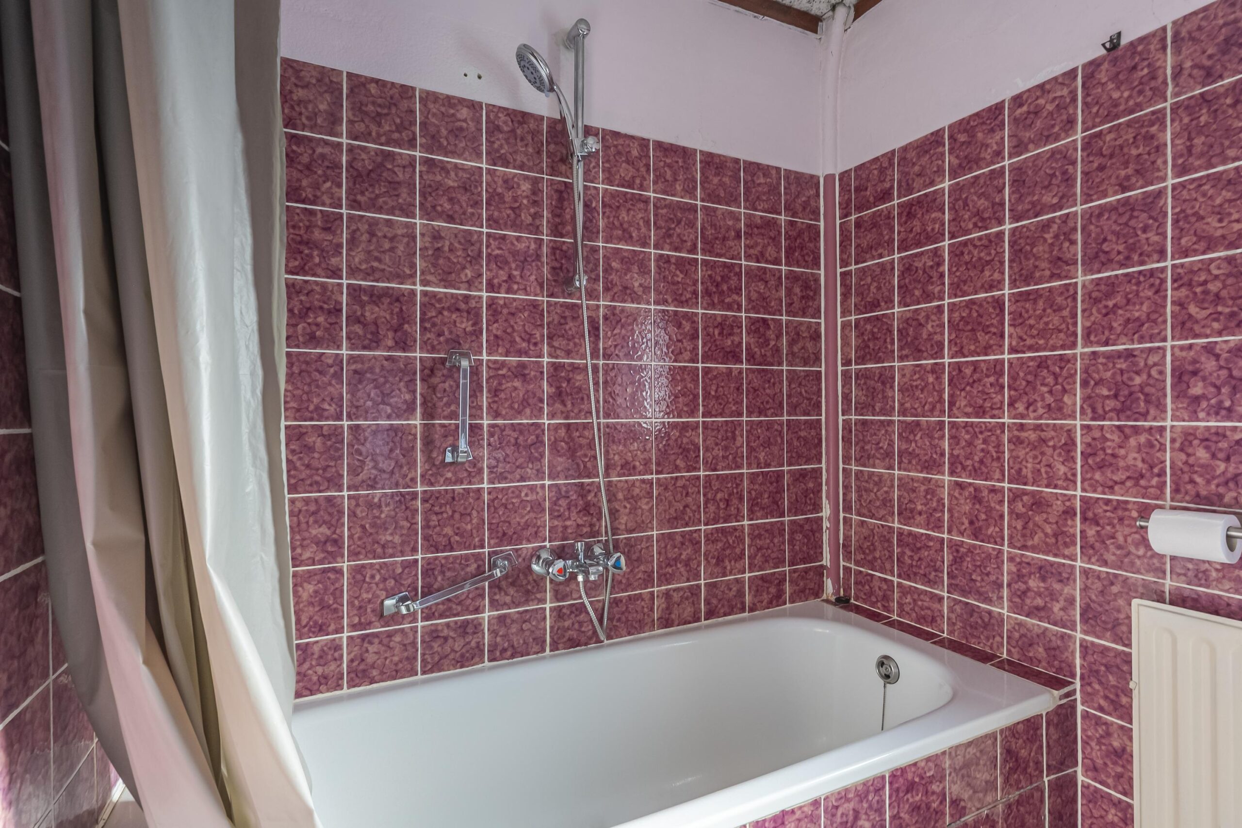 De deels betegelde badkamer is groot ca. 4 m² en is voorzien van een ligbad, wastafel en een staand toilet.