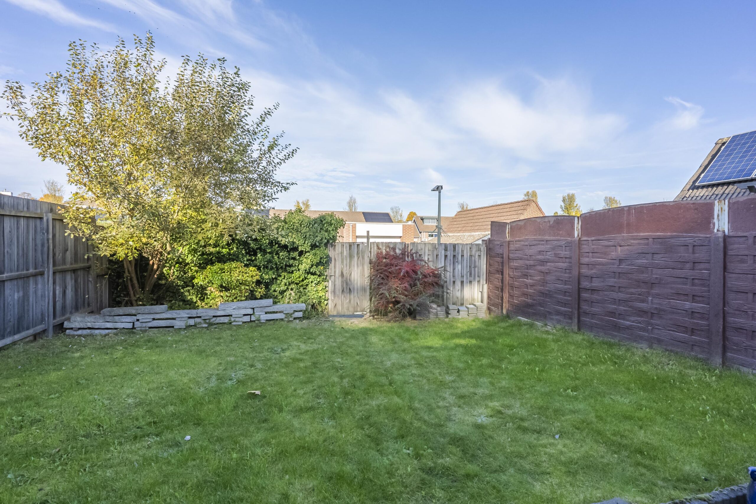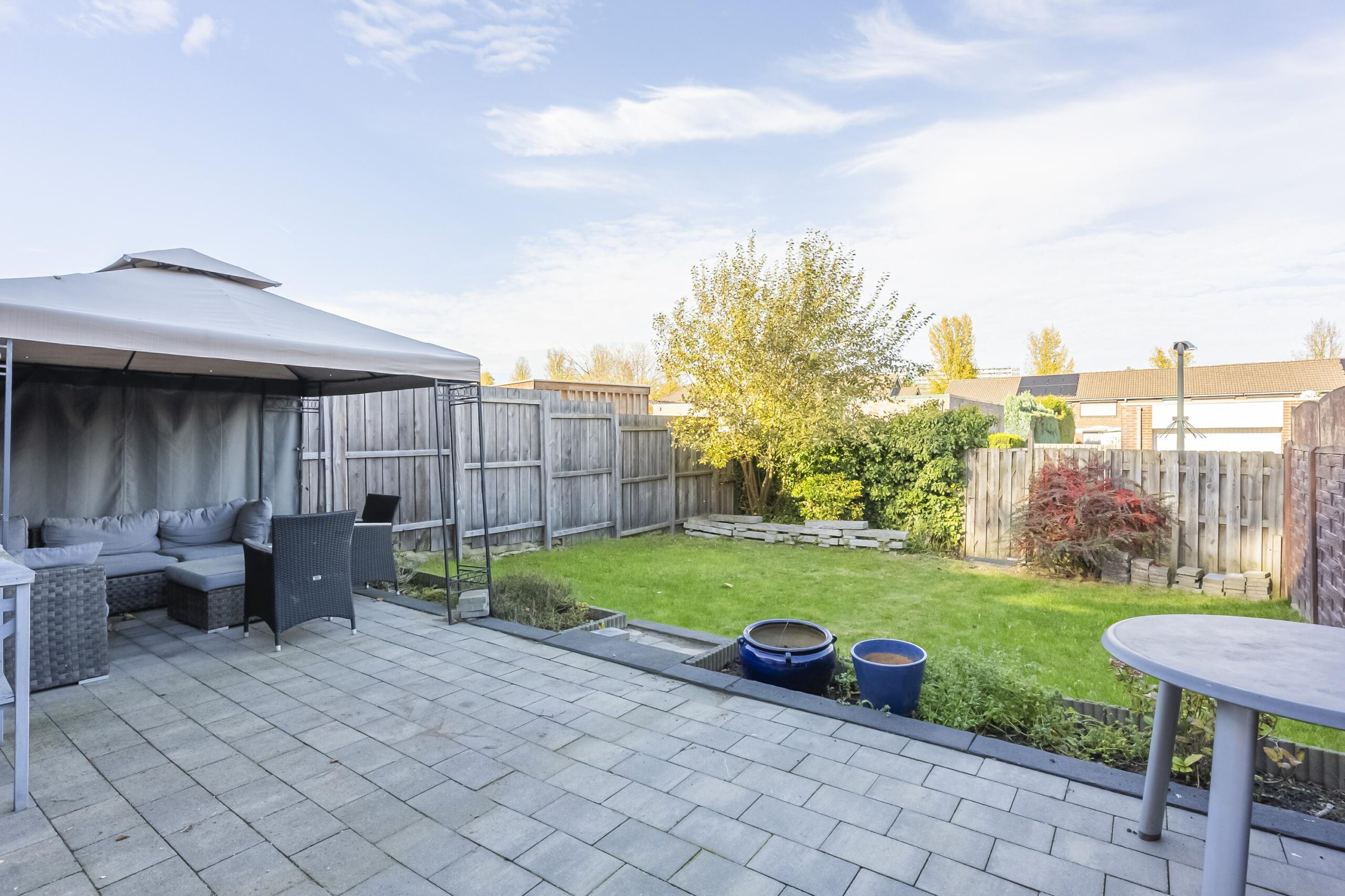 De achtertuin is gelegen op het noordwesten en is voorzien van een ruim terras met pergola, een gazon en een achteringang.