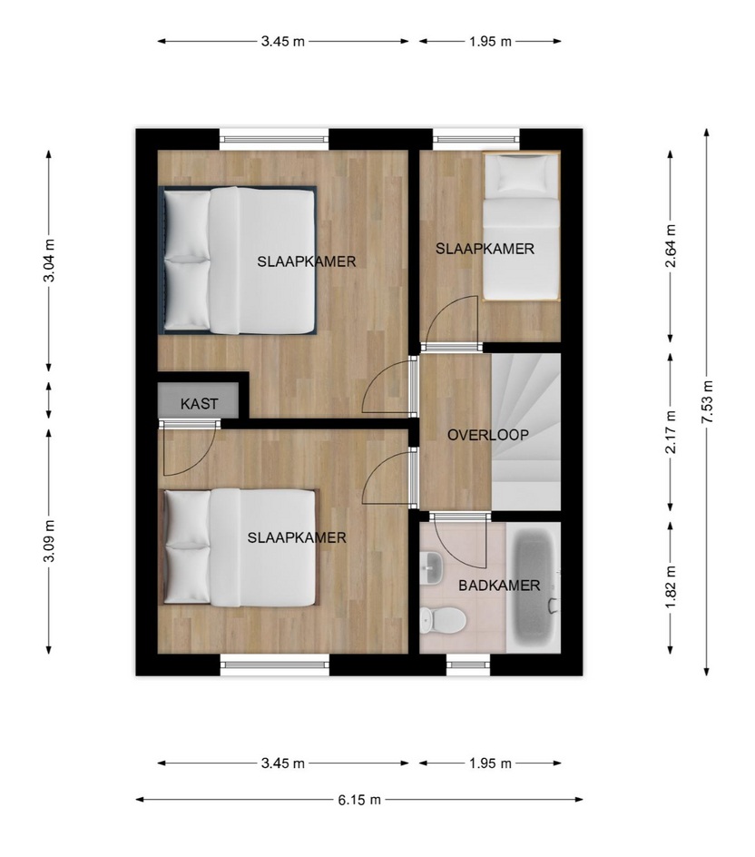 De overloop biedt toegang tot 3 slaapkamers en de badkamer.