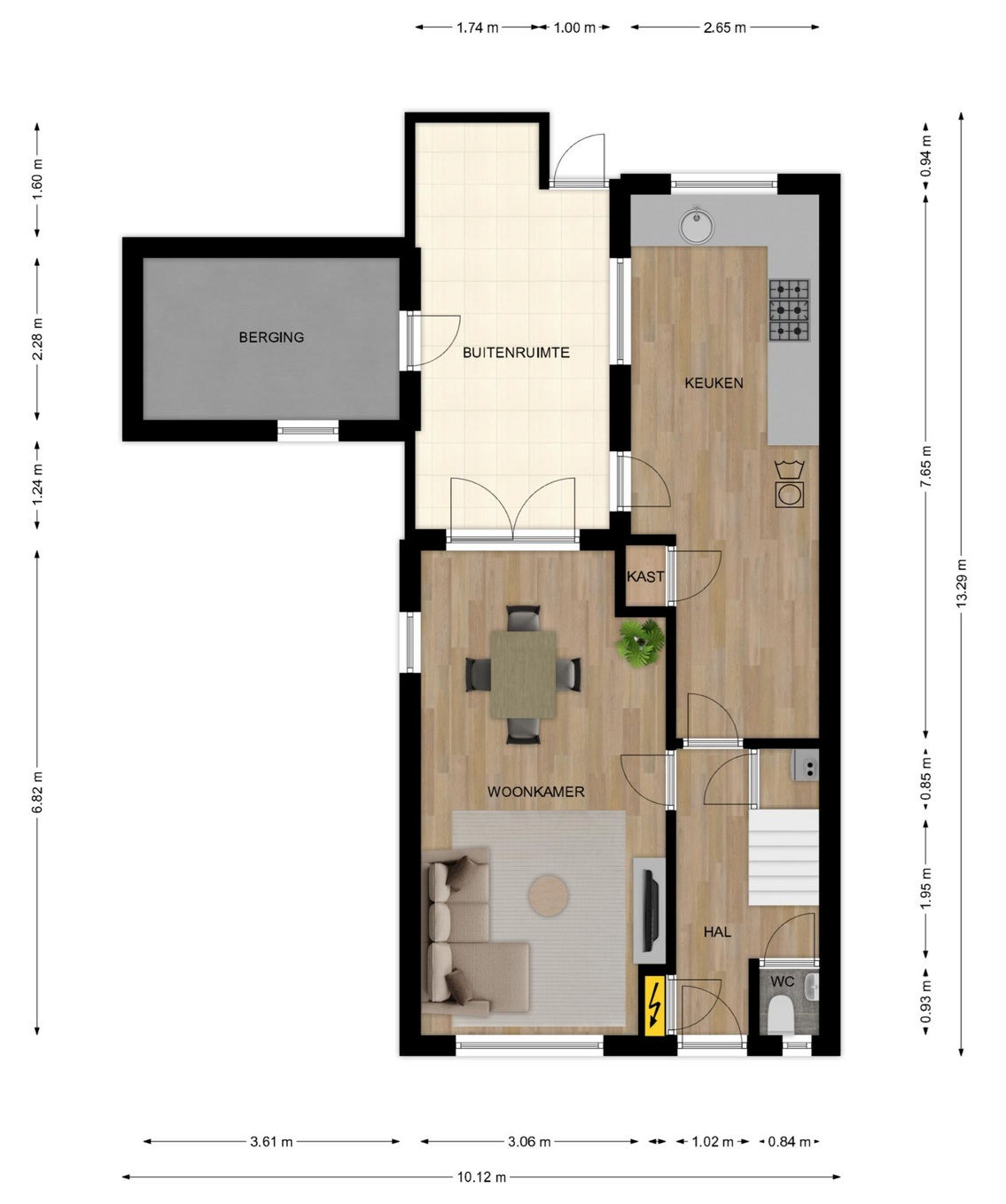 Vanuit de keuken is de ruime overdekte buitenruimte te bereiken. Vanuit de buitenruimte is de achtertuin en de stenen berging te bereiken.