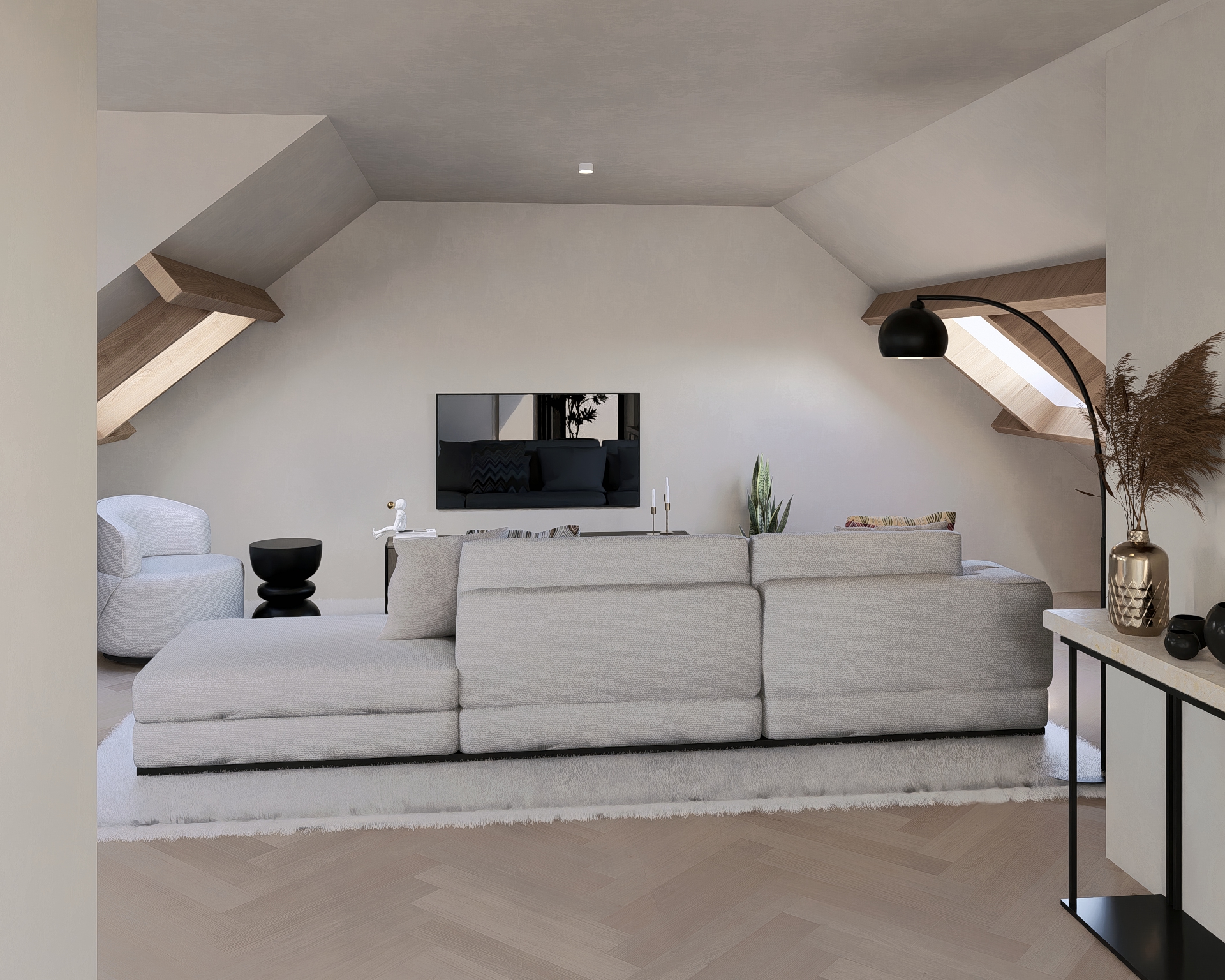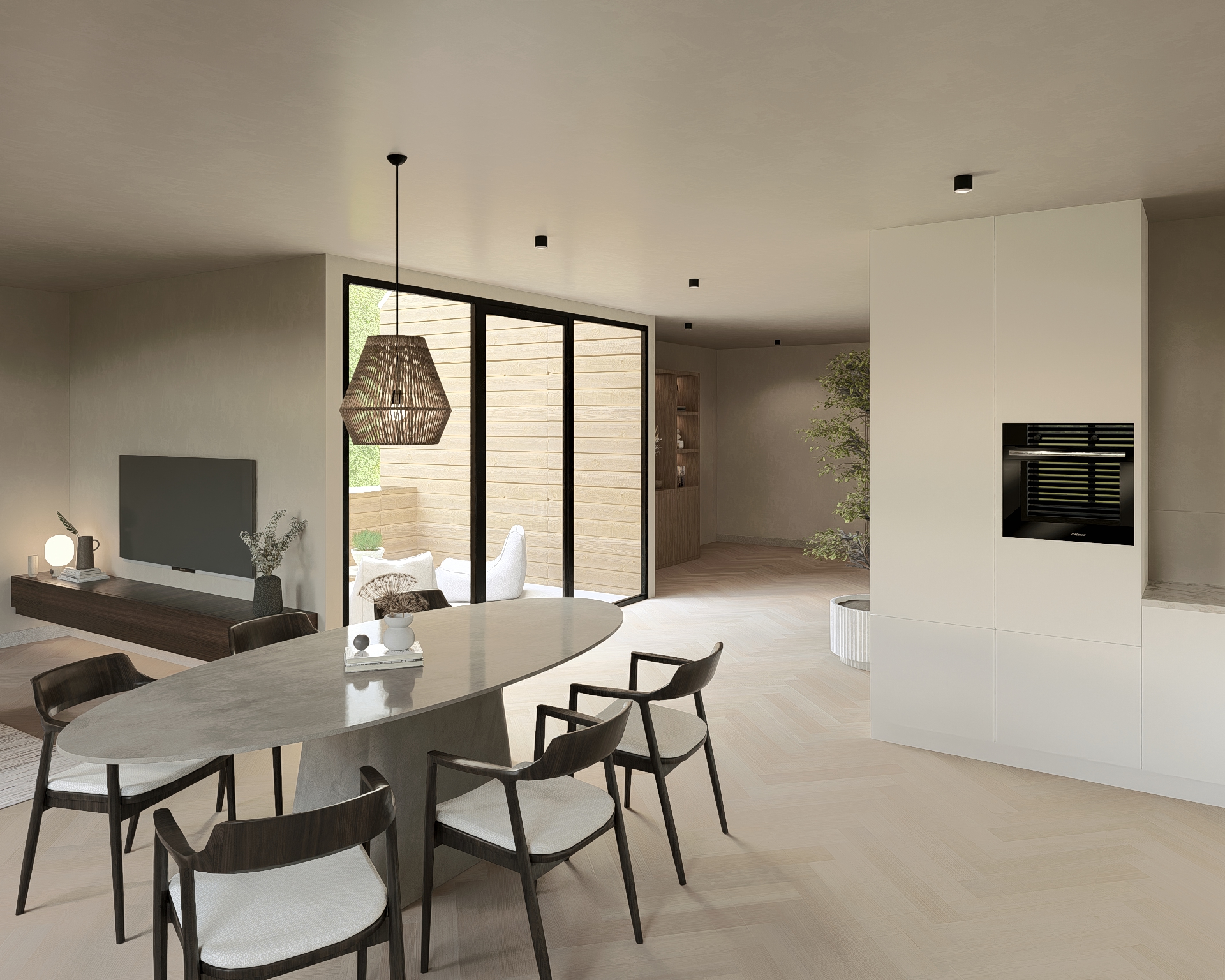 De privé-hal biedt toegang tot de toiletruimte en de woonkamer. De L-vormige woonkamer met open keuken (5.85 x 4.85 en 5.10 x 2.50) heeft een totale oppervlakte van maar liefst ongeveer 42 m² en is voorzien van een hoogwaardige PVC-vloer met behaaglijke vloerverwarming. De moderne keukeninstallatie is voorzien van de navolgende apparatuur: Bora inductiekookplaat met ingebouwde afzuiging, oven, vaatwasser en een koel-vriescombinatie.