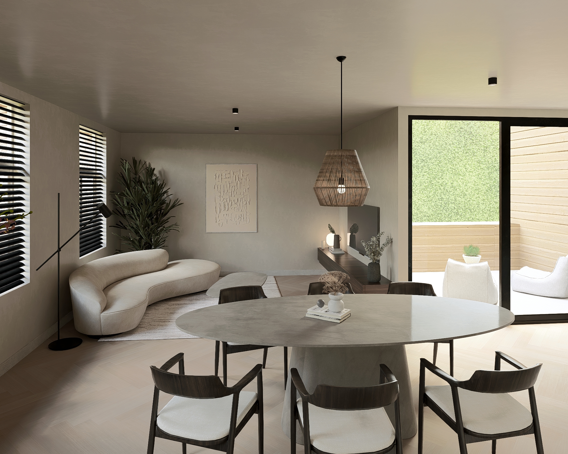 De privé-hal biedt toegang tot de toiletruimte en de keuken. De ruime L-vormige woonkamer (5.85 x 4.85 en 5.10 x 2.50) met open keuken heeft een totale oppervlakte van maar liefst 42 m² en is voorzien van een hoogwaardige PVC-vloer met een behaaglijke vloerverwarming. De moderne keuken is voorzien van de navolgende inbouwapparatuur: Bora inductiekookplaat met ingebouwde afzuiging, oven, vaatwasser en een koel-vriescombinatie.