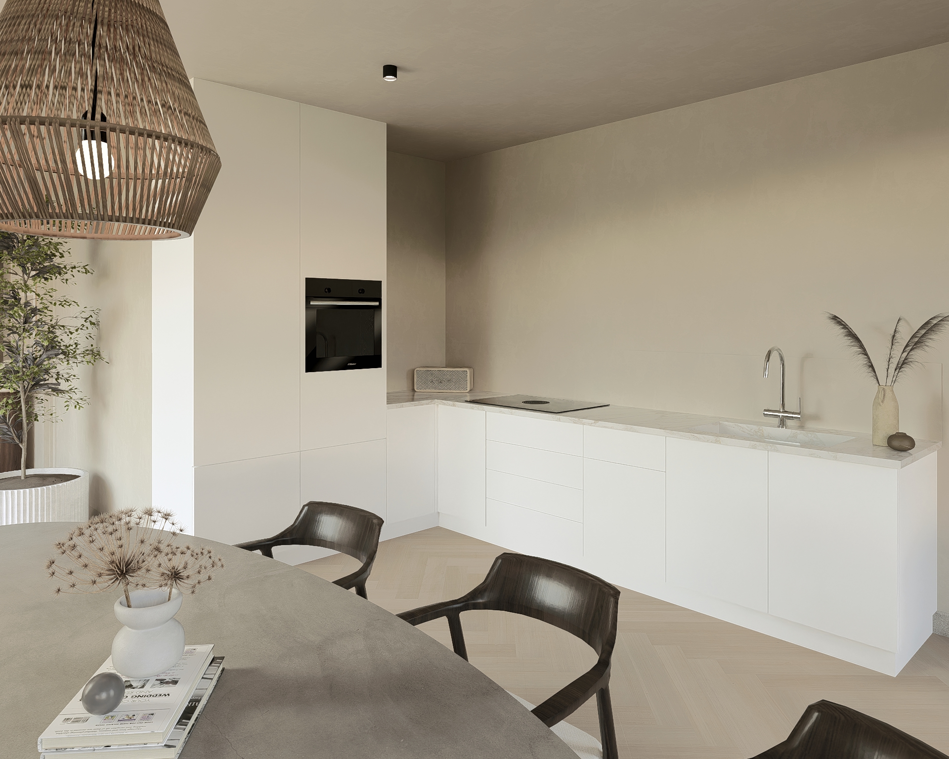 De moderne keuken in L-opstelling is voorzien van de navolgende apparatuur: Bora inductiekookplaat met ingebouwde afzuiging, oven, vaatwasser en een koel-vriescombinatie. De keuken heeft een centrale ligging in de ruimte waardoor deze het hart van de ruimte vormt.