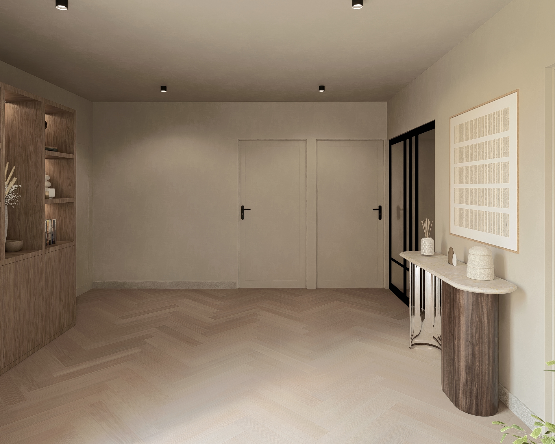 In de privé-hal van het appartement is de toiletruimte. De woonkamer en keuken zijn royaal van opzet en zijn I-vormig, de keukeninstallatie vormt de verbinding tussen zitkamer en eetkamer. De keuken is voorzien van de navolgende inbouwapparatuur: Bora inductiekookplaat met ingebouwde afzuiging, oven, vaatwasser en een koel-vriescombinatie.