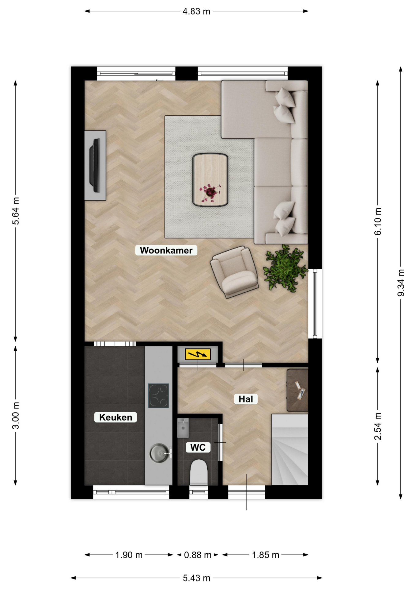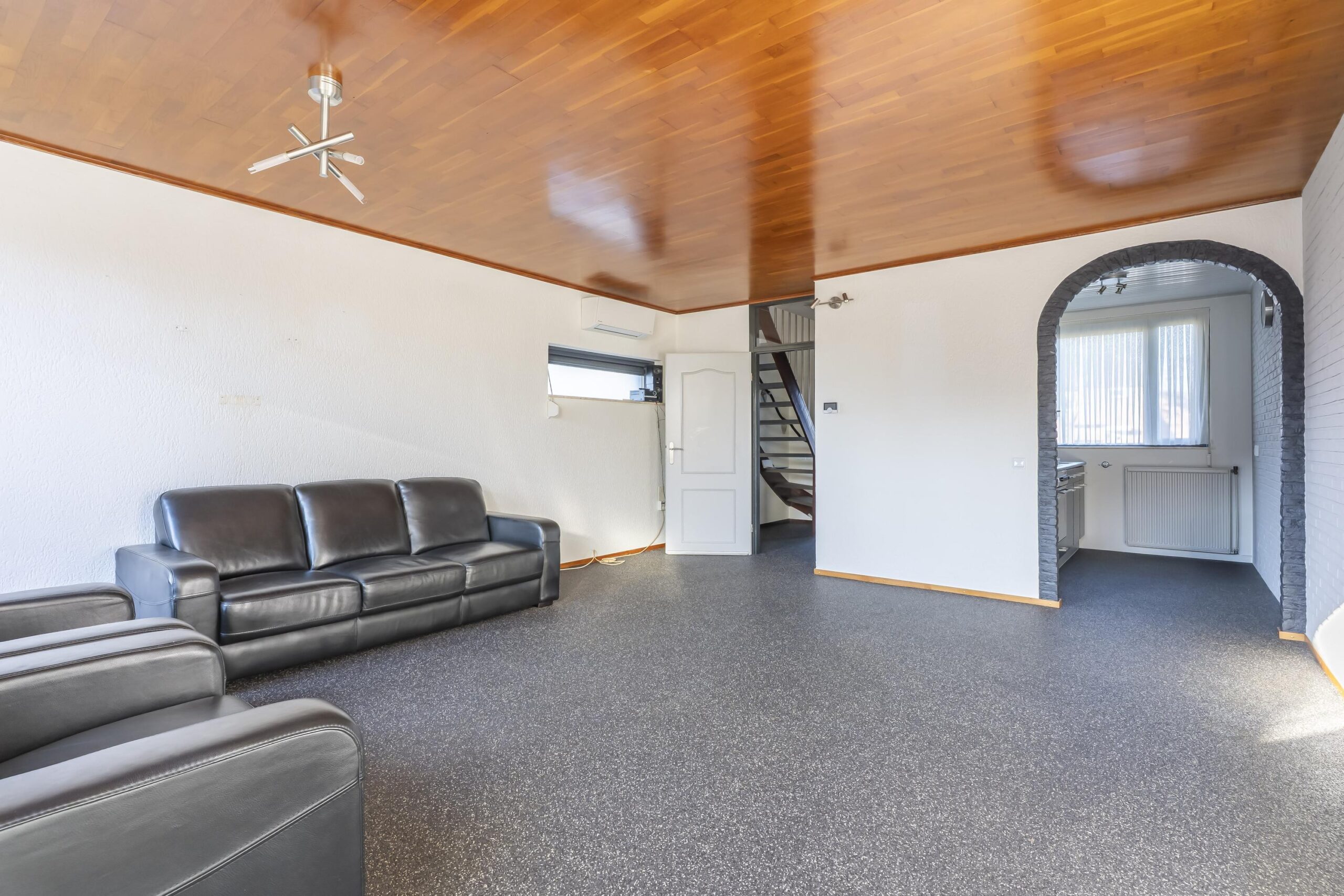 De sfeervolle woonkamer is afgewerkt met een siergrindvloer, airconditioning en beschikt over een schuifpui wat zorgt voor een prettige lichtinval en een goede verbinding met de tuin.