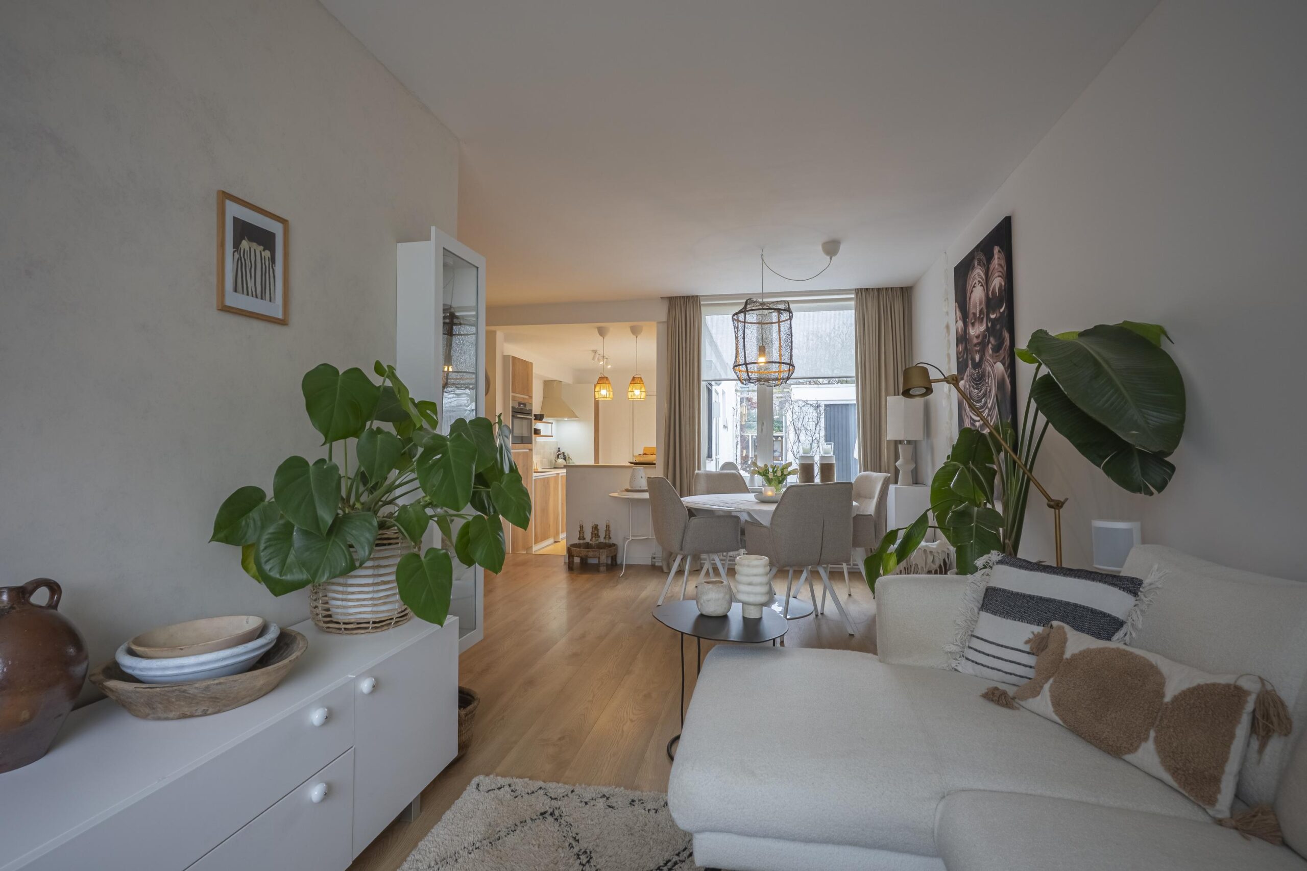 Begane grond: voortuin, oprit, entree, hal met doorlopende laminaatvloer, trappenhuis en de moderne meterkast. De L-vormige woonkamer heeft een nieuw gestorte vloer voorzien van isolatie en strak gestuckte wanden en heeft een open verbinding met de leefkeuken die in de aanbouw is gerealiseerd. De keuken met beton ciré vloer heeft een keuken-installatie (bj. 2022) voorzien de nodige apparatuur zoals een inductie-kookplaat, afzuigkap, vaatwasser, combi-oven en koelkast. Aansluitend is hier de badkamer gelegen. Deze biedt plaats aan een vrijstaand bad, een inloopdouche, badmeubel en toilet. De praktische bijkeuken sluit hier op aan en heeft een wasmachine- en drogeraansluiting en ook de C.V.-installatie en omvormer bevinden zich hier.