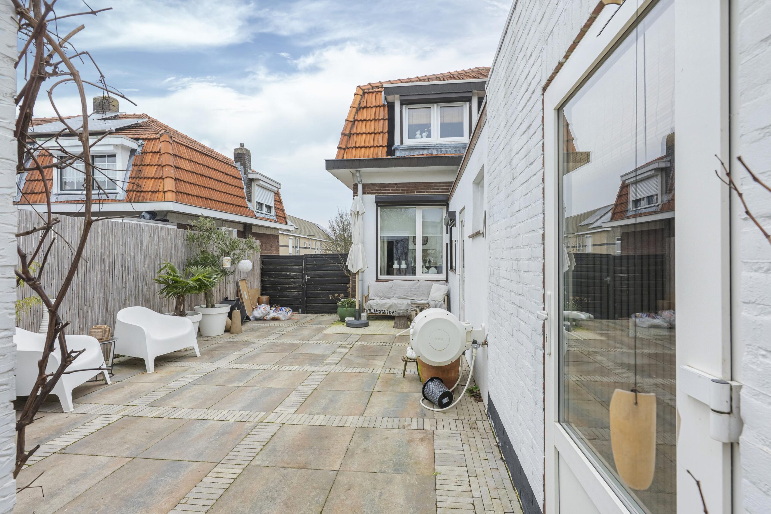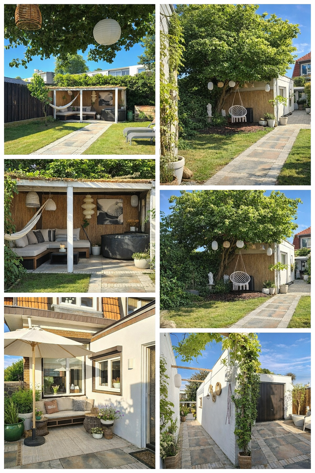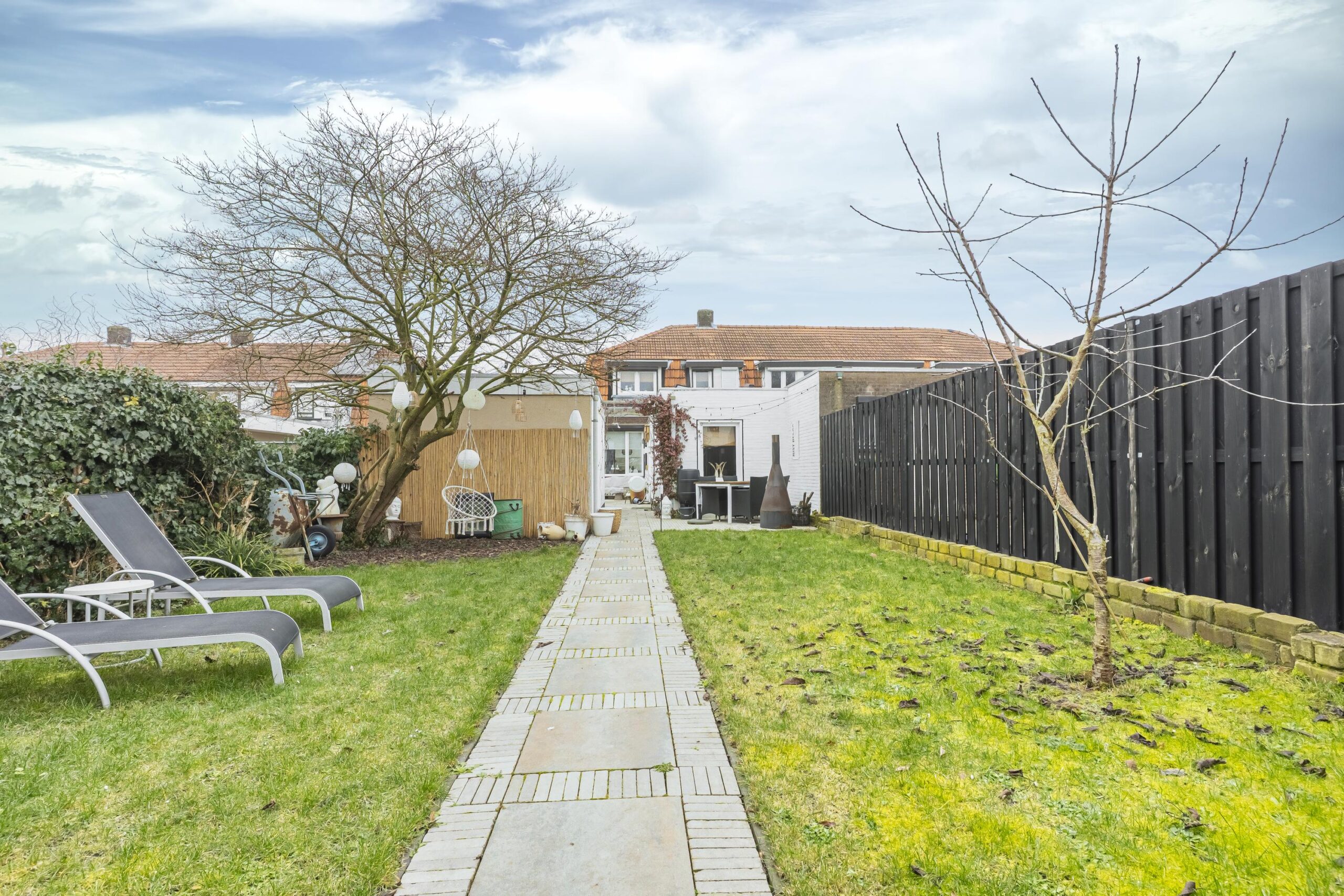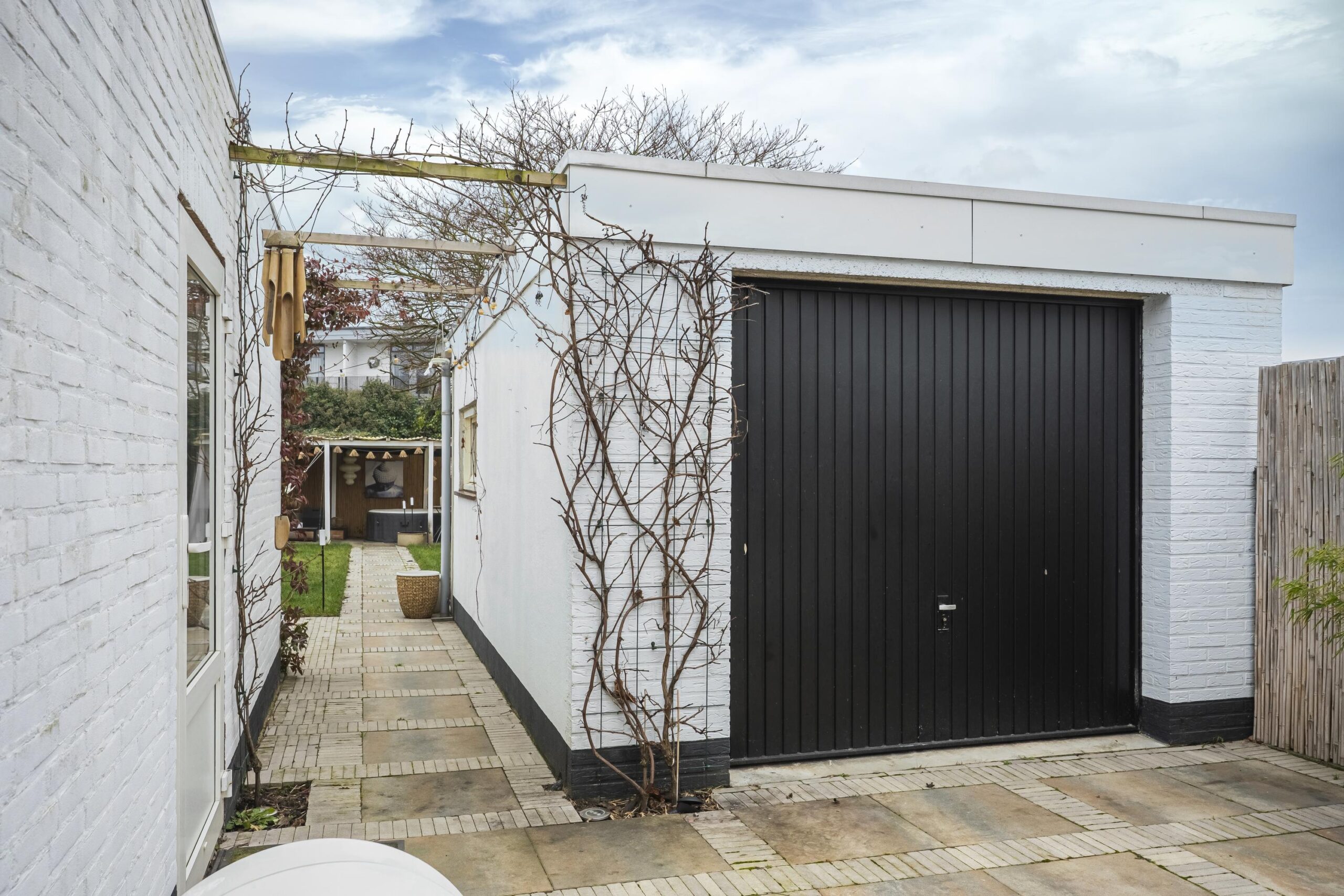 De tuin is zowel bereikbaar vanuit de keuken alsook de bijkeuken. Ook deze is recentelijk nieuw aangelegd met terras, overkapping en gazon en is geheel omsloten. De vrijstaande garage zorgt voor een afscheiding tussen terras en gazon gedeelte en biedt plaats aan het stalle één auto en natuurlijk fietsen ed.