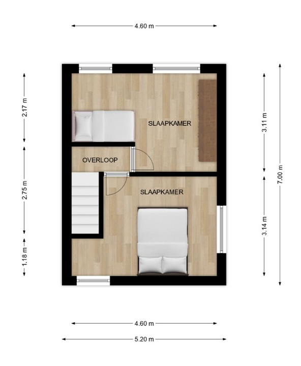 Eerste verdieping: overloop, twee slaapkamers – origineel 3 – maar nu is een slaapkamer één open geheel met een open kastruimte.