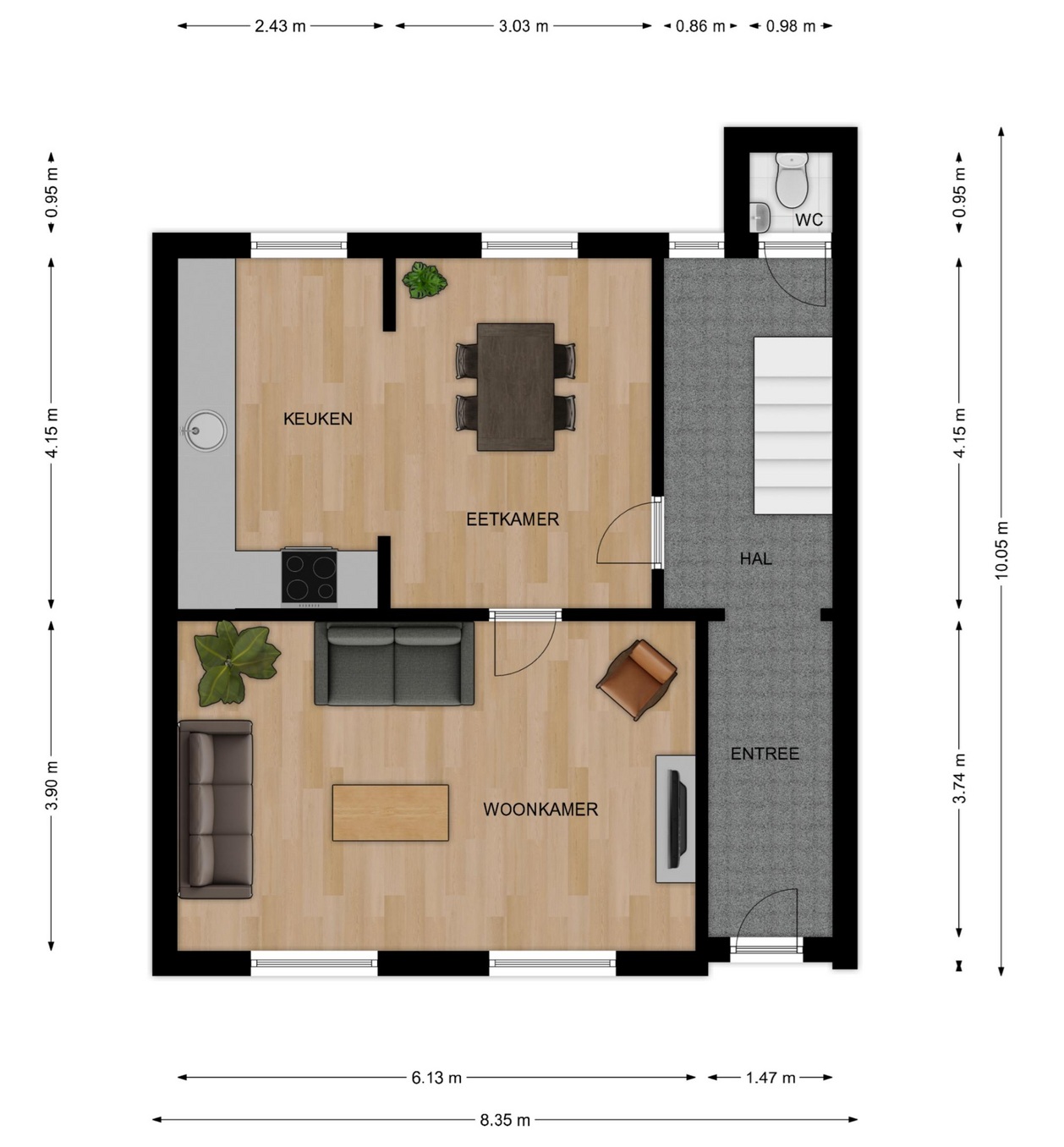 Begane grond: entree, hal met vloerbedekking die de originele tegelvloer bedekt. Garderobe, meterkast, trappenhuis met bordestrap en het toilet. De woonkamer heeft een parketvloer en een plafond van systeemplaten en is in open verbinding met de woonkeuken voorzien van een keurige keuken-installatie in hoekopstelling voorzien van koelkast, kookplaat, oven en vaatwasser.