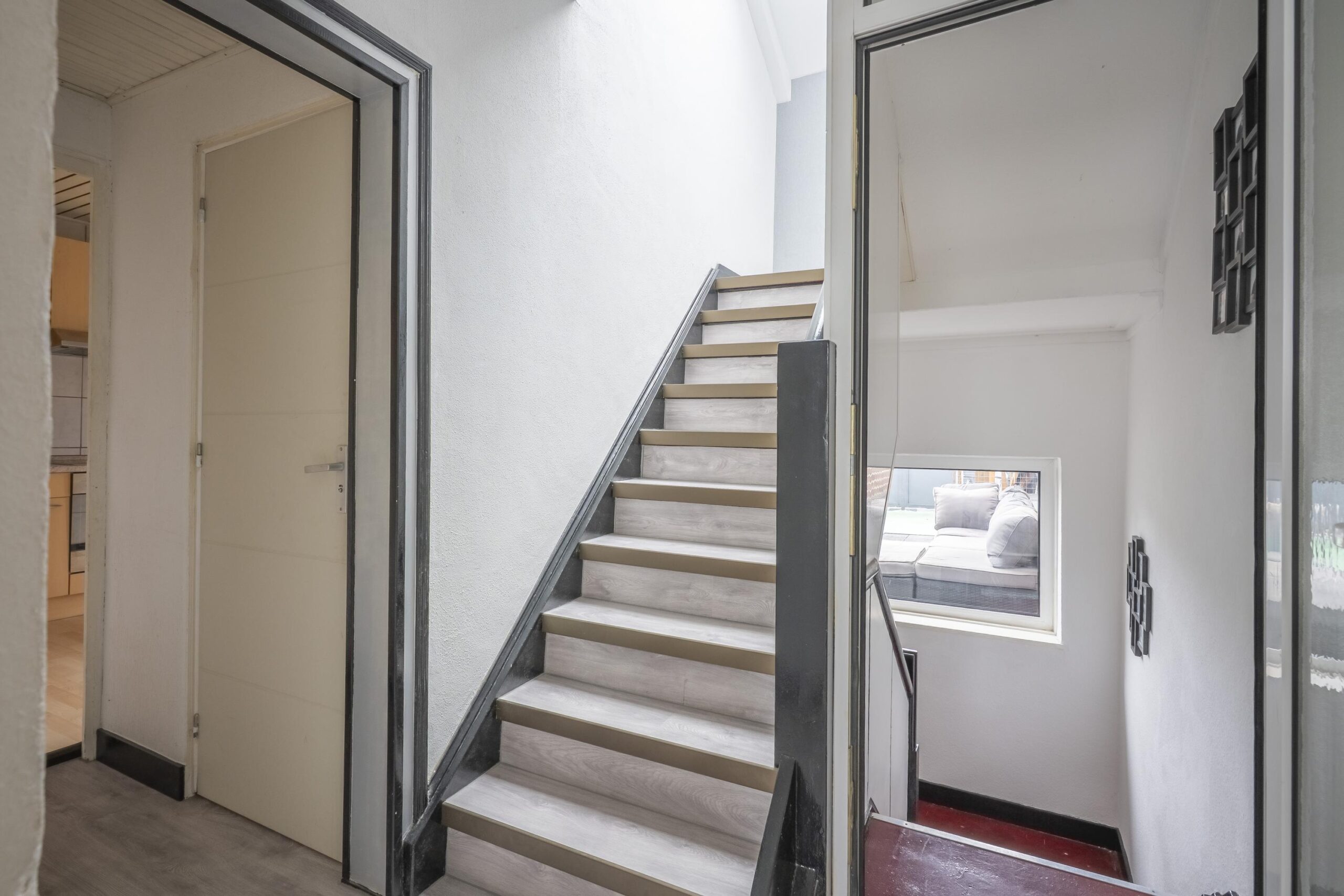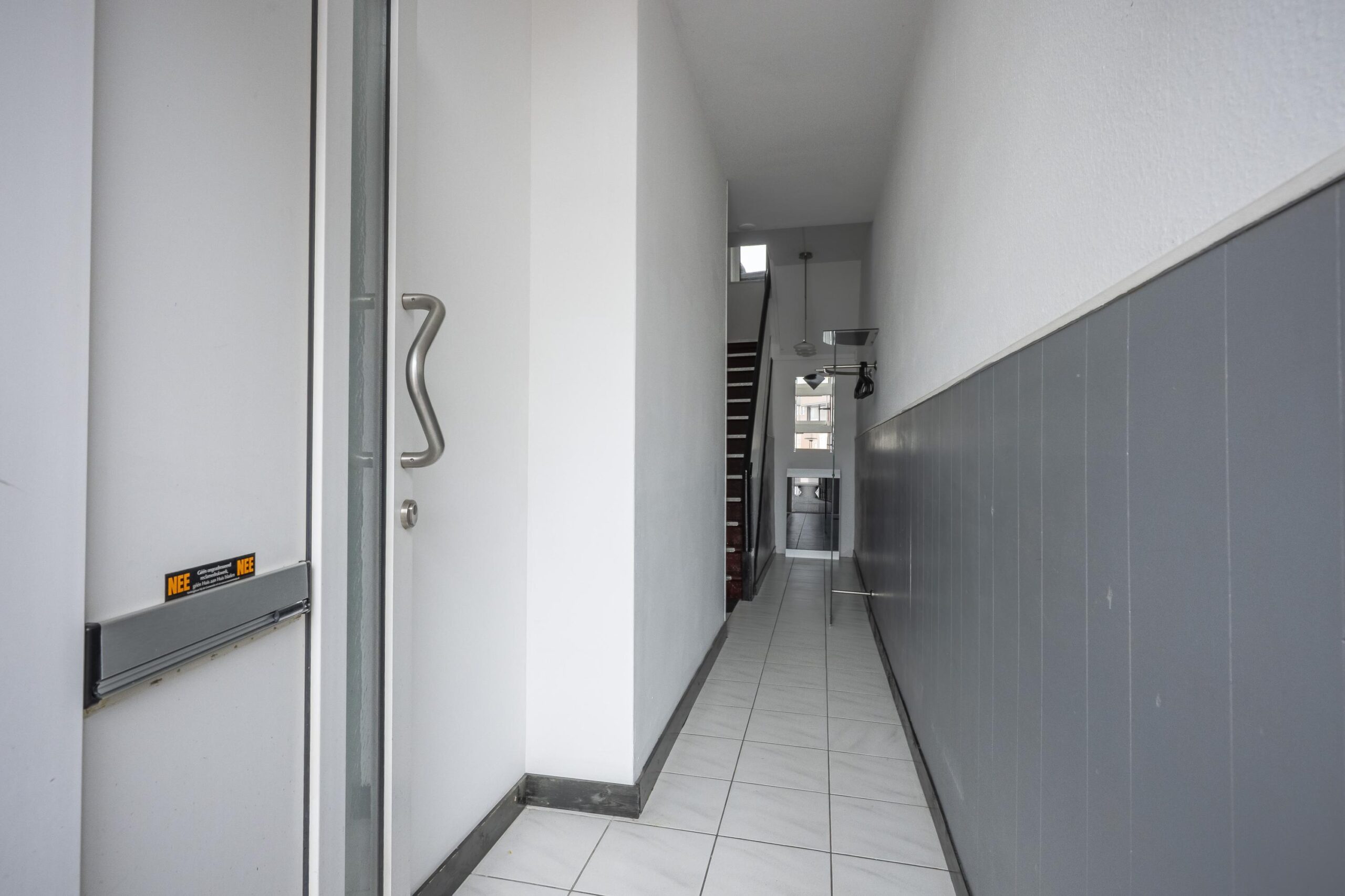 Begane grond: eigen entree, betegelde gang met moderne meterkast, garderobe en trappenhuis naar verdieping.