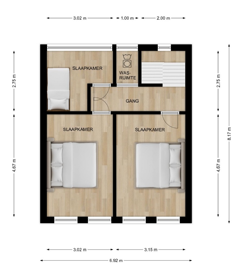 Tweede verdieping: vanuit de overloop is er toegang tot drie slaapkamers, allen voorzien van laminaatvloer, waarvan één slaapkamer is uitgebouwd met een dakkapel. Tevens is er onder de schuinte van het dak een wasruimte gerealiseerd.