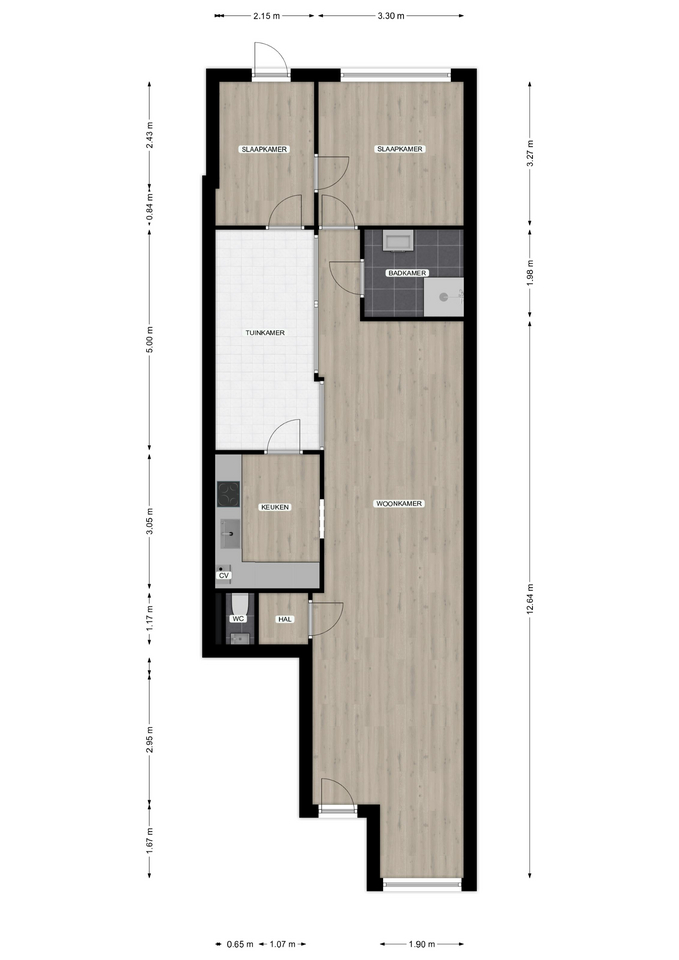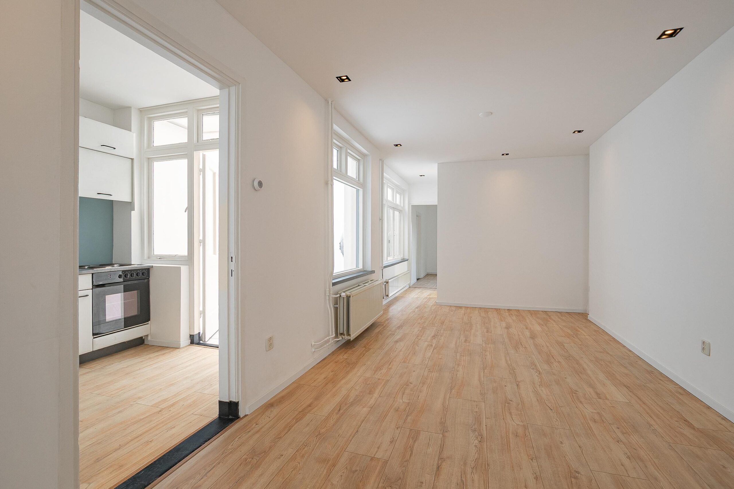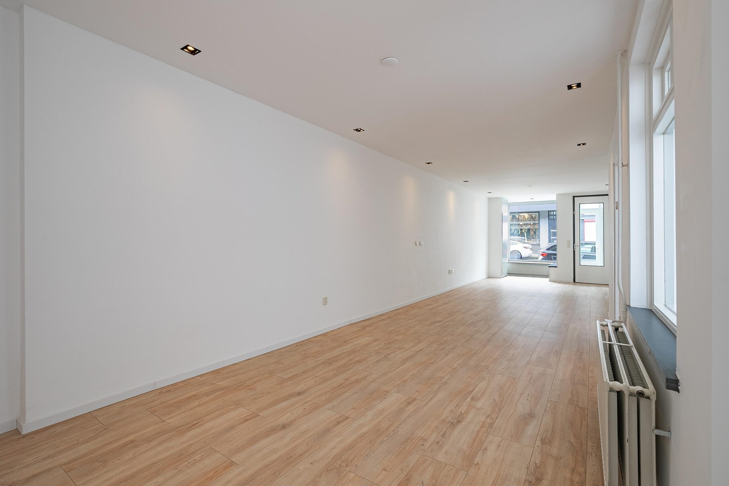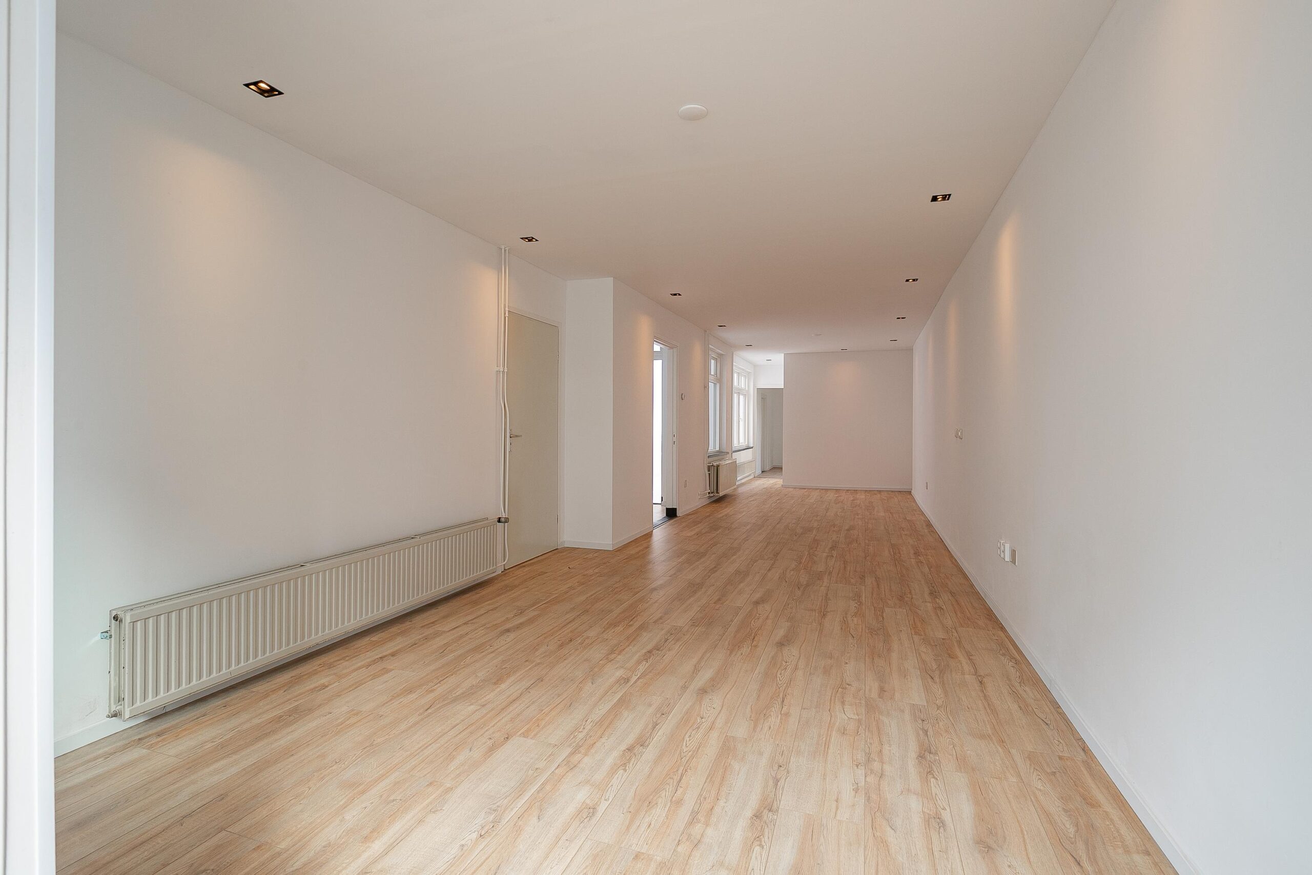 De woonkamer is groot ca. 12,50 x 3,20 m. en is voorzien van een laminaatvloer en strak gestucte muren.