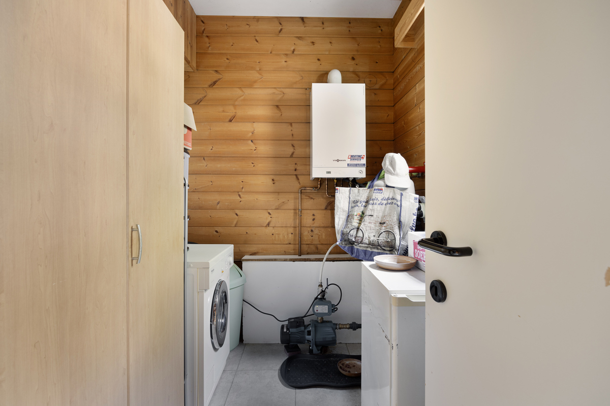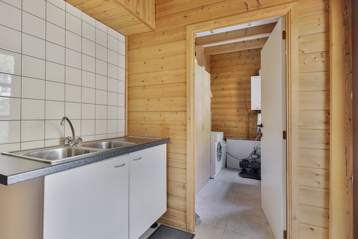 Praktische bijkeuken met dubbele wastafel, aansluiting voor wasmachine en achterinkom