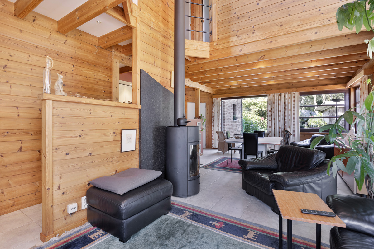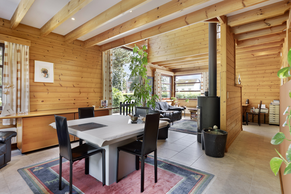Ruime, open leefruimte met eetkamer en houtkachel, gezellig zitgedeelte en ingerichte open keuken
