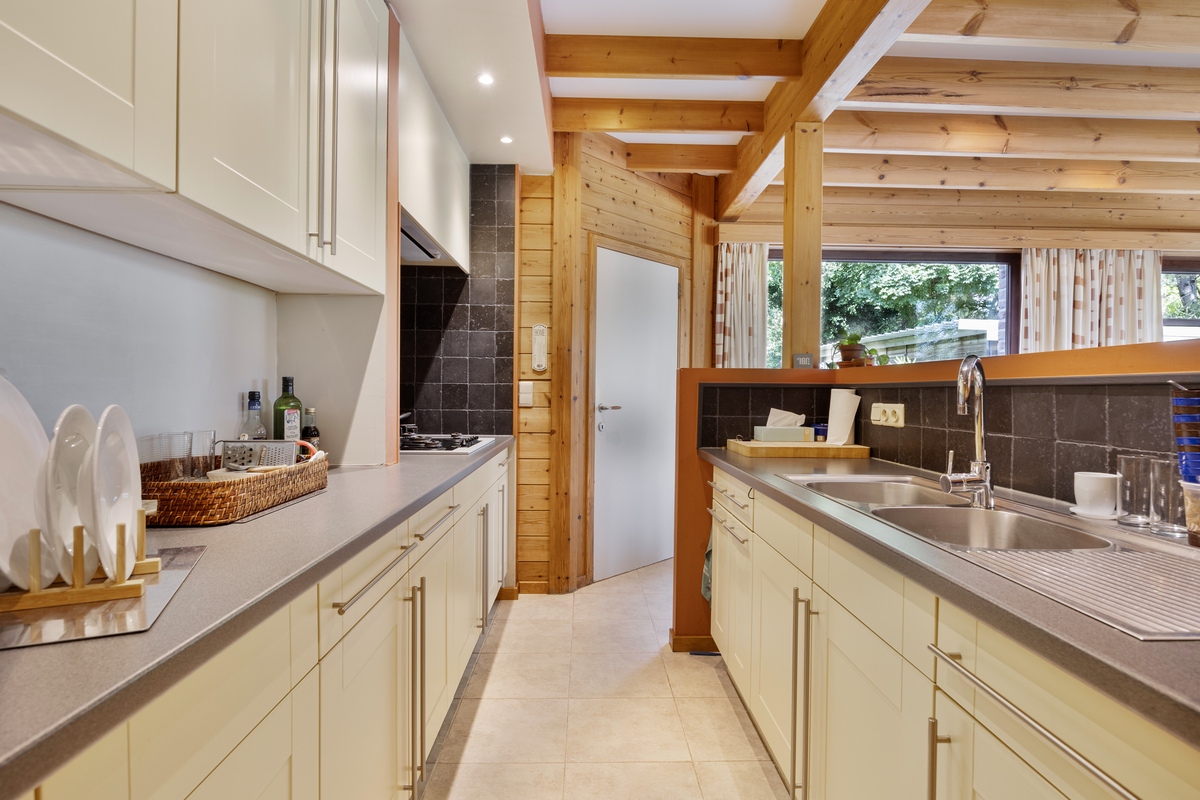 Praktische bijkeuken met dubbele wastafel, aansluiting voor wasmachine en achterinkom