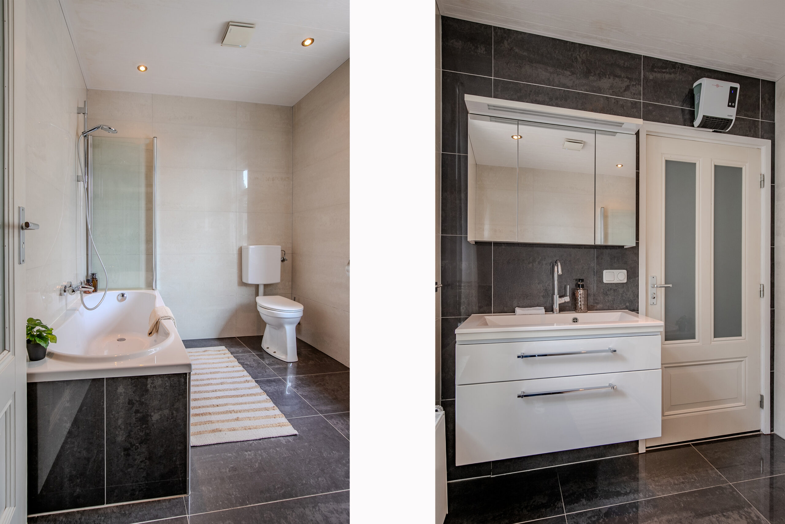 Vanuit een tussenportaal bereiken we de badkamer. Deze is neutraal betegeld met een donkere vloertegel en een deels donkere en deels witte tegel op de wanden. De ruimte is compleet ingericht met: een ligbad, toilet en een wastafel. Een fijne plek om even heerlijk tot rust te komen na een drukke (werk)dag.