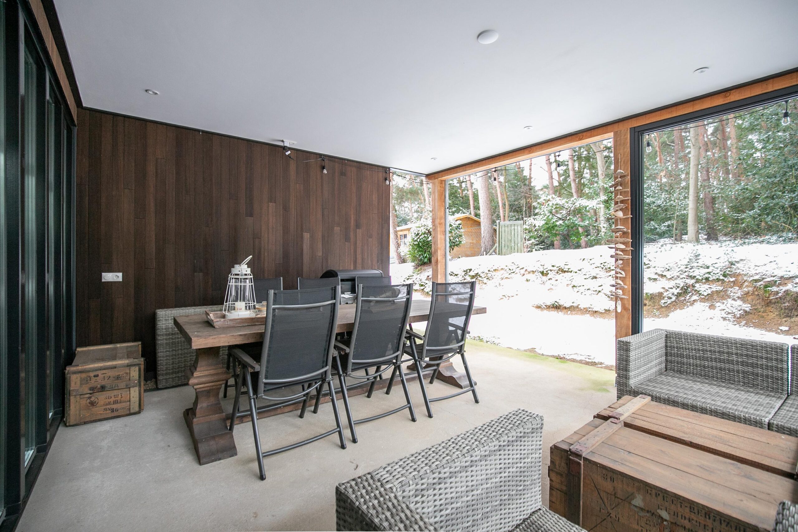 Aan de slaapkamer grenst bovendien een fraaie overkapping met veel glas, die bijna als een serre aanvoelt. Hier kunt u het hele jaar door beschut genieten van de tuin en de rust van de omgeving.