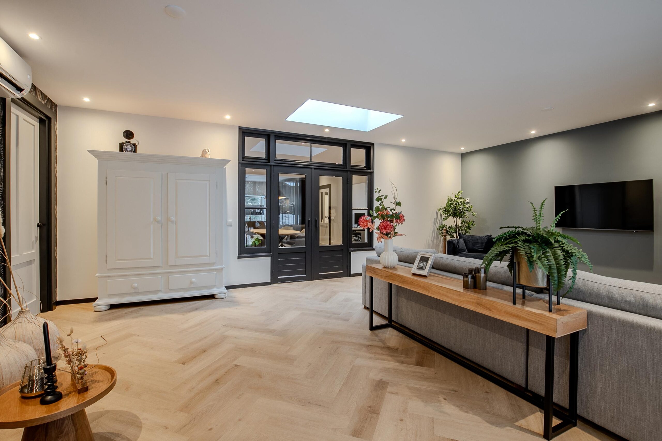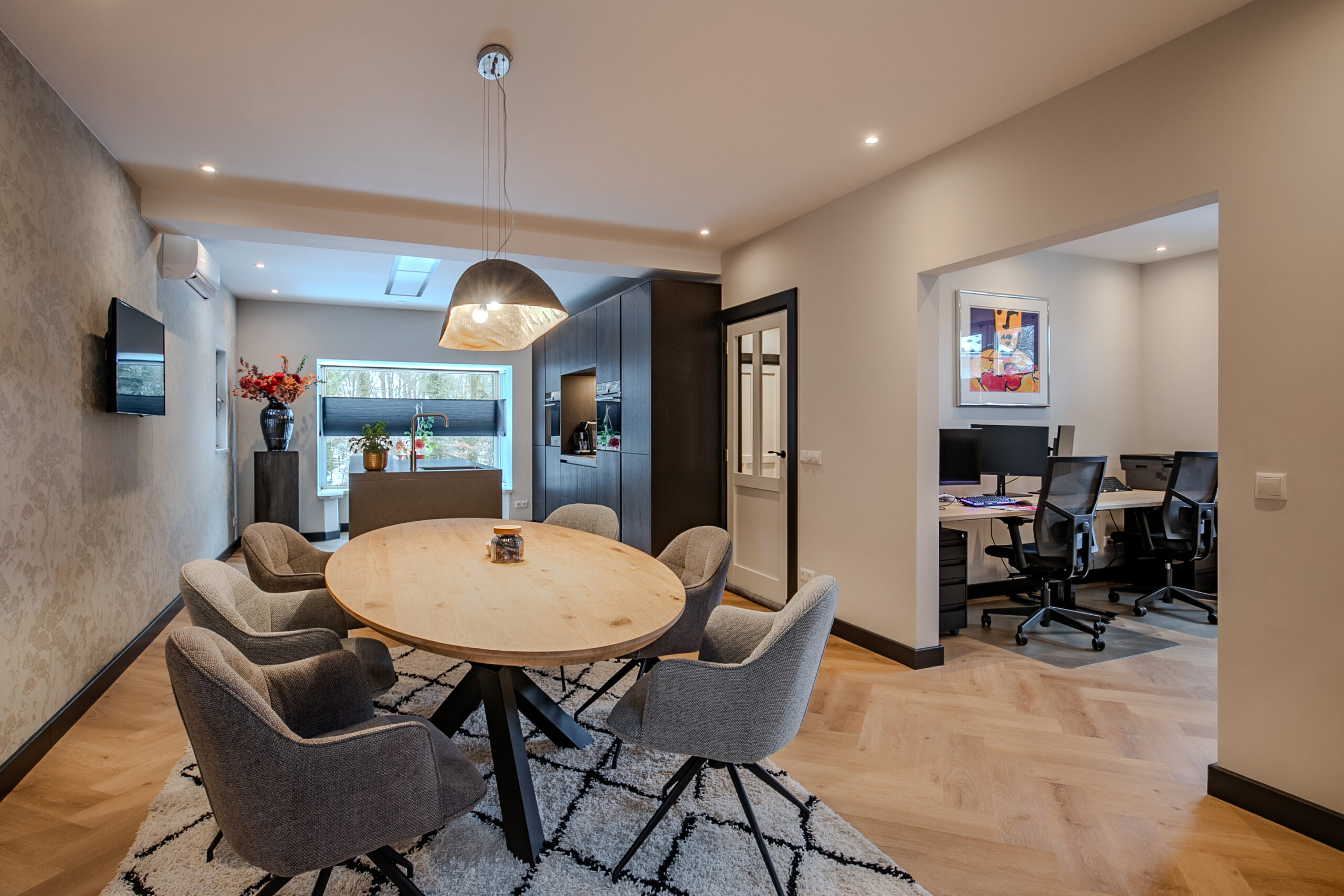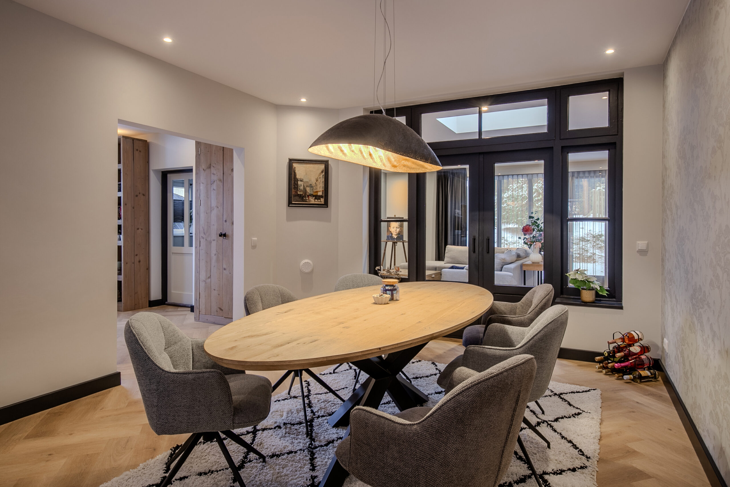 Bij binnenkomst wordt u verwelkomd in een ruime en stijlvolle hal, die direct de sfeer van de woning weerspiegelt: modern, warm en tot in detail verzorgd. Vanuit hier loopt u door naar de eetkamer, een centrale plek in huis waar ruimte, licht en functionaliteit samenkomen.