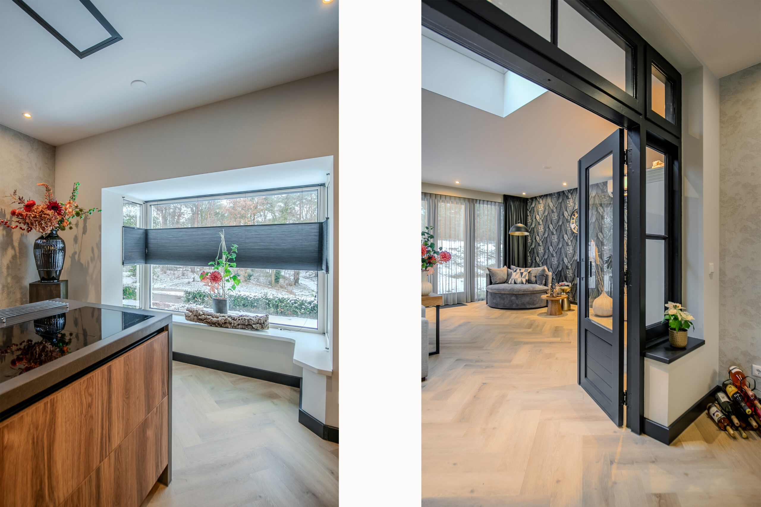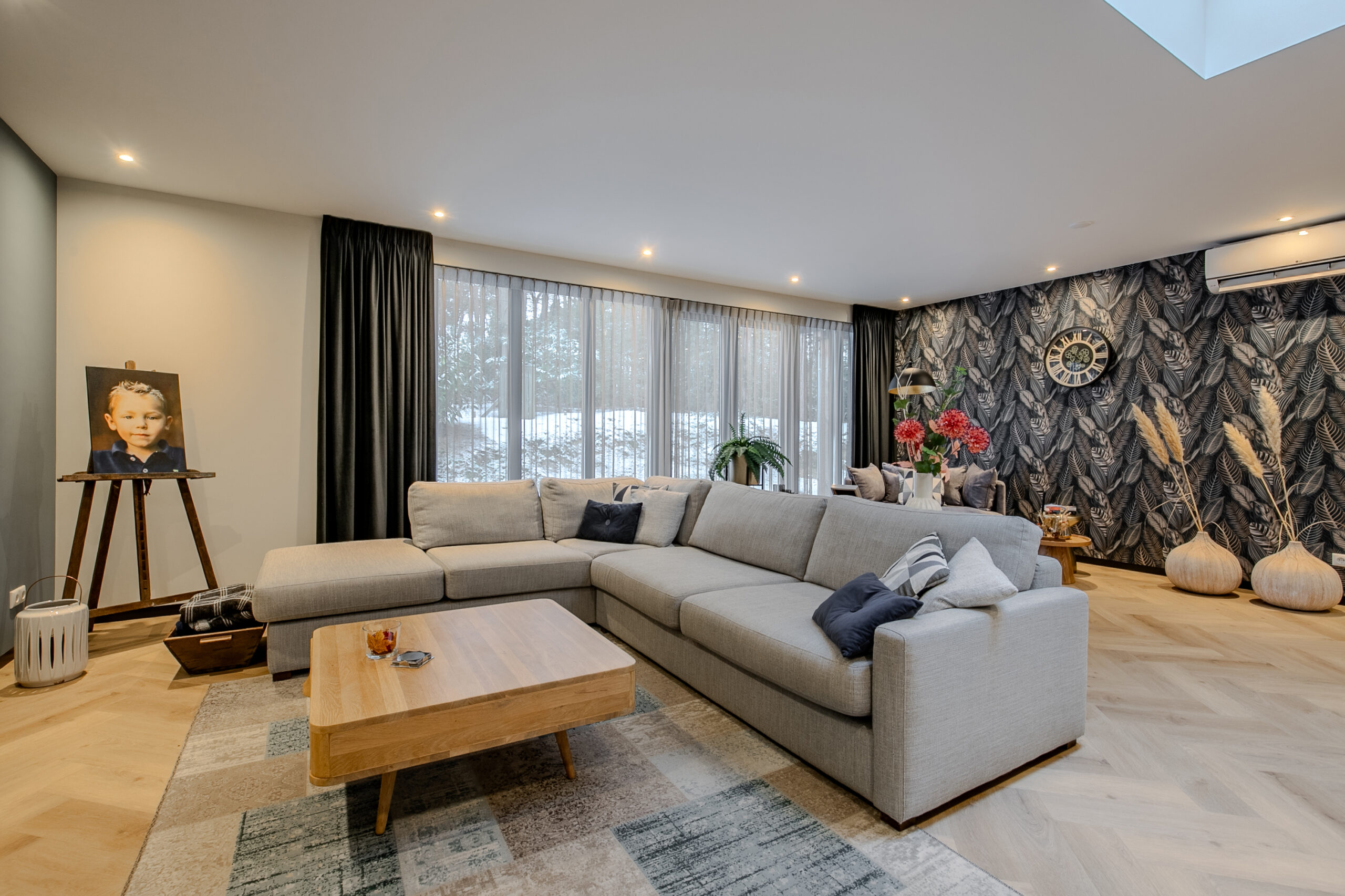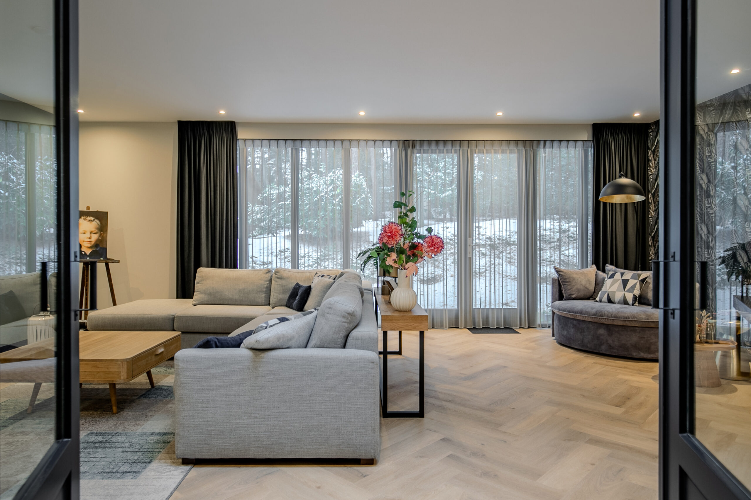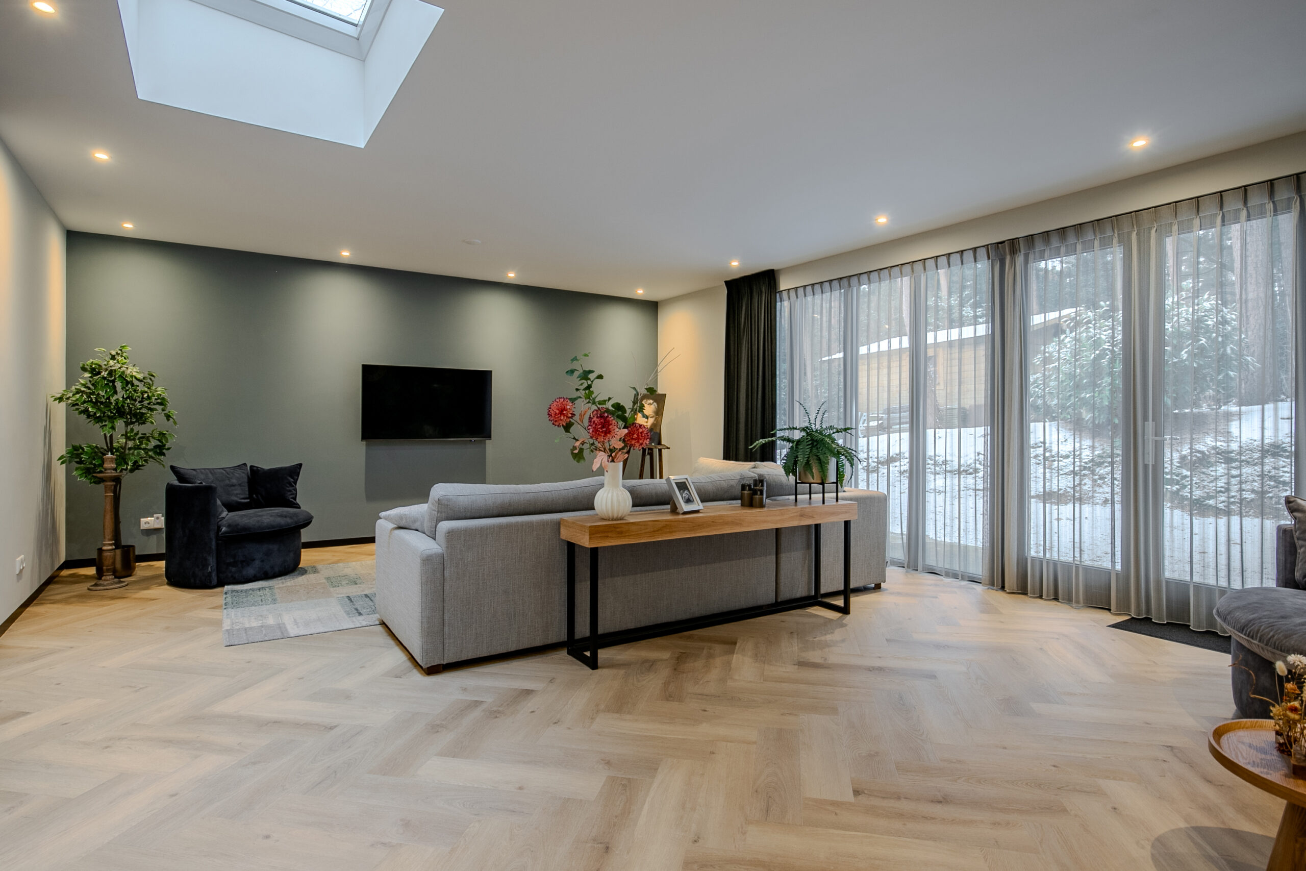 De woonkamer is een bijzonder lichte en sfeervolle ruimte dankzij de vele en grote raampartijen. Het buitengevoel wordt hier naar binnen gehaald, terwijl de afwerking en het interieur volledig in lijn zijn met de rest van de woning. De ruimte straalt rust en luxe uit en biedt volop mogelijkheden voor een comfortabele zithoek met uitzicht op het groen.