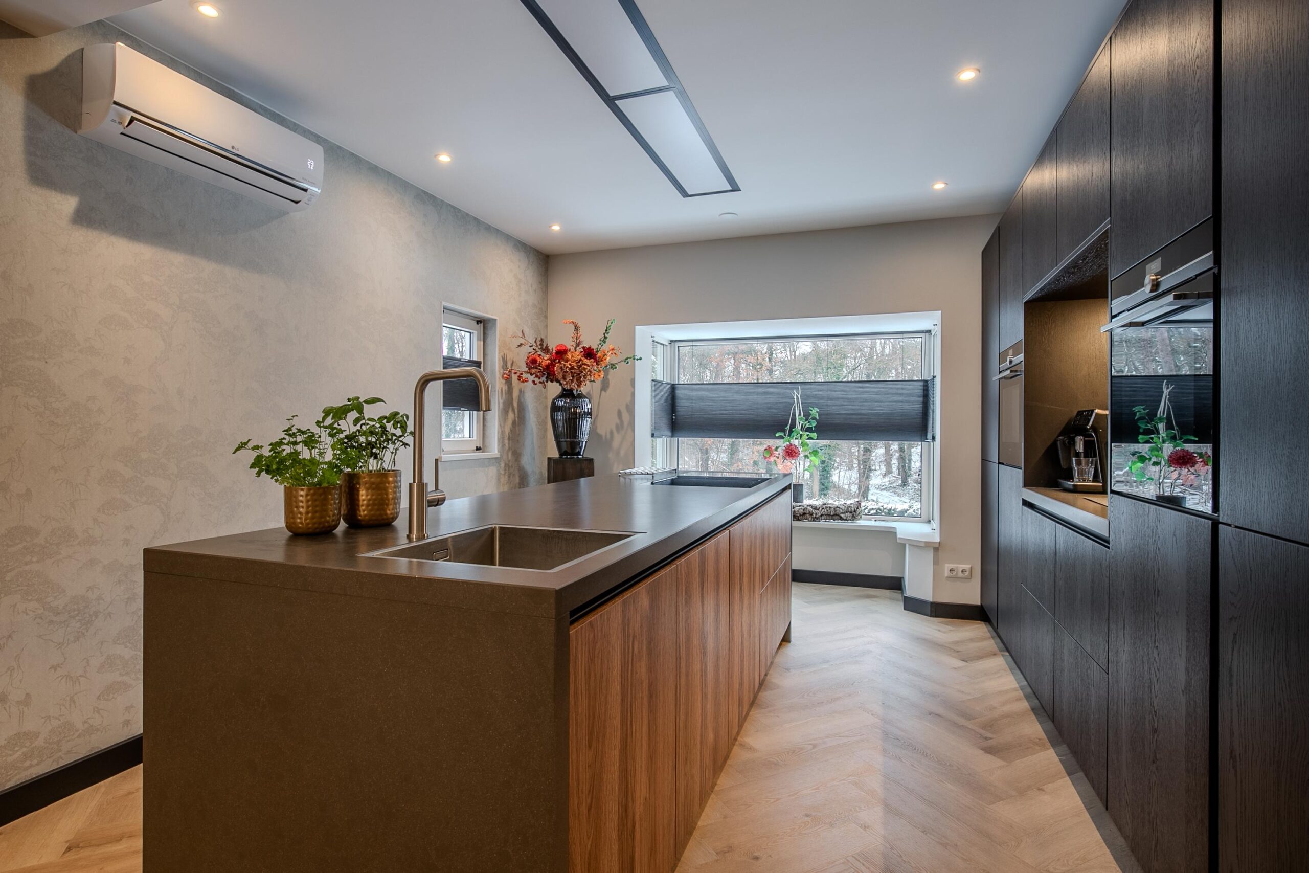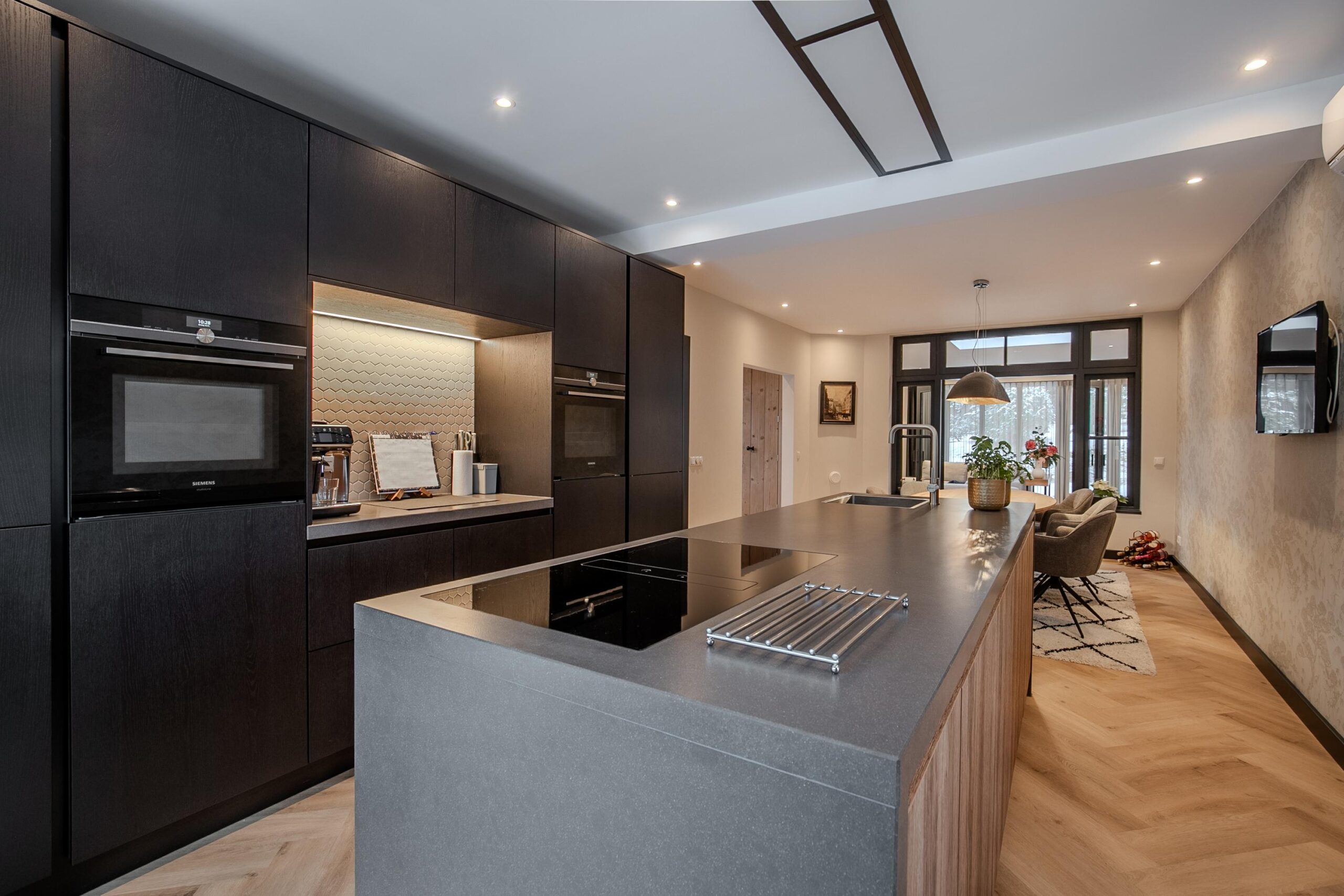 De keuken is zonder twijfel een echte eyecatcher. Op maat gemaakt en perfect passend bij de stijl van de woning vormt deze het hart van het dagelijks leven. Er is royaal plaats voor een grote eettafel, ideaal voor lange diners en gezellige momenten met familie en vrienden. Daarnaast is er een praktische en sfeervolle hoek gecreëerd die uitstekend dienst kan doen als thuiswerkplek of kantoorruimte, waardoor wonen en werken hier moeiteloos gecombineerd kunnen worden.