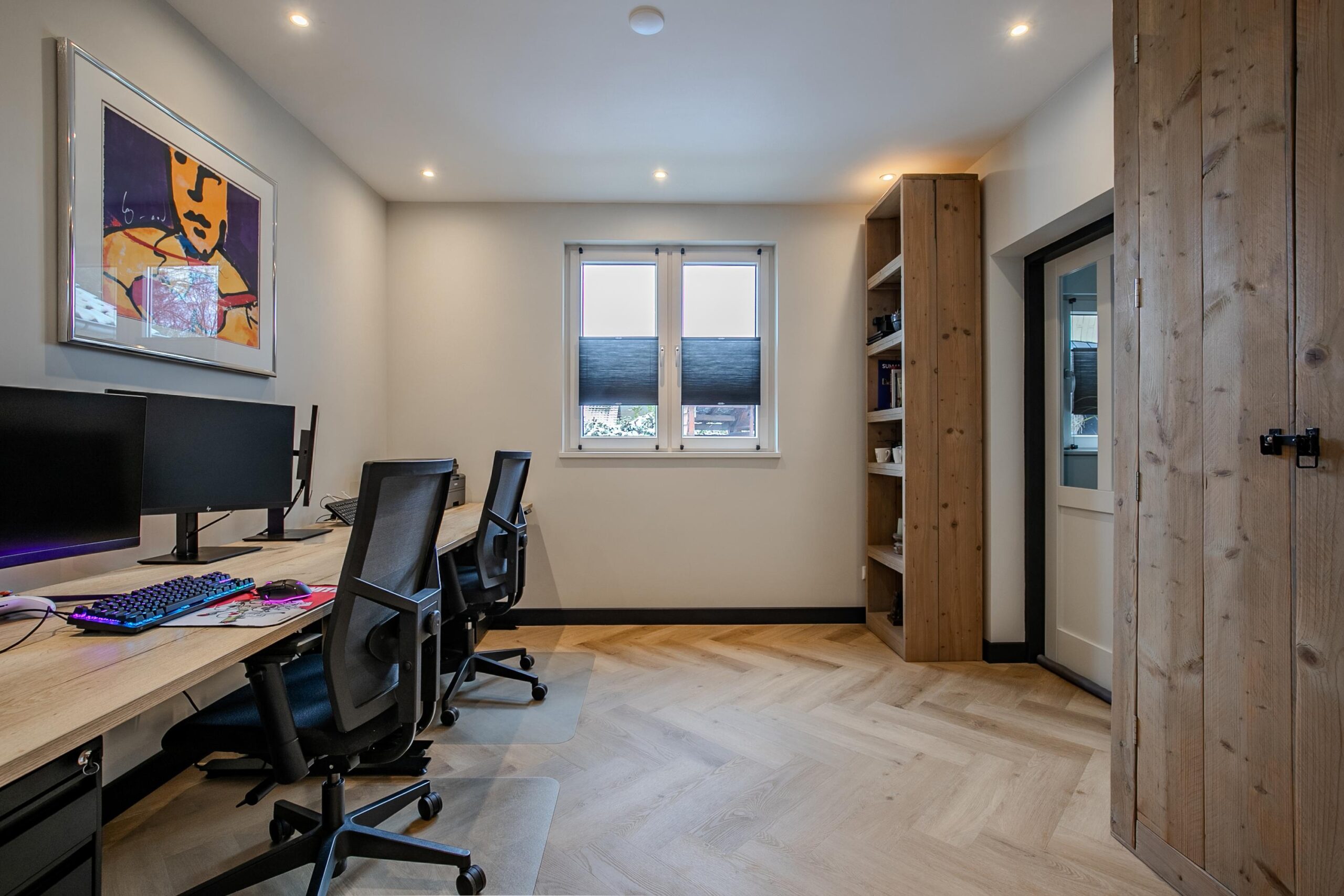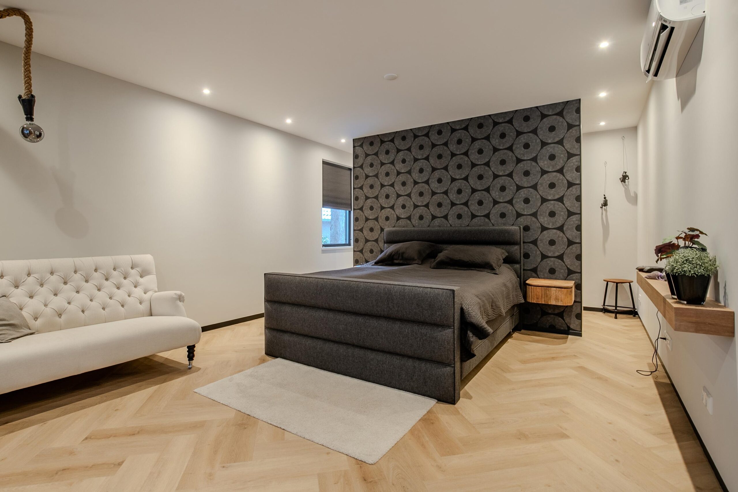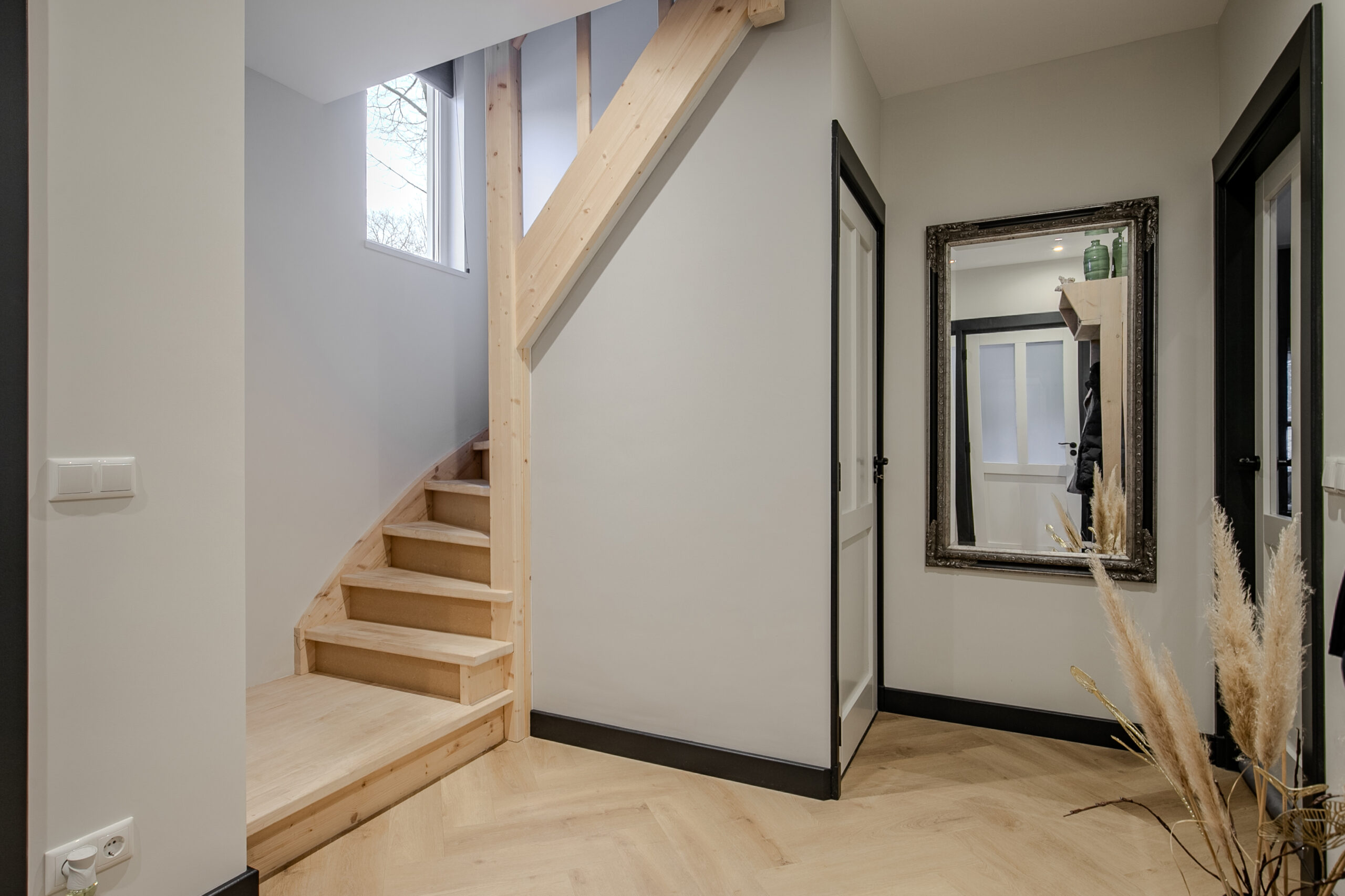 Net als op de begane grond is ook de bovenverdieping afgewerkt met hoogwaardige materialen, wat zorgt voor een rustige, samenhangende en karaktervolle uitstraling door de hele woning. De gehele woning is voorzien van een doorlopende PVC-vloer, wat bijdraagt aan een luxe uitstraling en een mooi, harmonieus geheel vormt tussen de verschillende ruimtes.