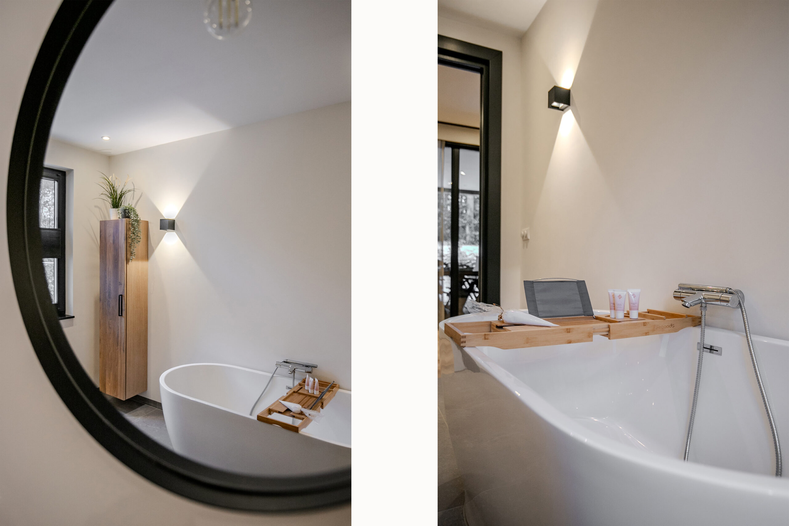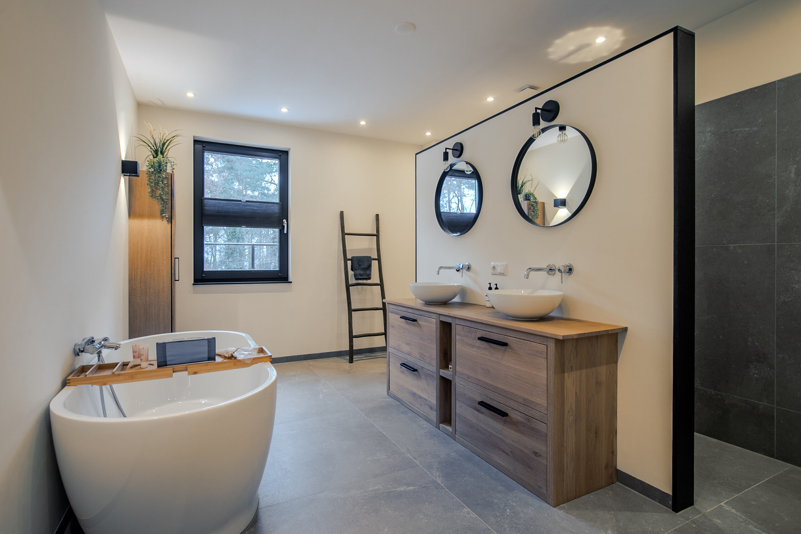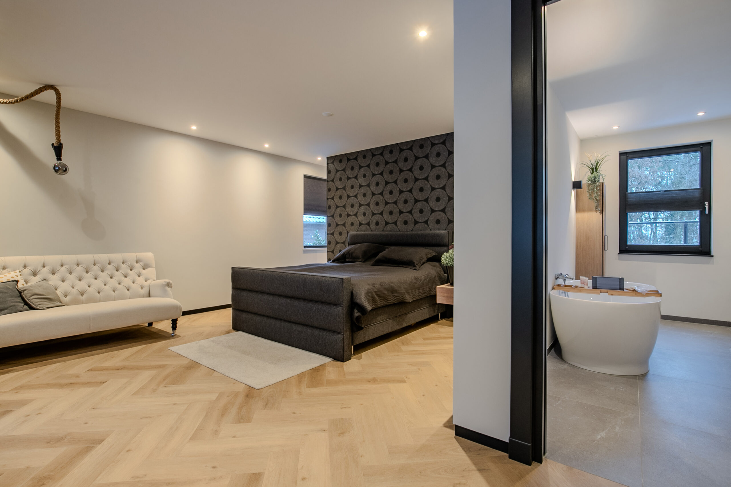 De badkamer ensuite is uitgevoerd in dezelfde hoogwaardige stijl als de rest van de woning en biedt een luxe wellnessgevoel. Deze is voorzien van een royaal ligbad, een ruime inloopdouche, een toilet en een dubbele wastafel.