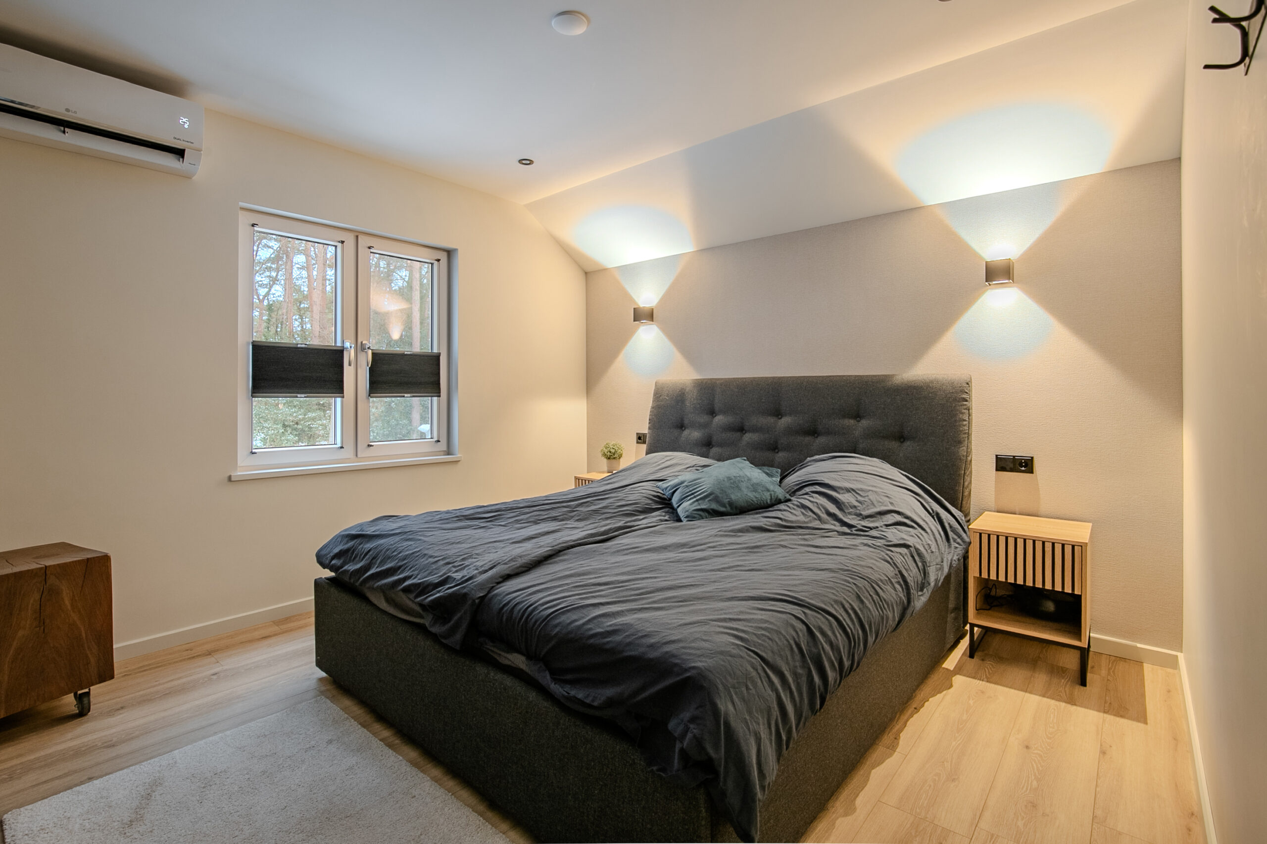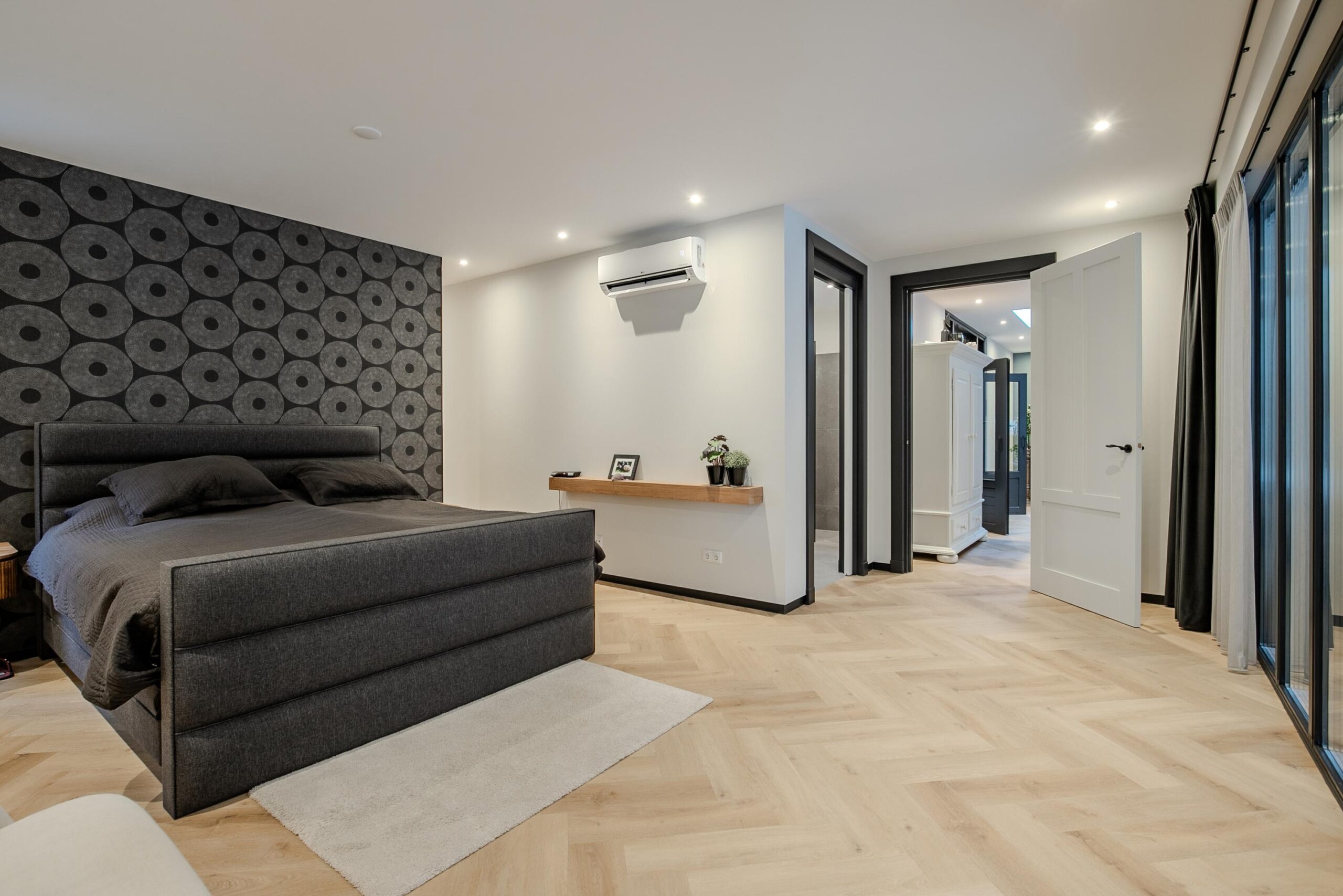 Vanuit de woonkamer loopt u door naar de slaapkamer op de begane grond, met aangrenzend de badkamer. De slaapkamer is zeer ruim opgezet en beschikt over een slimme inloopkast achter het bed, waardoor opbergruimte uit het zicht blijft en de ruimte altijd rustig oogt. Grote ramen zorgen voor veel daglicht en bieden een prachtig uitzicht op de achtertuin, die door het volwassen groen bijna aanvoelt als een privébos.
