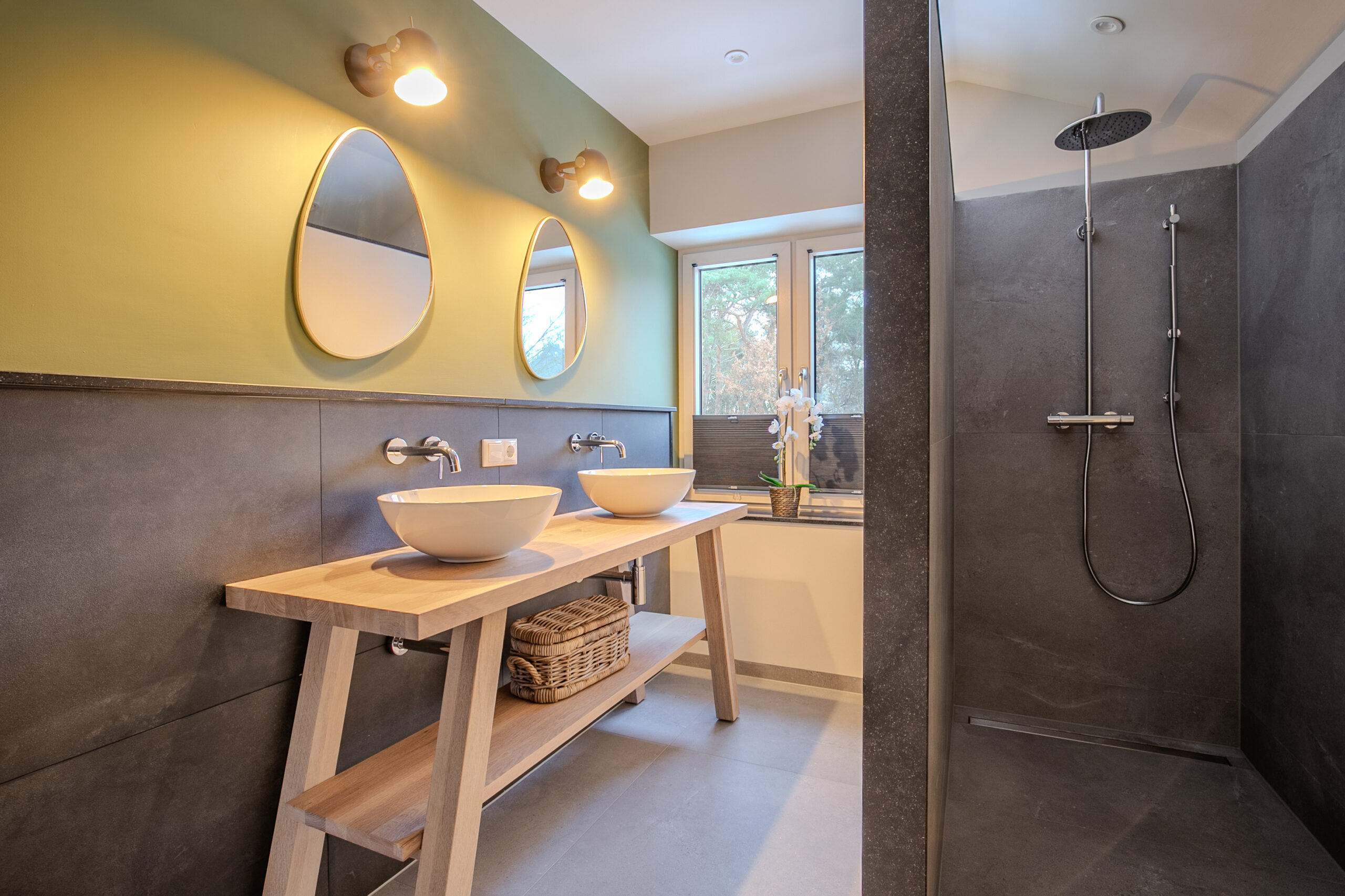 - Badkamervoorzieningen Ligbad, toilet, douche, dubbele wastafel, douche, dubbele wastafel