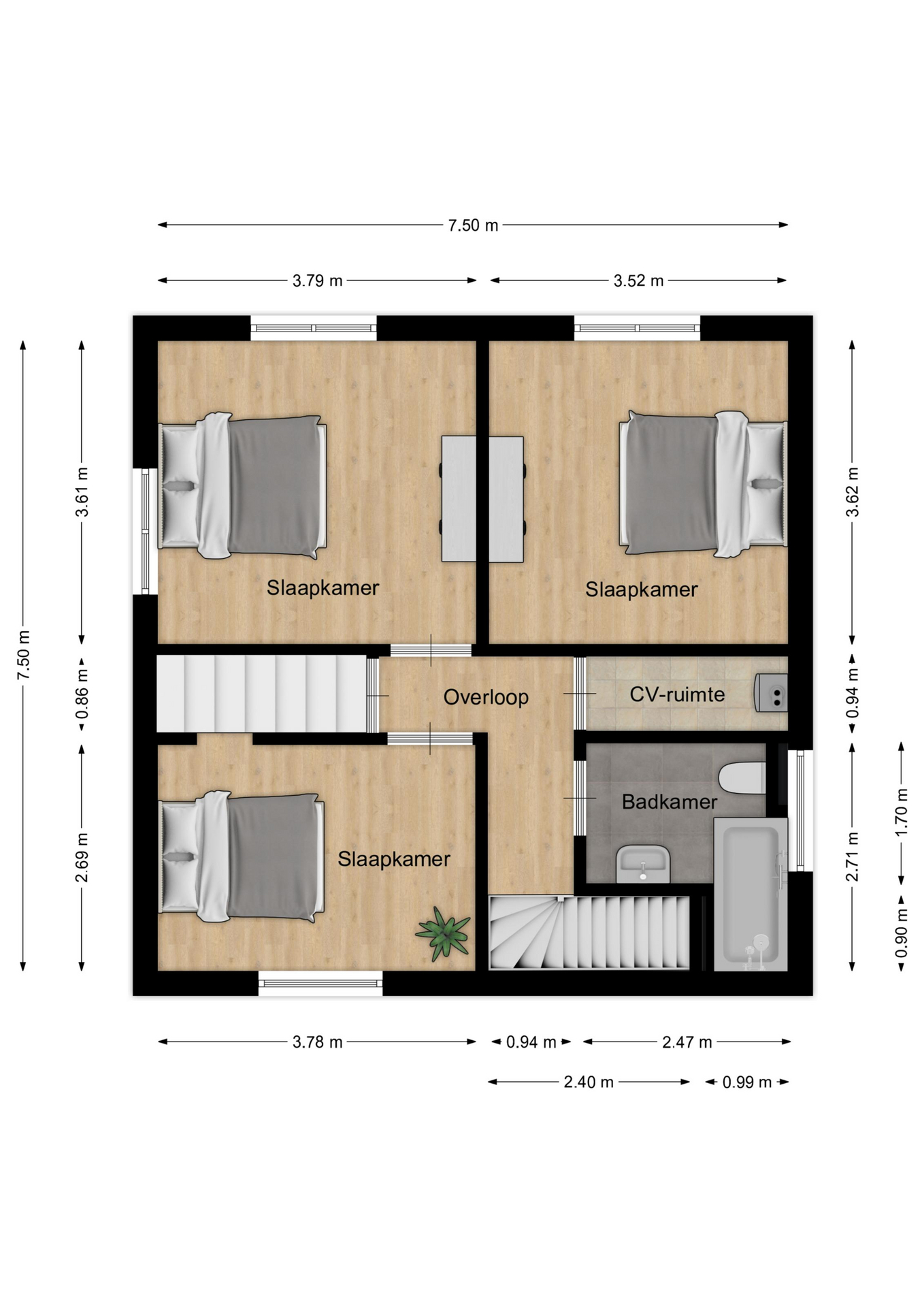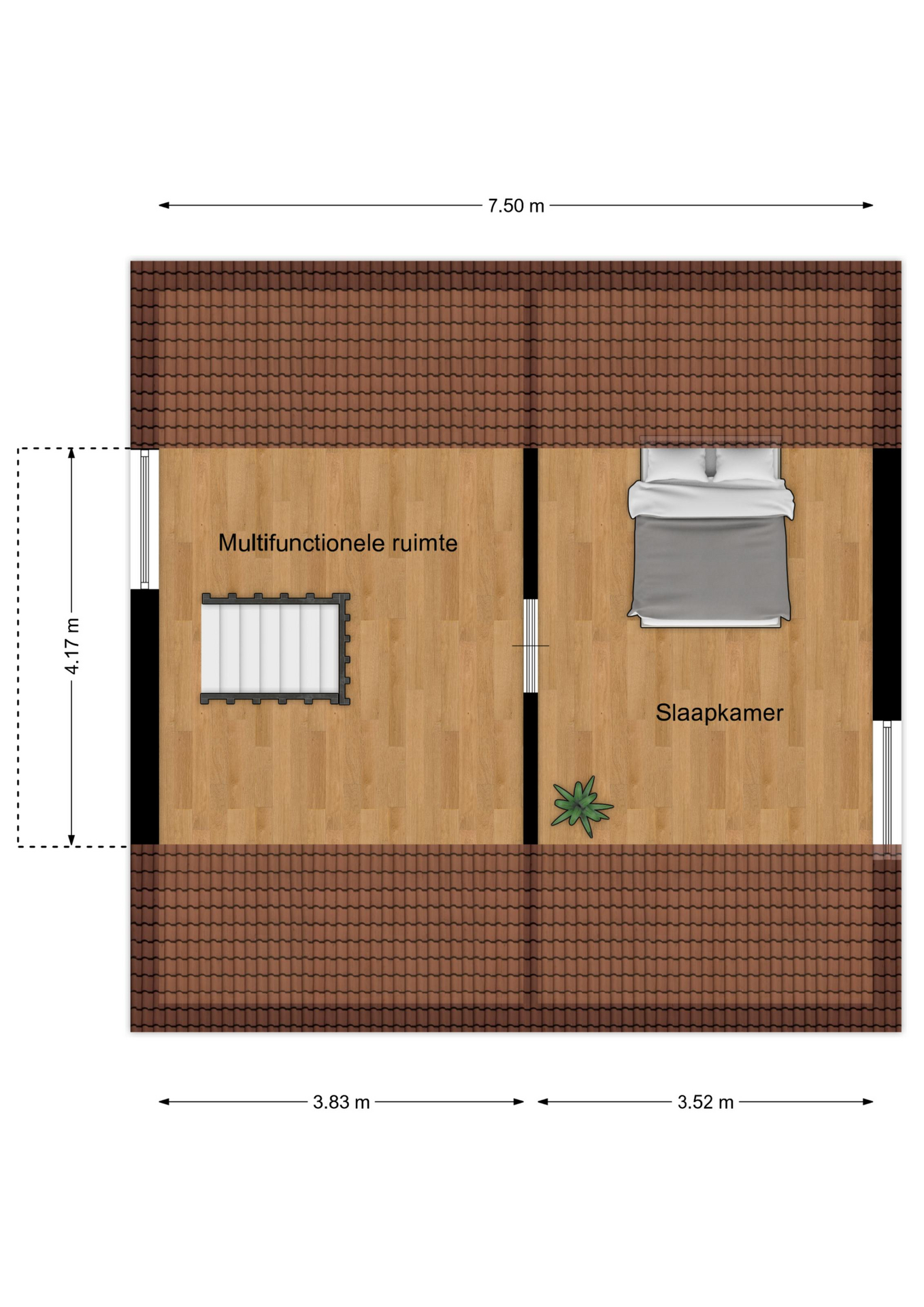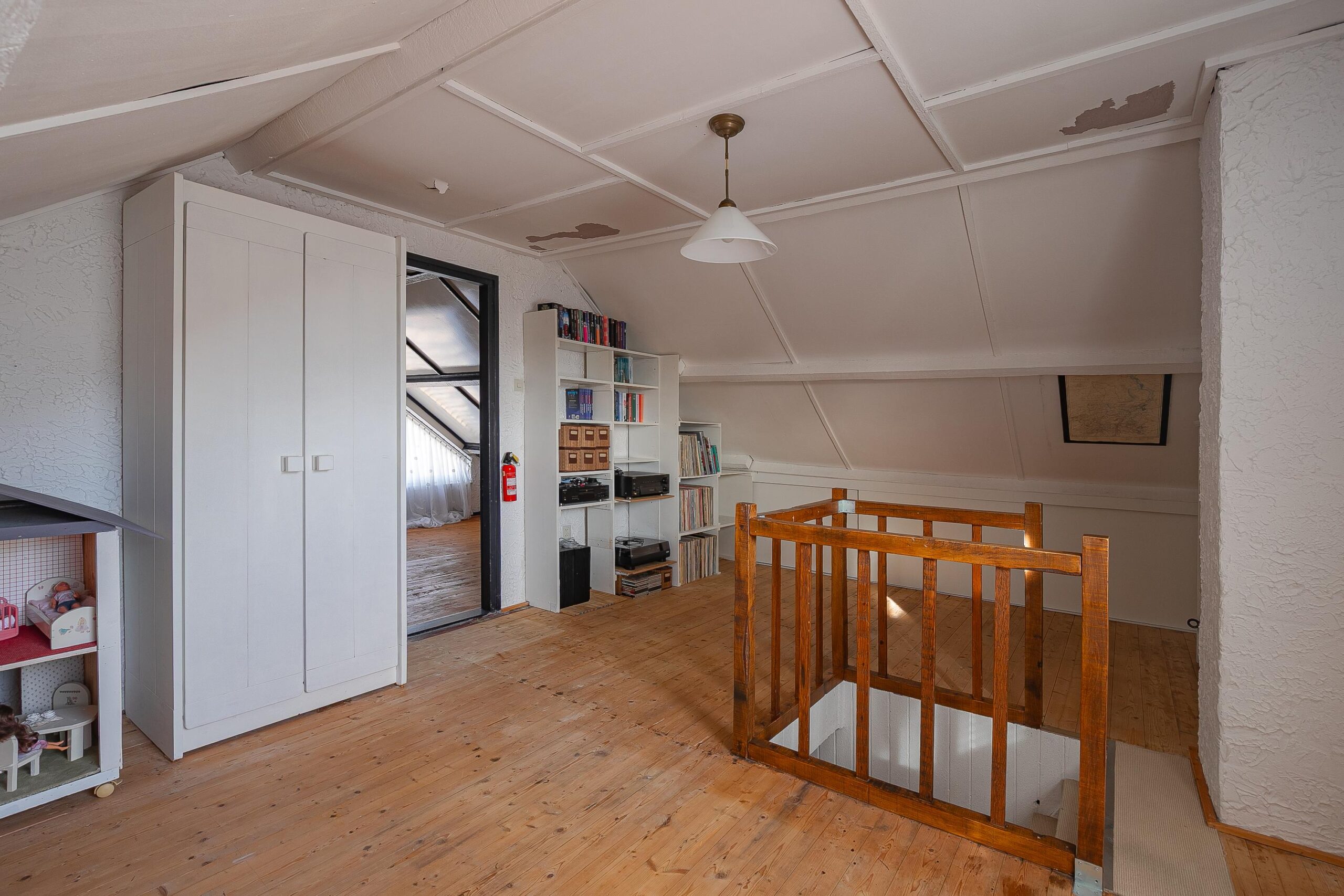 Via een vaste trap bereikbare zolder (ca. 2.27m nokhoogte). Hier is een ruime overloop / multifunctionele ruimte en de vierde slaapkamer (vloeroppervlakte ca. 26 m²).