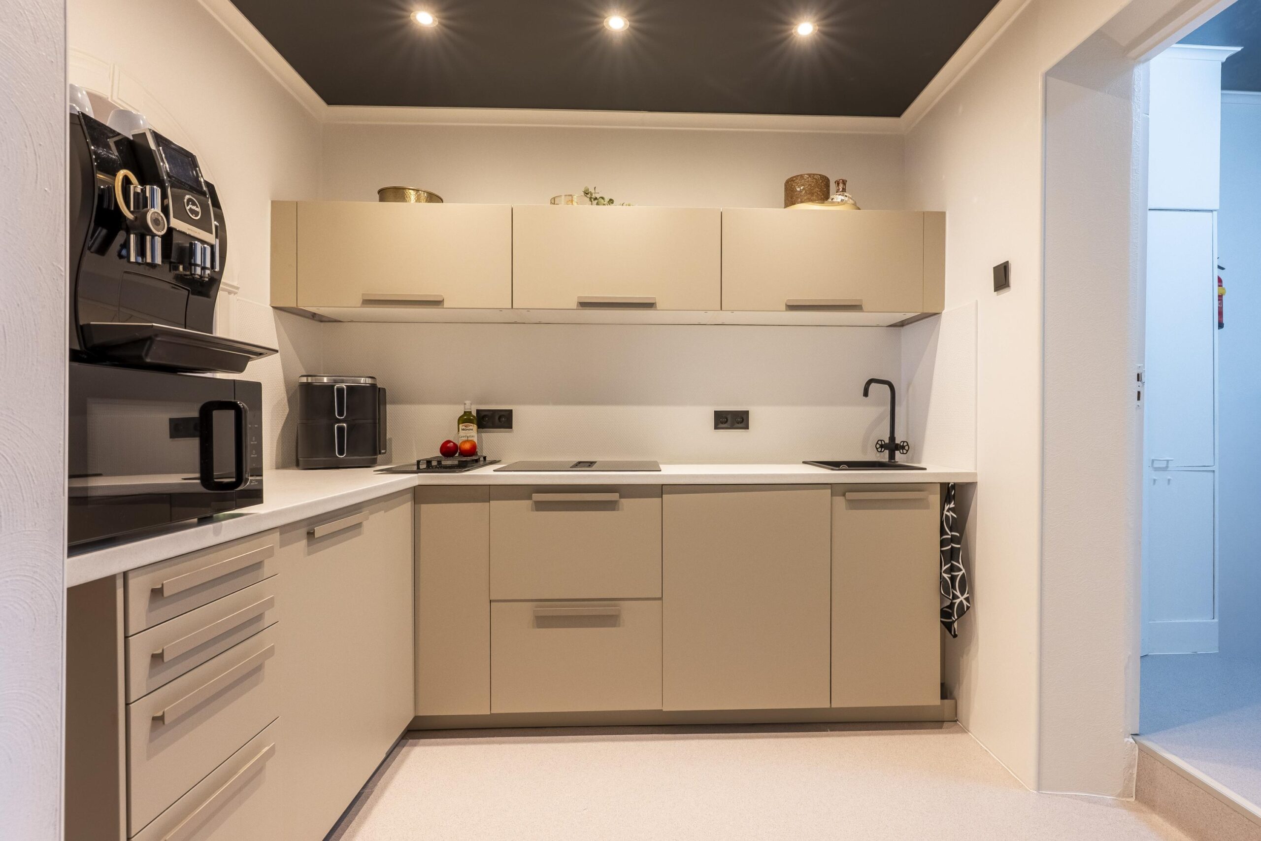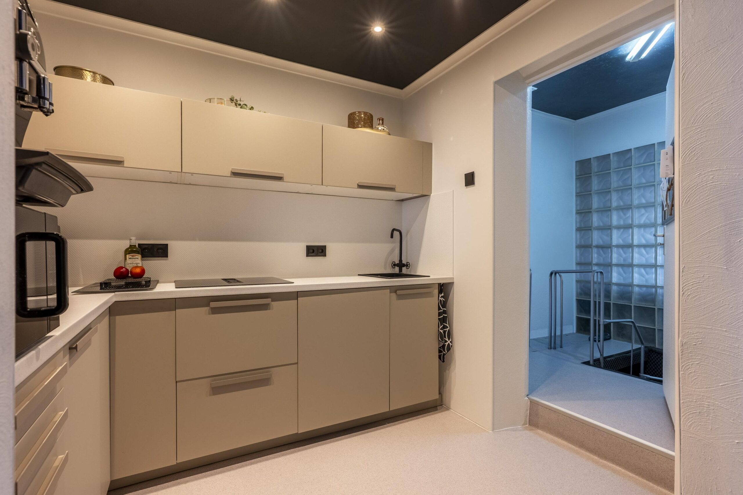 De open keuken is voorzien van een L-vormige keukenopstelling met de navolgende apparatuur: inductiekookplaat met geïntegreerde afzuiging, vaatwasser en spoelbak.